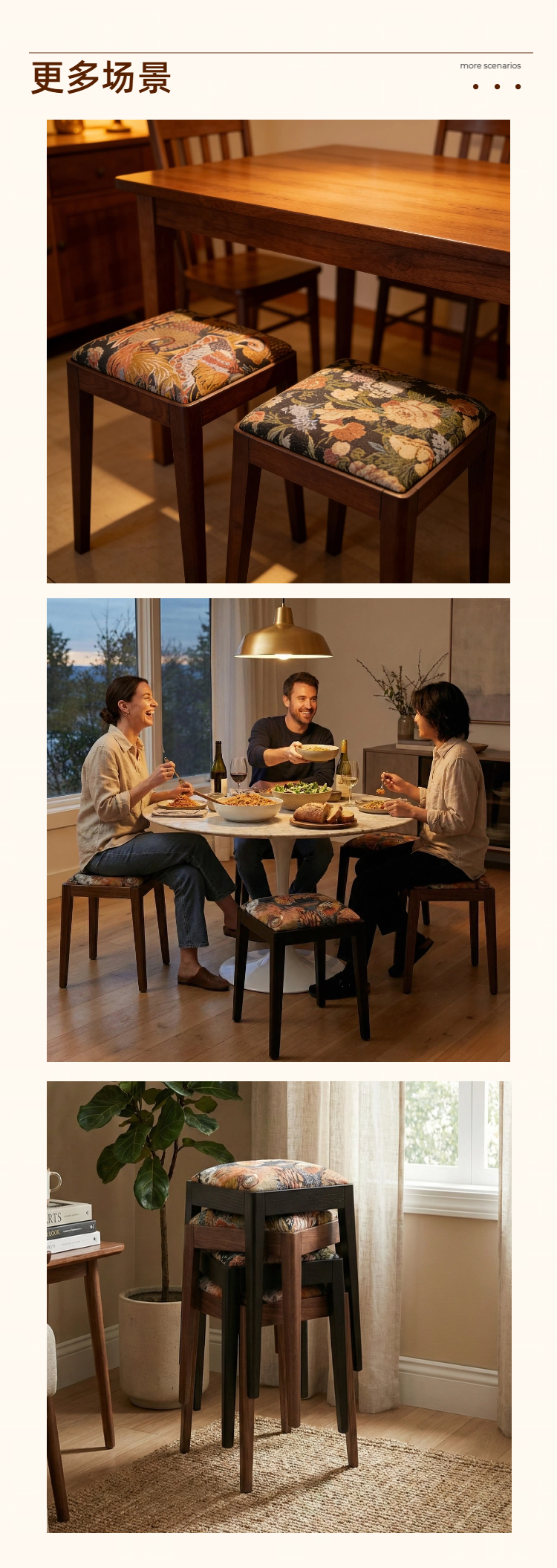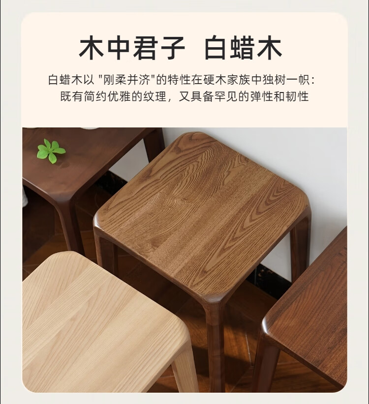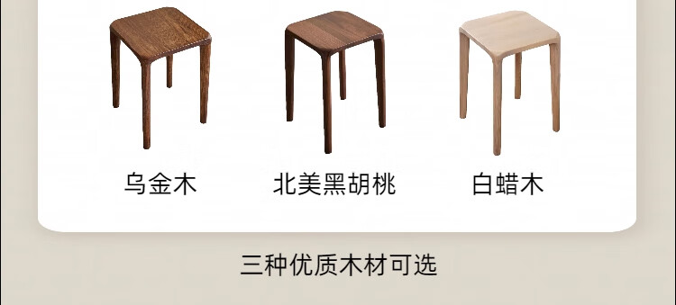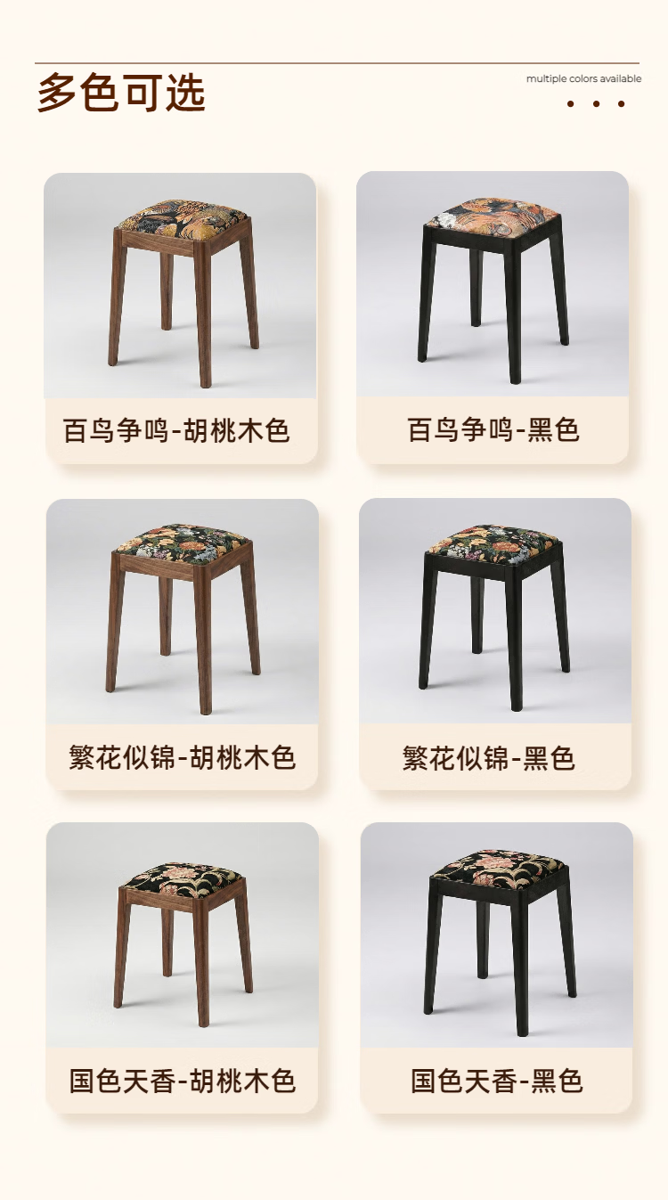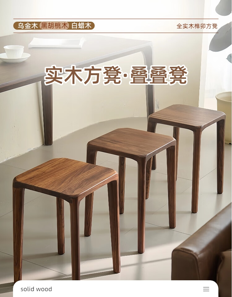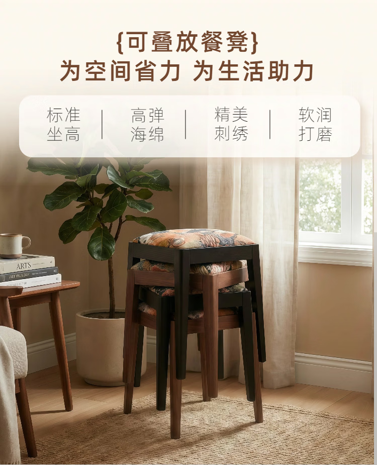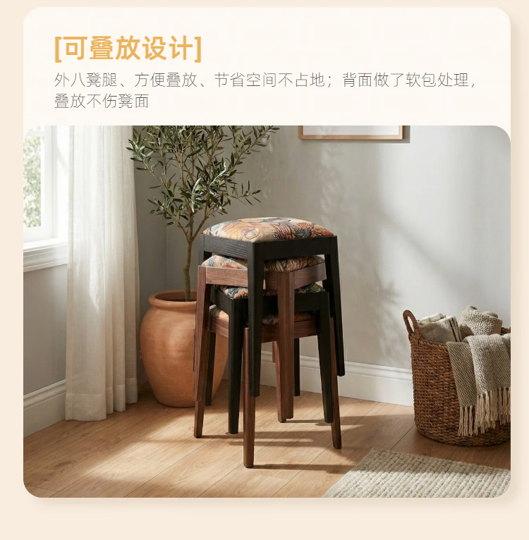 座之美实木可叠放凳子乌金木白蜡木家用加厚结实凳子软包凳45cm坐高叠凳 【软包方凳】白蜡木-黑色 | 百鸟争鸣
