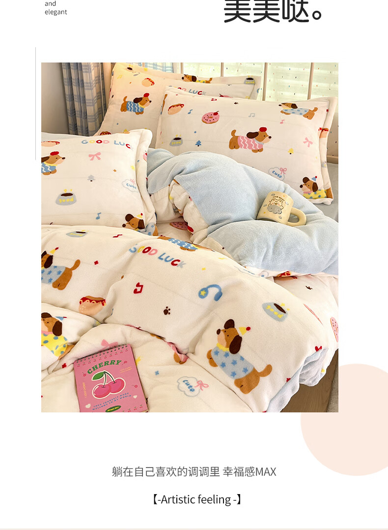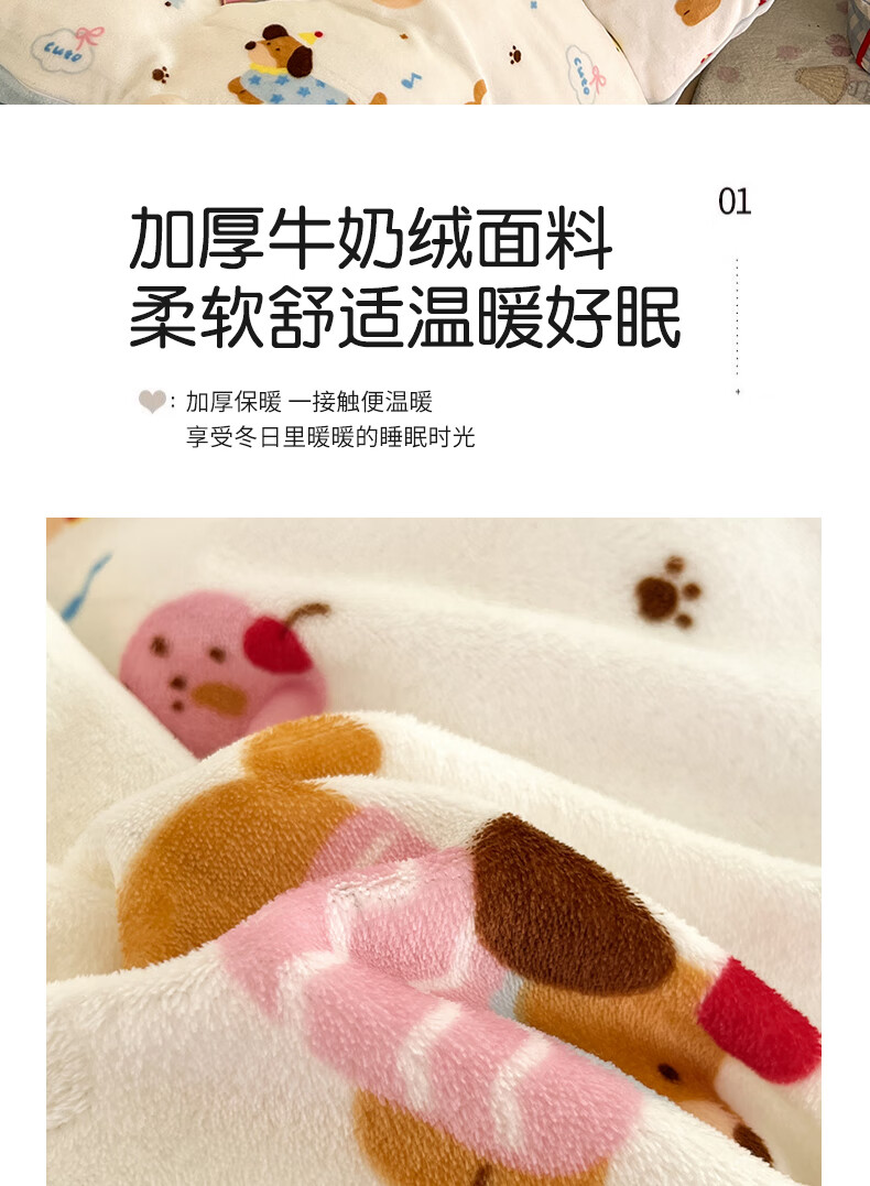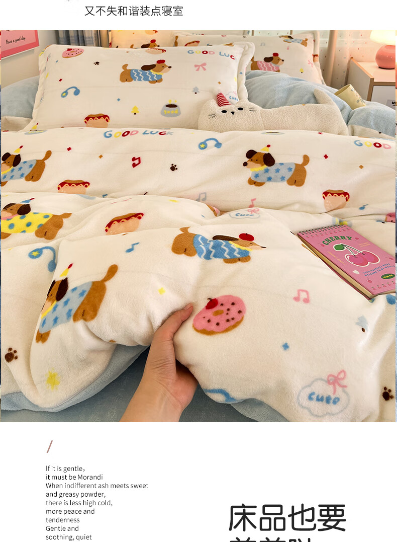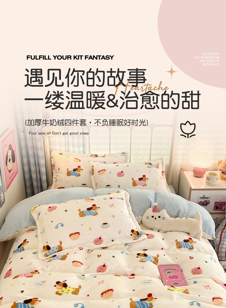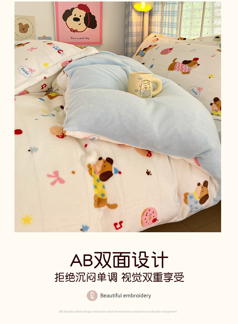 猫人(MiiOW)卡通牛奶绒床上四件套 珊瑚绒冬季加厚被套床单床笠单双人三件套 快乐腊肠蓝 0.9 床单款 三件套(被套150*200cm)