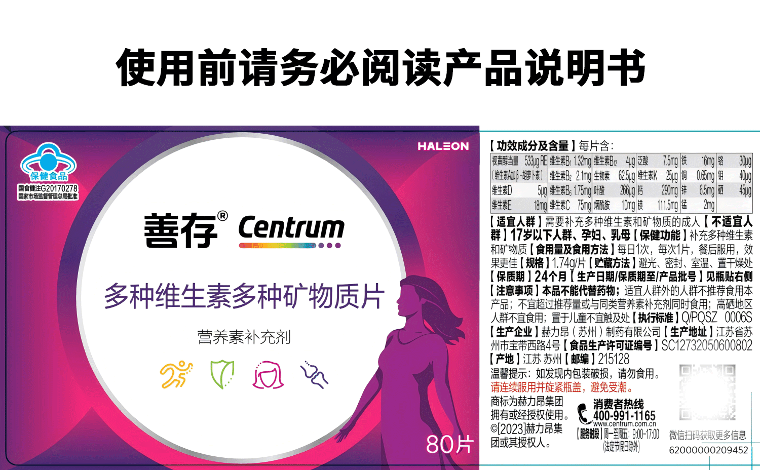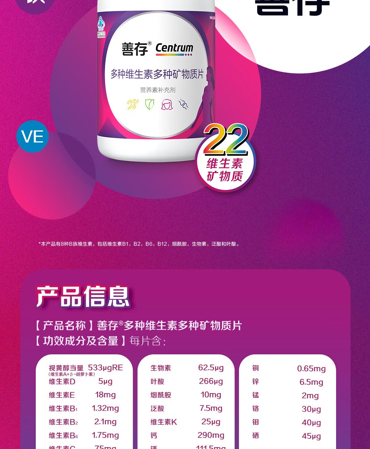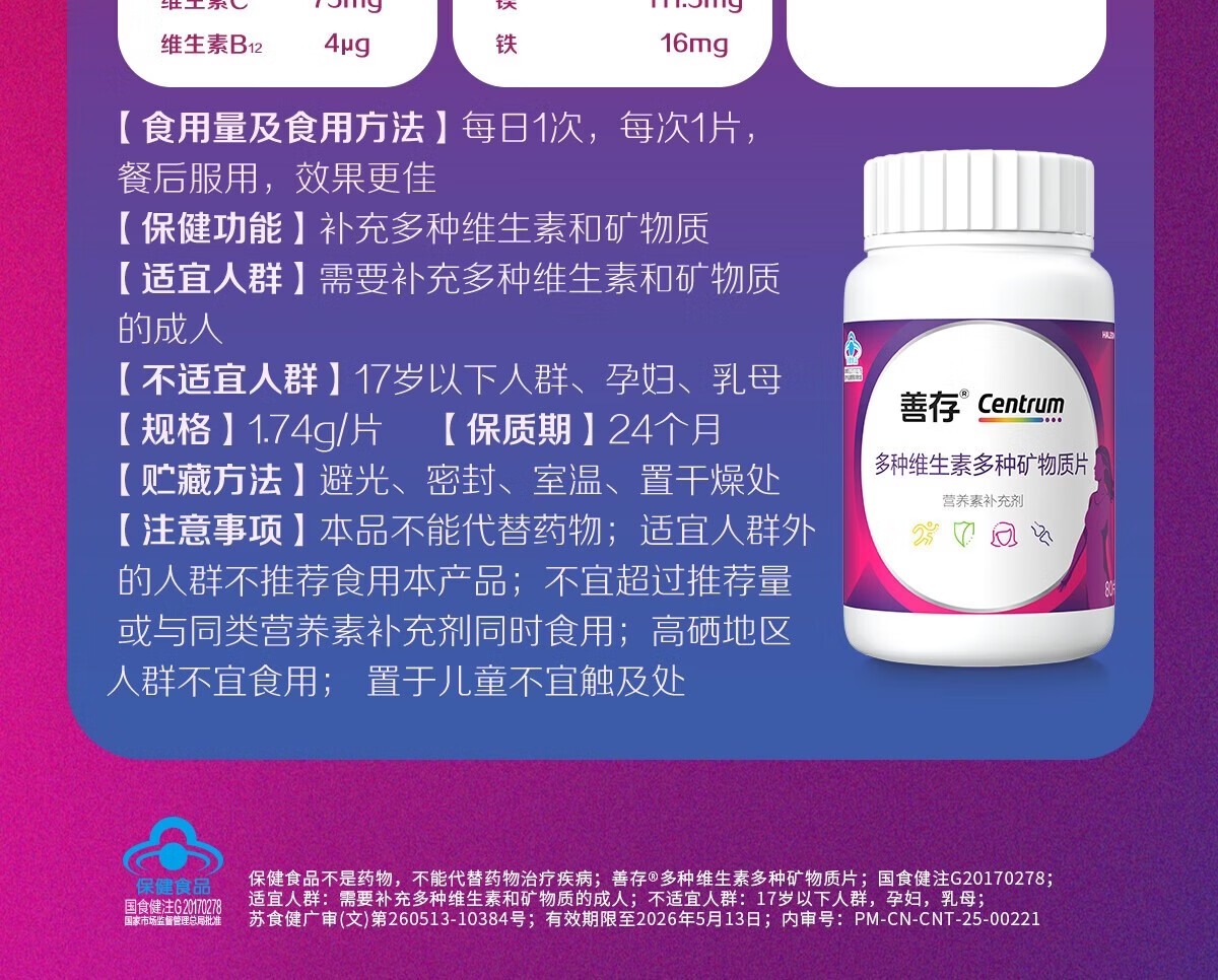 善存女士复合维生素 B族多种VCED烟酰胺叶酸铁钙镁锌B12 80粒*2瓶