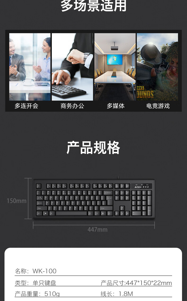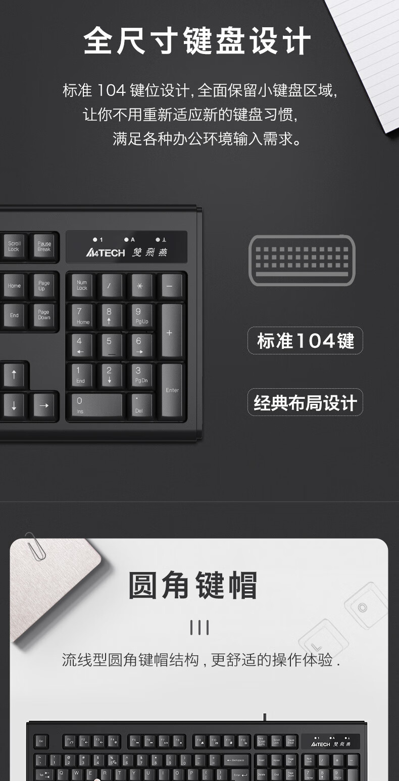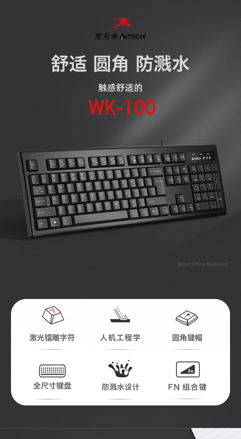 双飞燕(A4TECH) WK-100 有线键盘 办公打字用薄膜键盘笔记本外接台式电脑通用键盘104键 USB接口 黑色