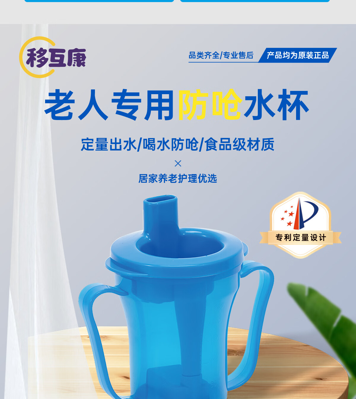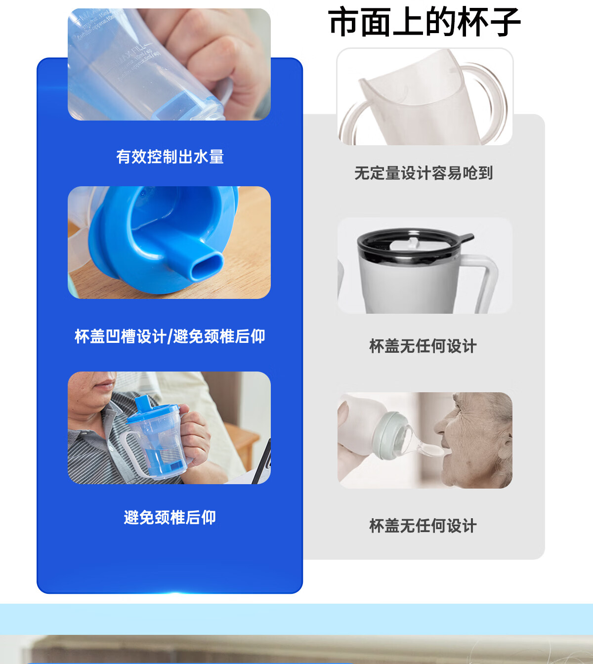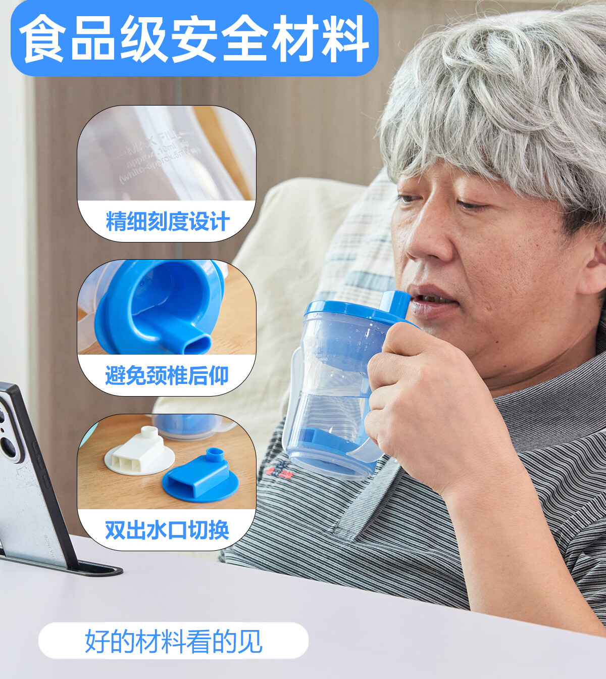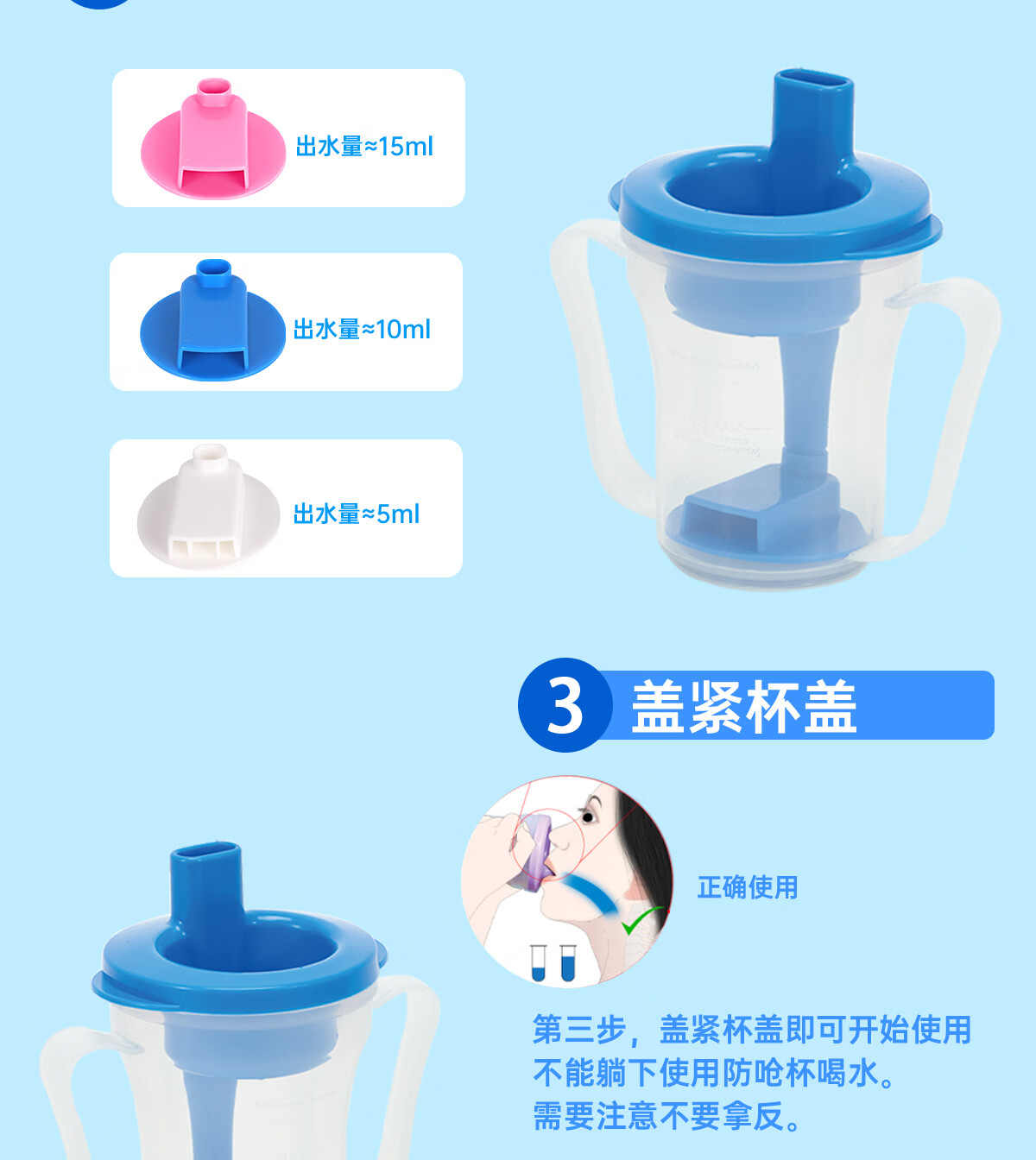 Ehucon移护康 防呛杯 老人病人吞咽障碍水杯躺着喝水杯限量定量水杯 【防呛杯】透明蓝盖+3个入水口