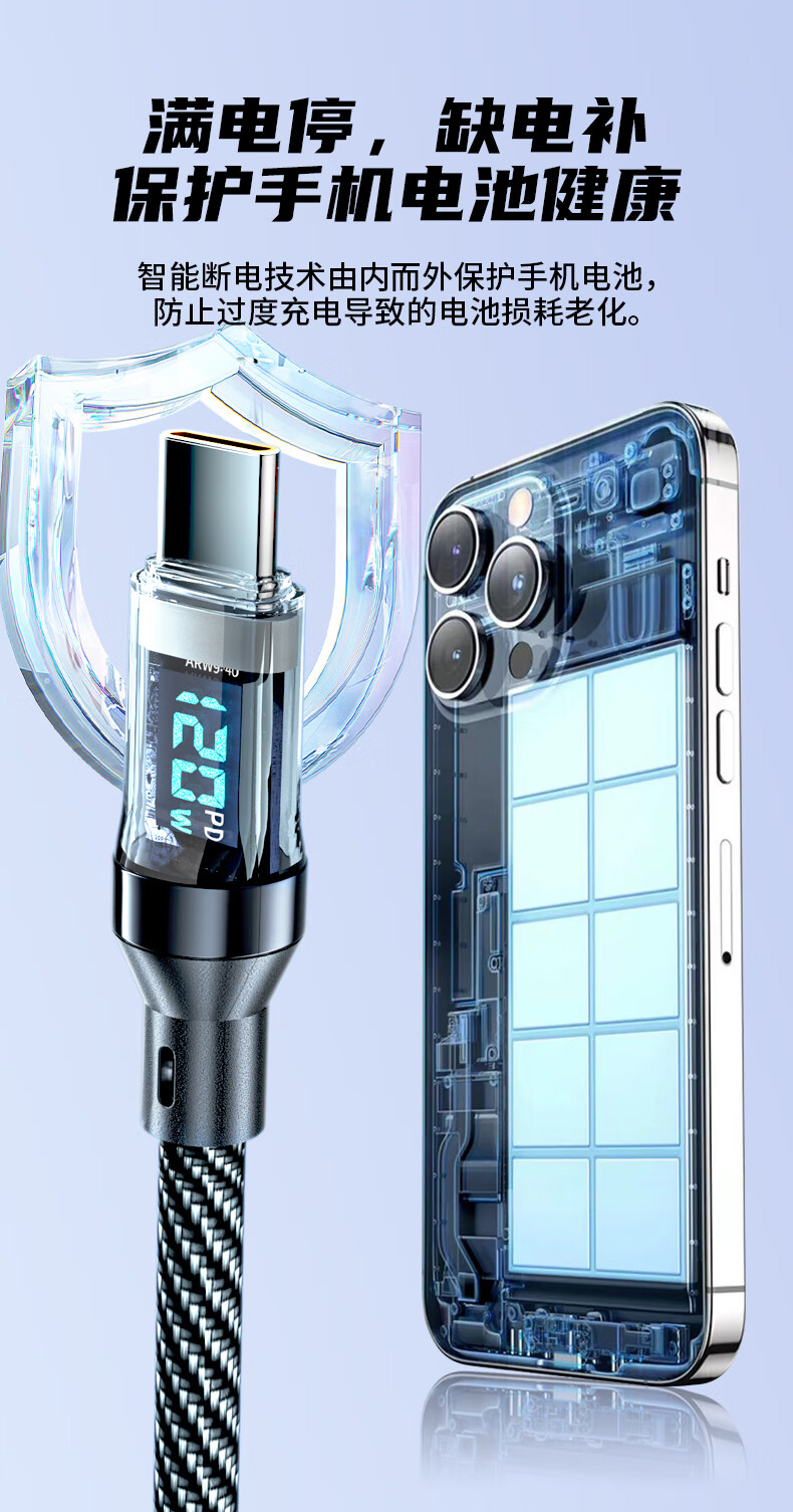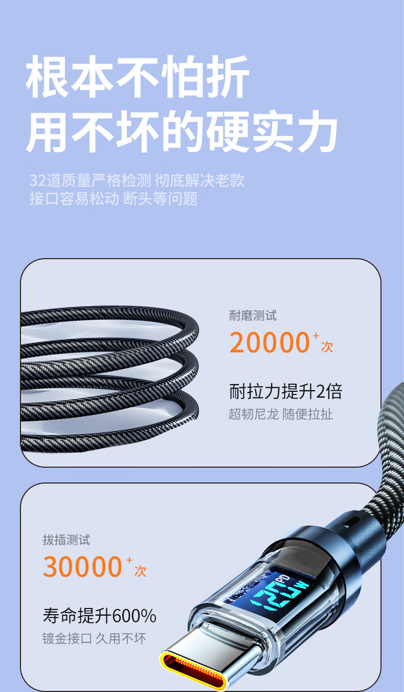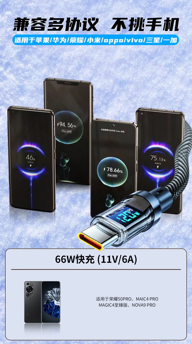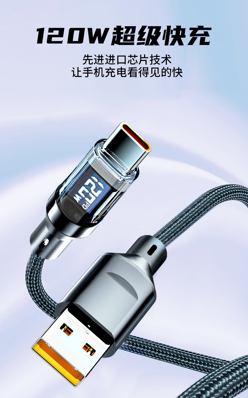 京东快递120W超级快充充电线数据线Type-C智能断电数字显示适用华为荣耀OPPO闪充vivo手机闪充编织 【单线】2米-120W智能数显线