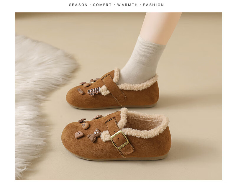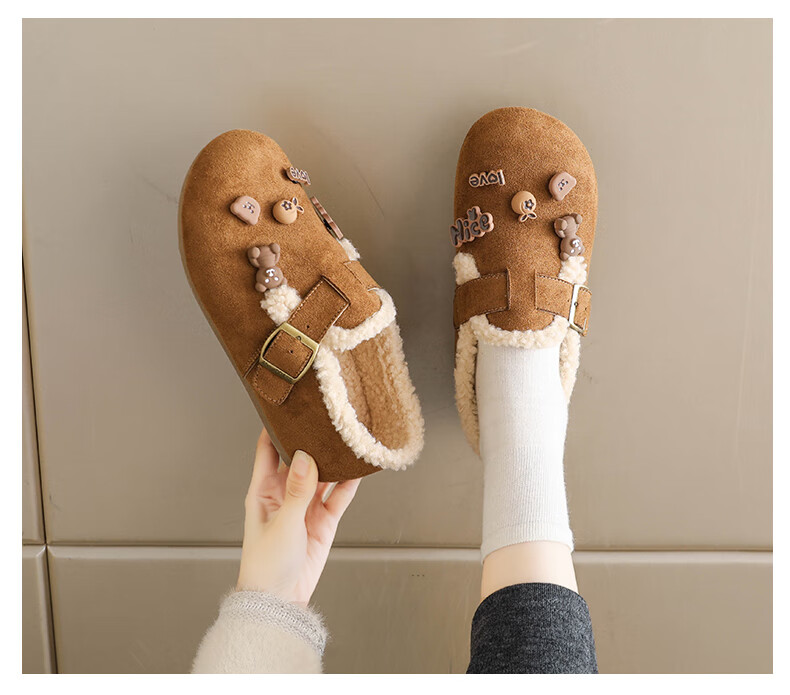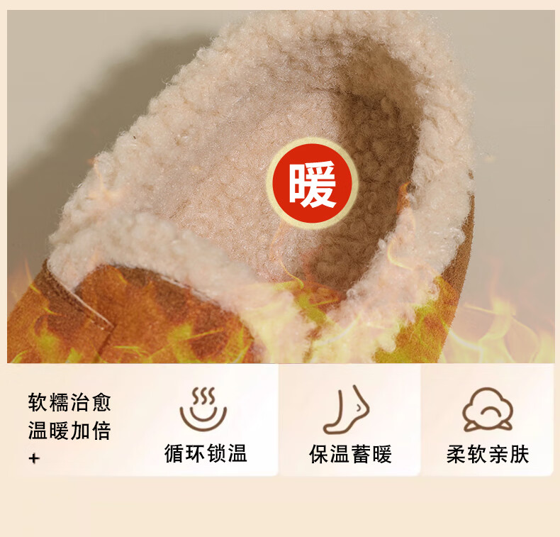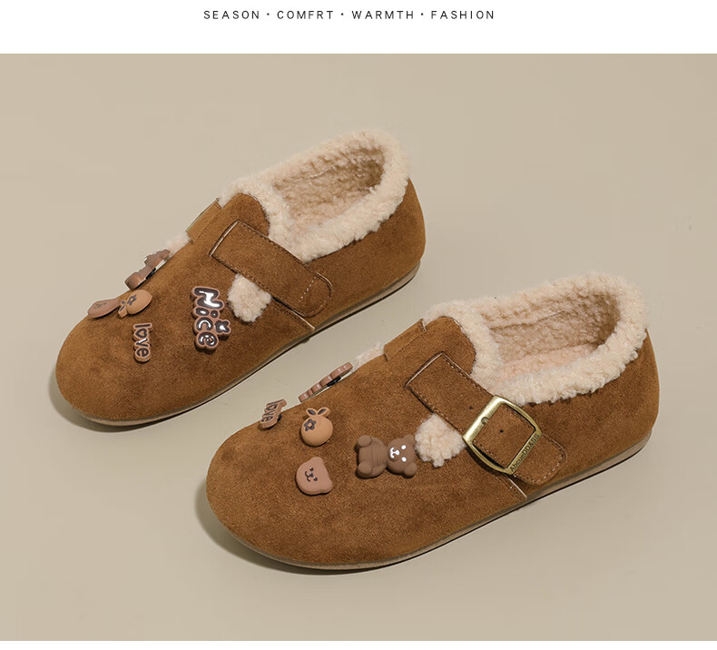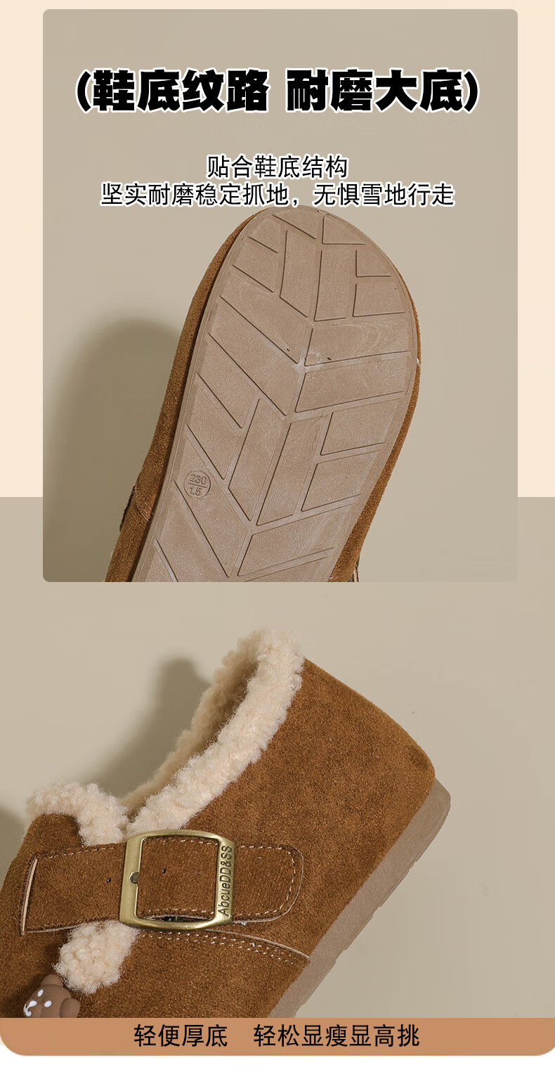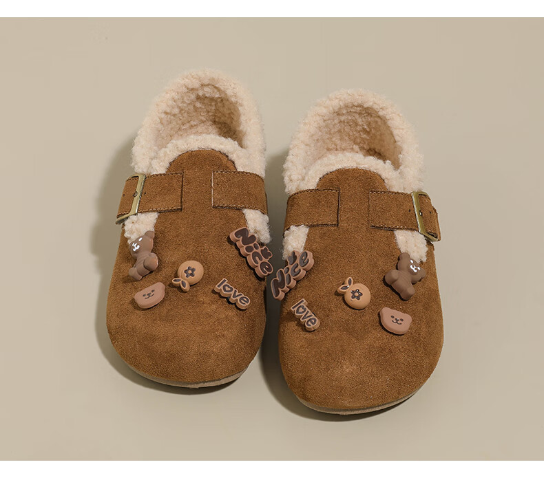 稻草人(MEXICAN)女鞋加绒勃肯鞋2026新款冬季一脚蹬豆豆鞋孕妇保暖棉鞋雪地靴34码 驼色【3.0cm软底】 34