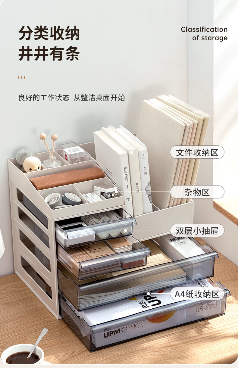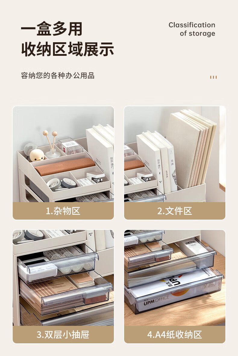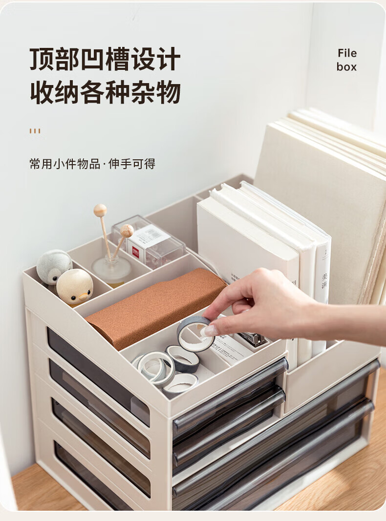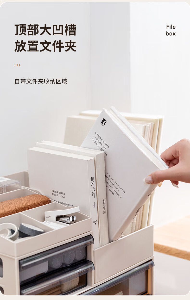 BABY VIEW桌面收纳盒抽屉式学生书桌斜插式笔筒办公室工位神器文具整理盒 米色【升级款多功能文件收纳】