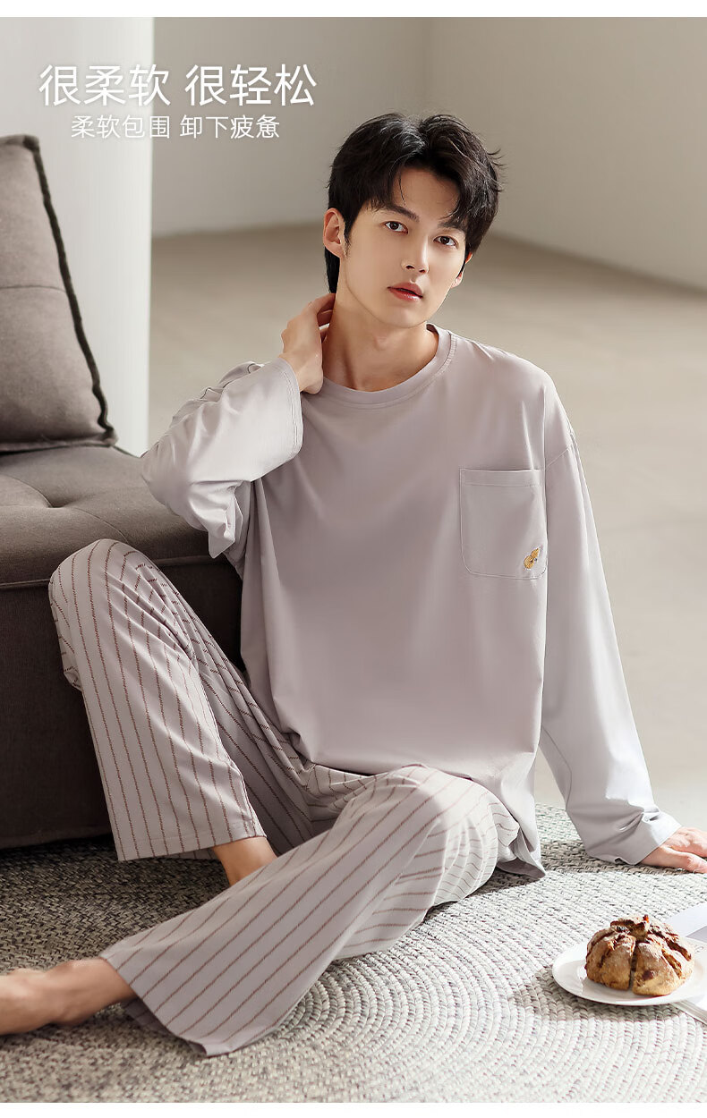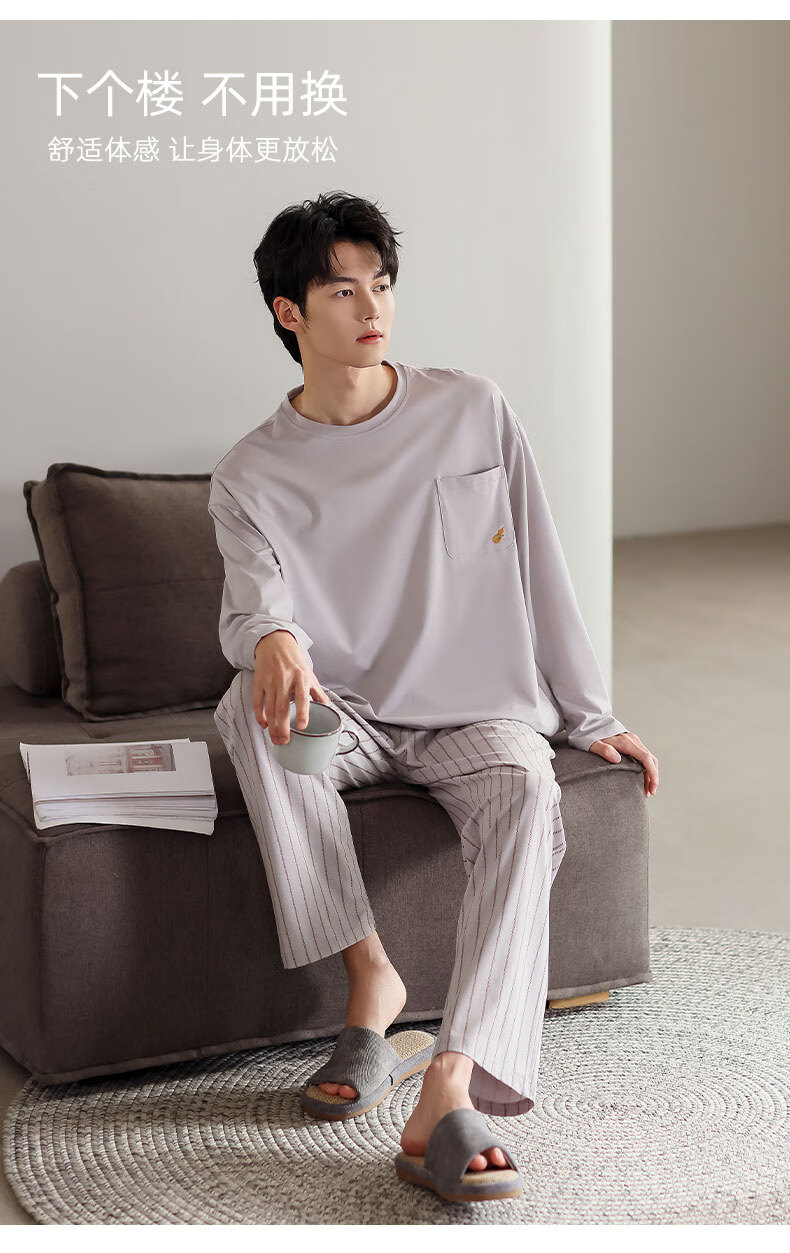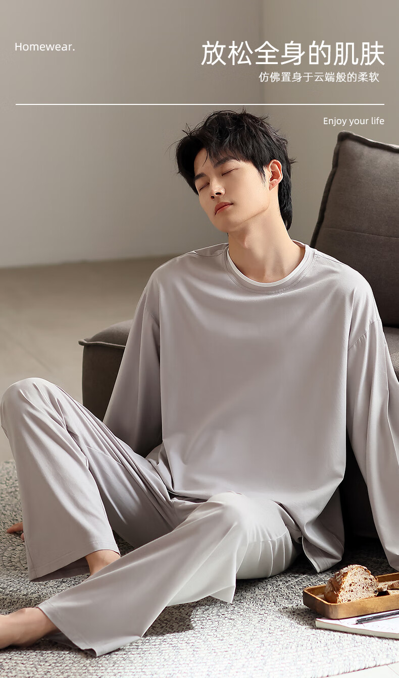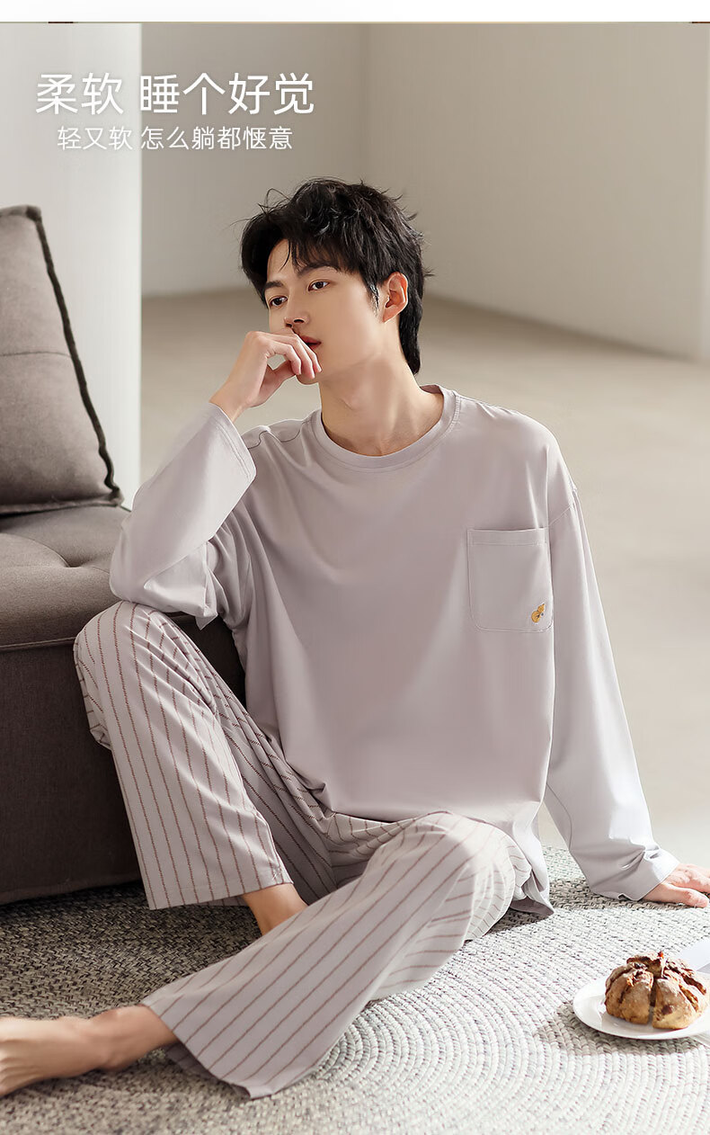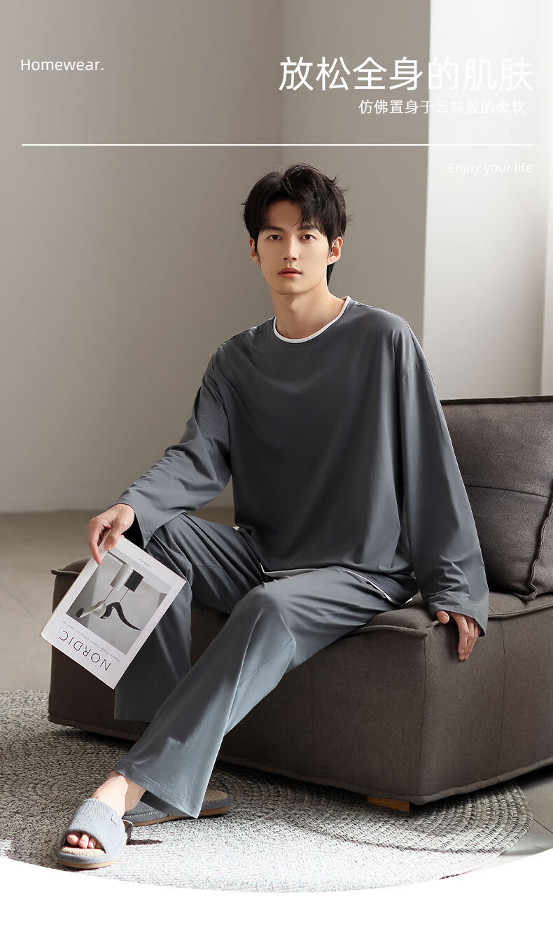 洁丽雅睡衣男士秋季薄款男生莫代尔凉长袖青少年大码舒适睡裤家居服套装 【长袖长裤】深灰色套头套装 L 【建议100-130斤】