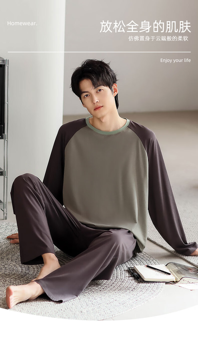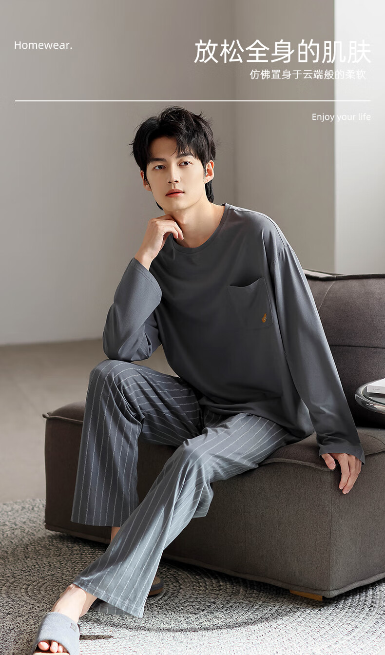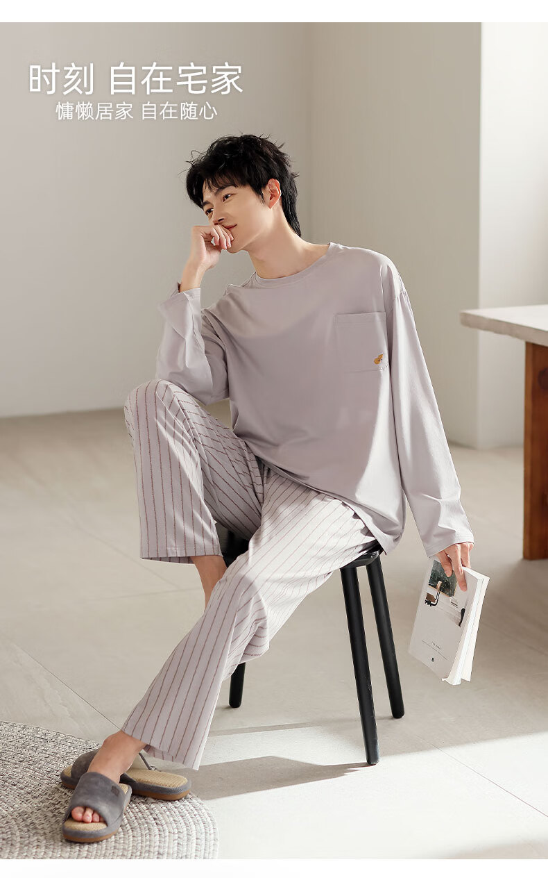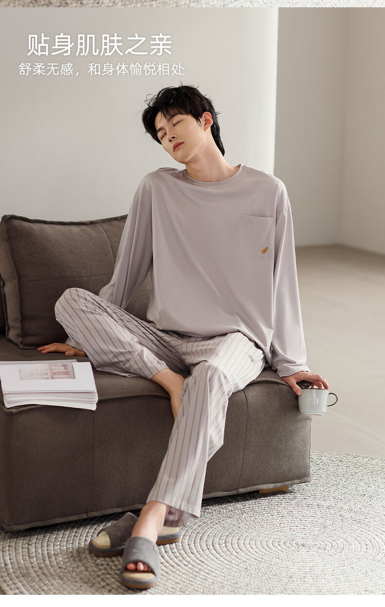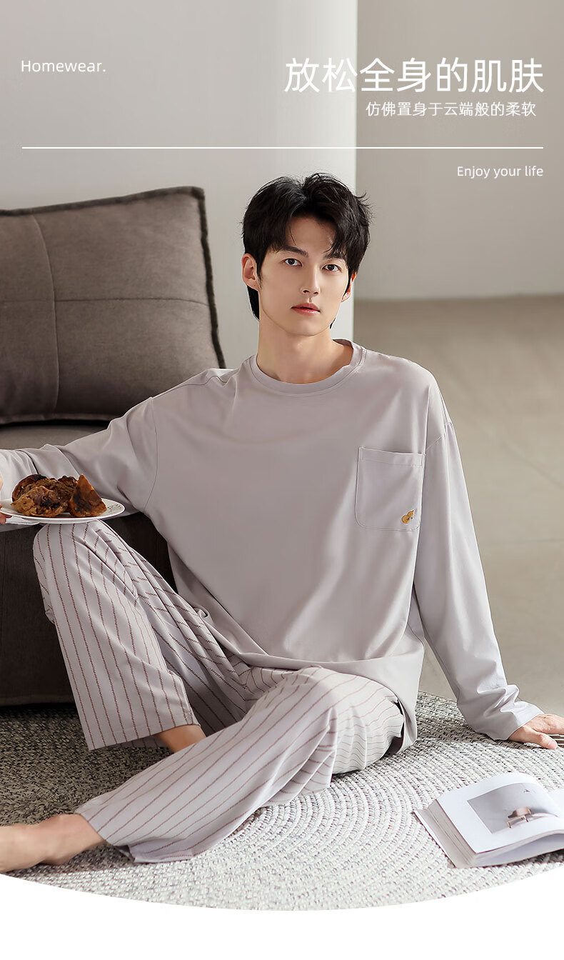 洁丽雅睡衣男士秋季薄款男生莫代尔凉长袖青少年大码舒适睡裤家居服套装 【长袖长裤】深灰色套头套装 L 【建议100-130斤】