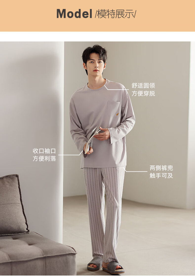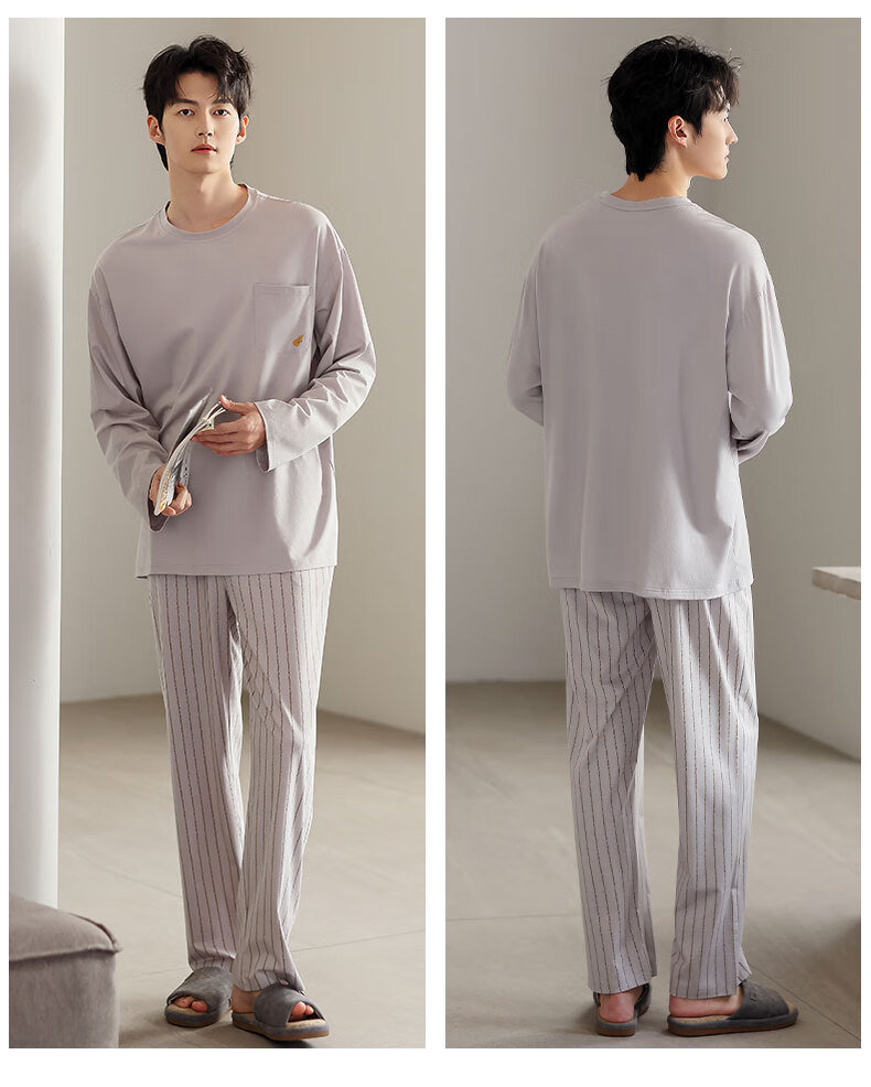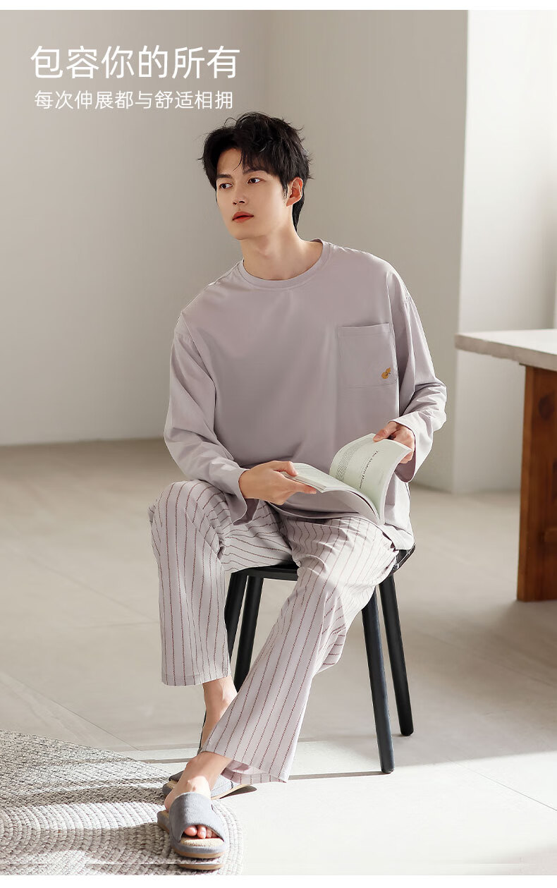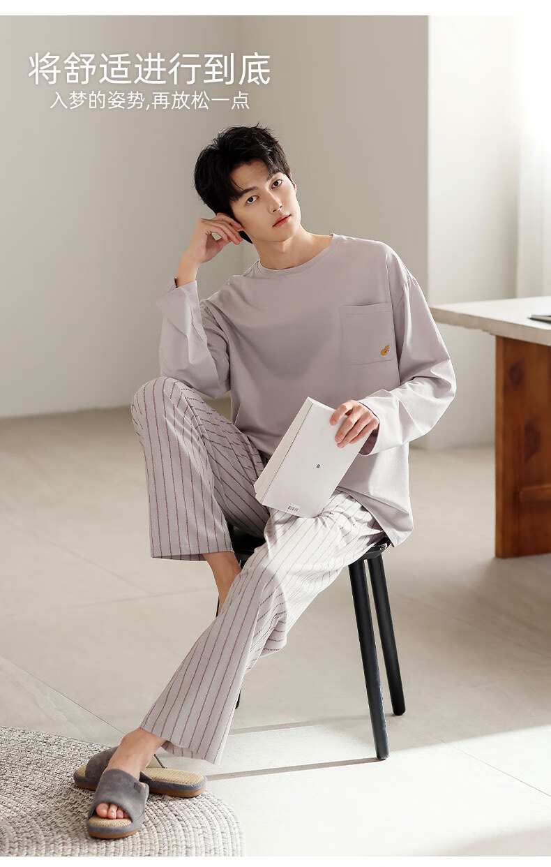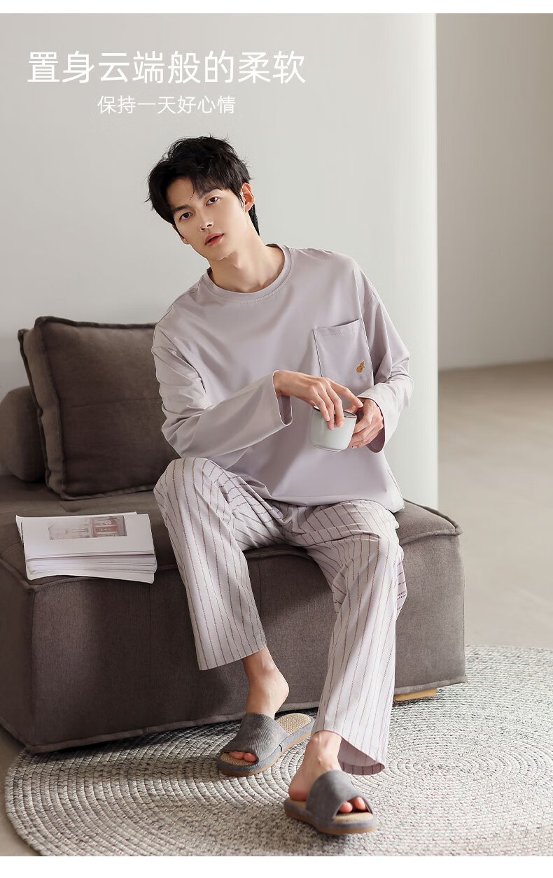 洁丽雅睡衣男士秋季薄款男生莫代尔凉长袖青少年大码舒适睡裤家居服套装 【长袖长裤】深灰色套头套装 L 【建议100-130斤】