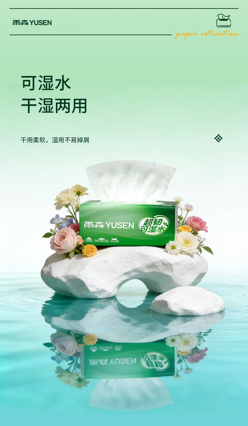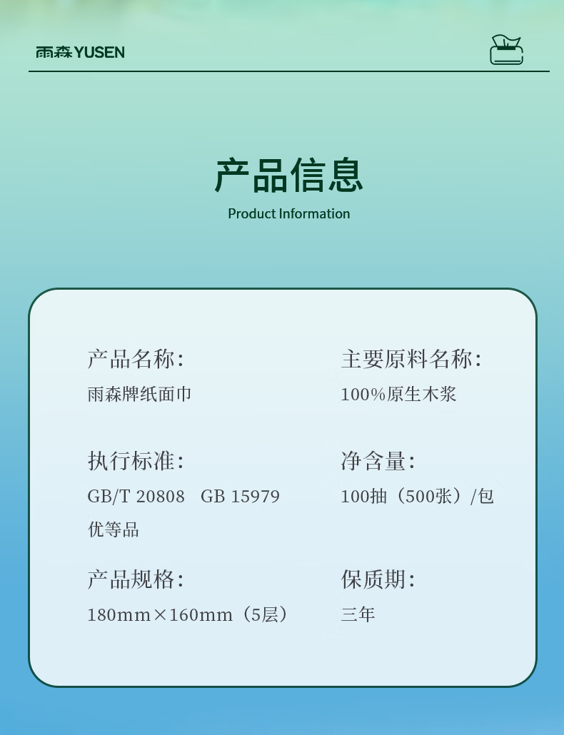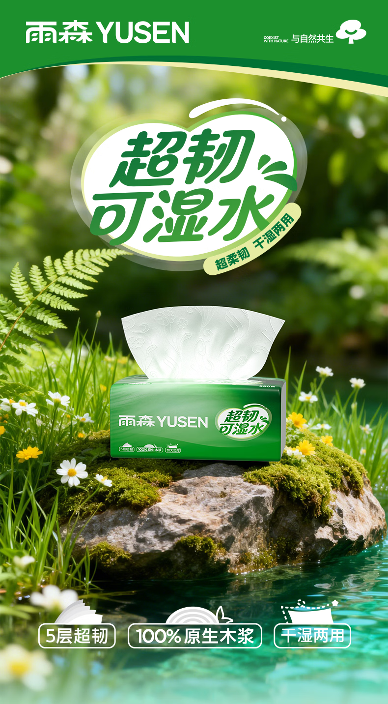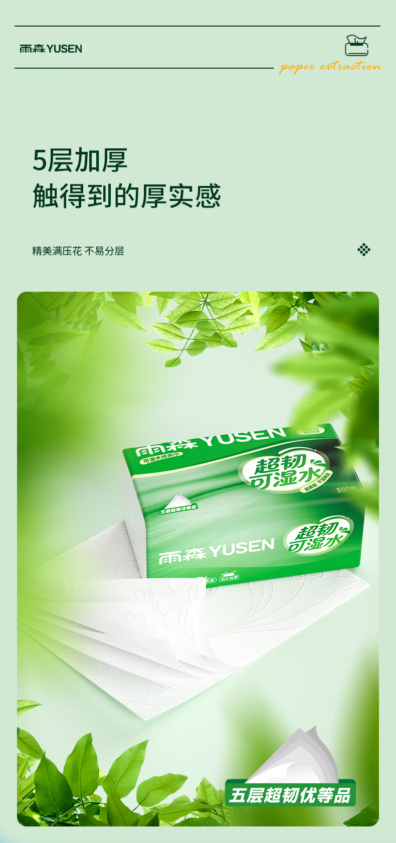 雨森超韧可湿水抽纸5层加厚家用抽纸餐巾纸100%原生木浆无荧光剂 5层 100抽*5包 【新品】