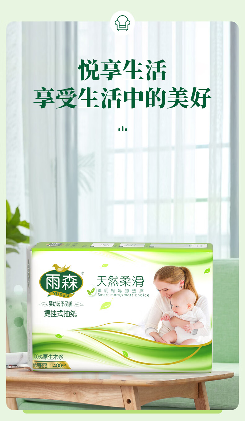 雨森(YUSEN)妇婴悬挂式抽纸1400张面巾纸餐巾纸大包下拉抽纸厕纸卫生纸 5层 1400张*4提 【悬挂式】