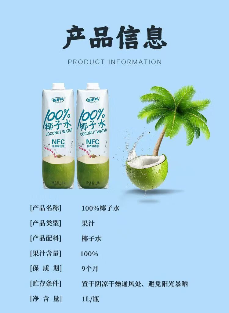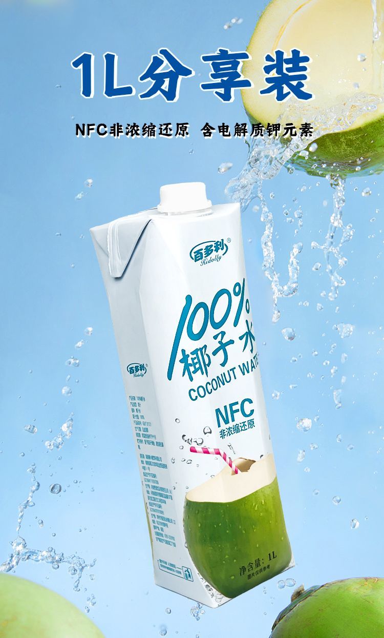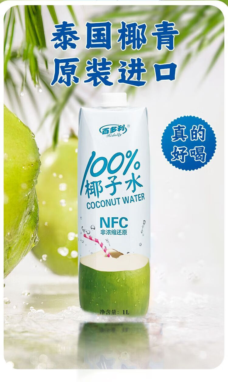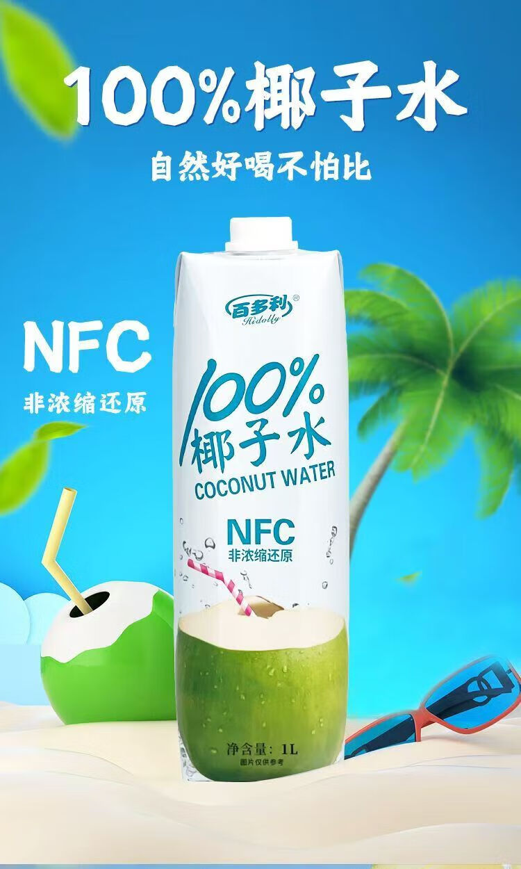 百多利100%椰子水纯椰汁NFC椰子水饮料 年货100%NFC椰子水 1L*4瓶
