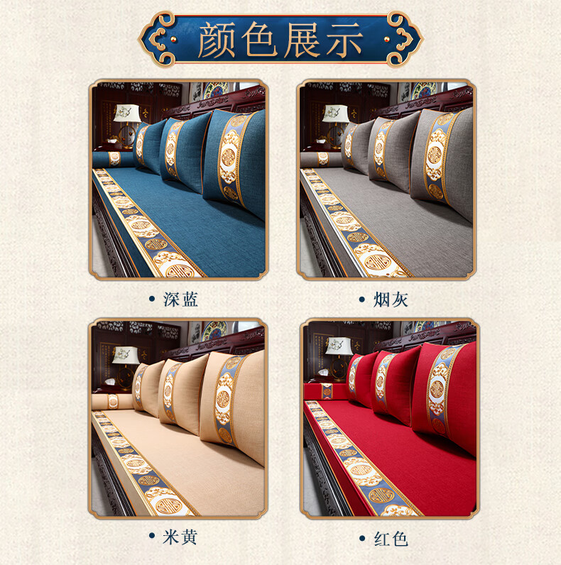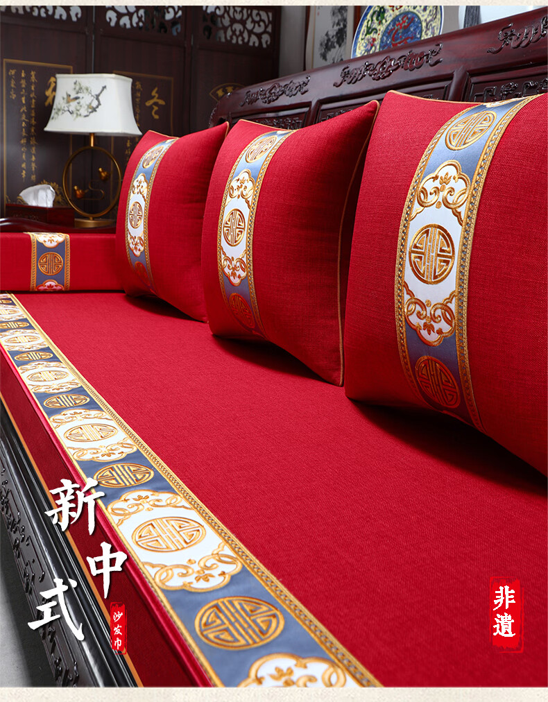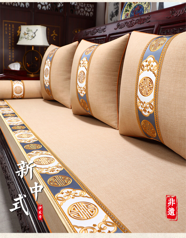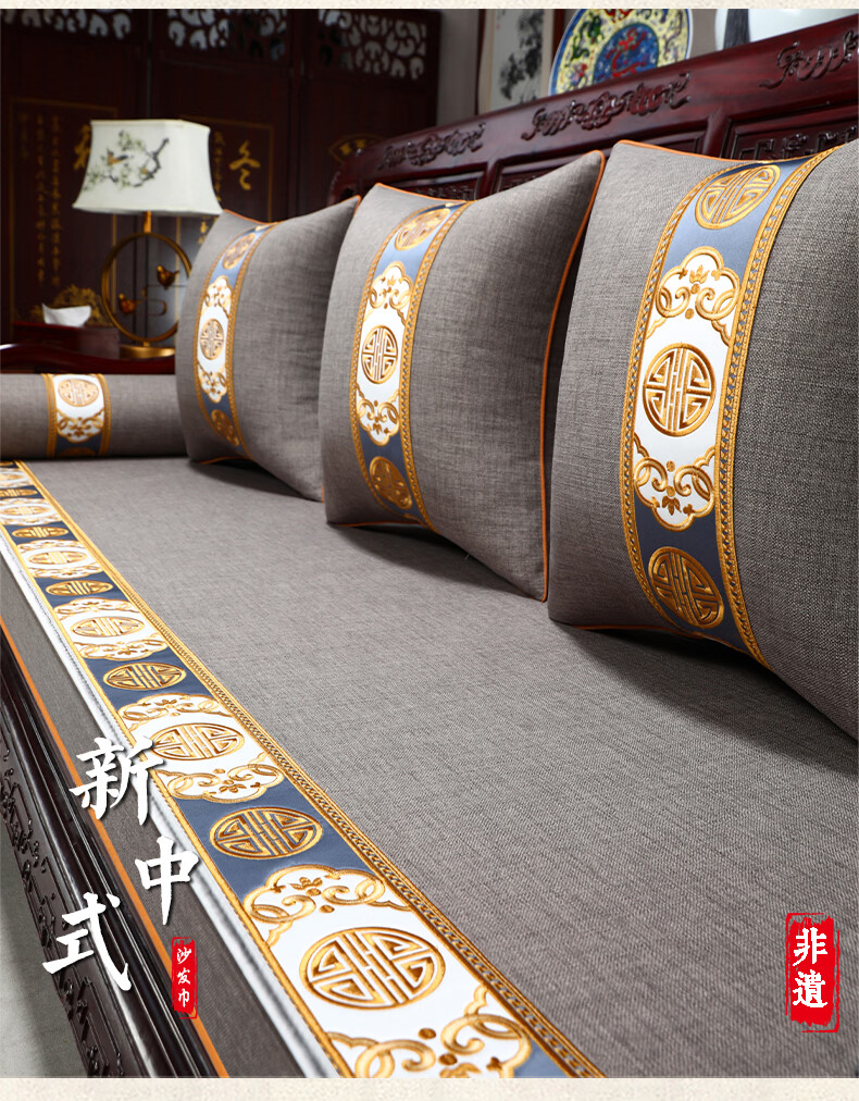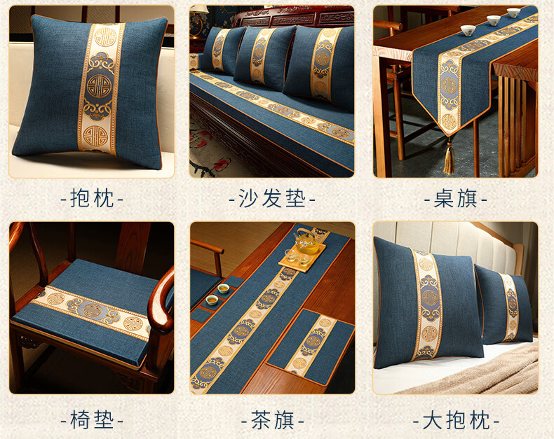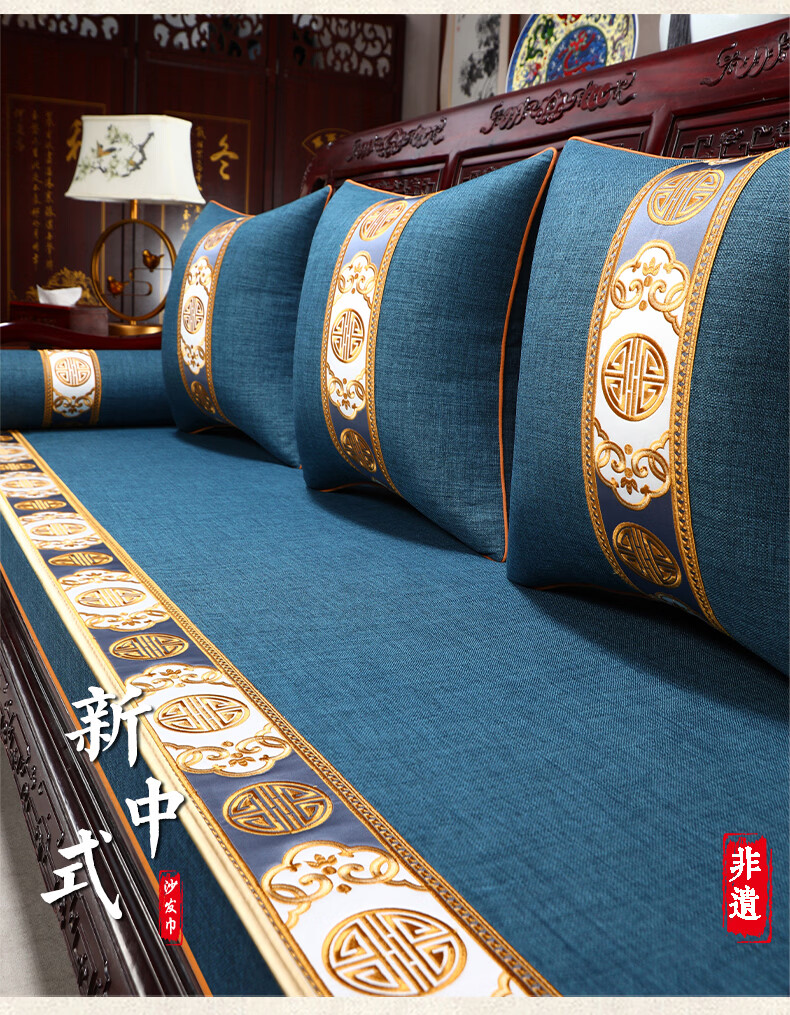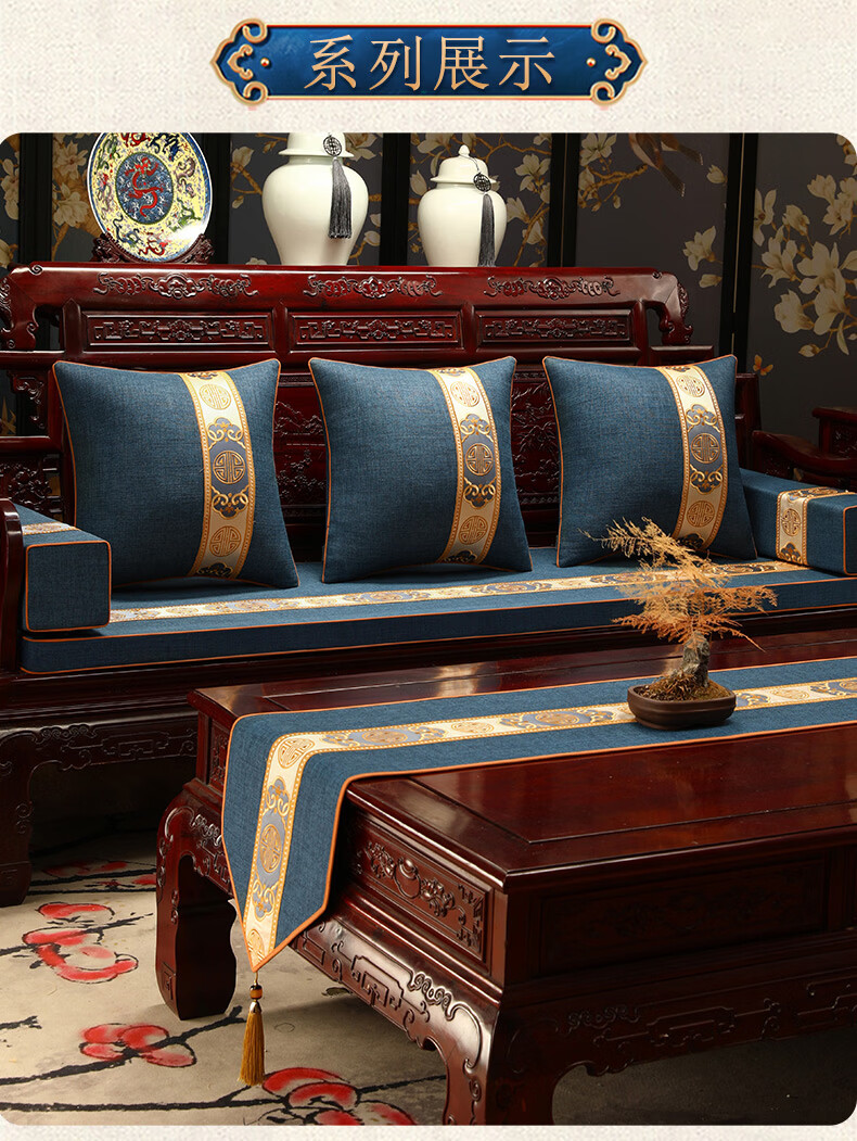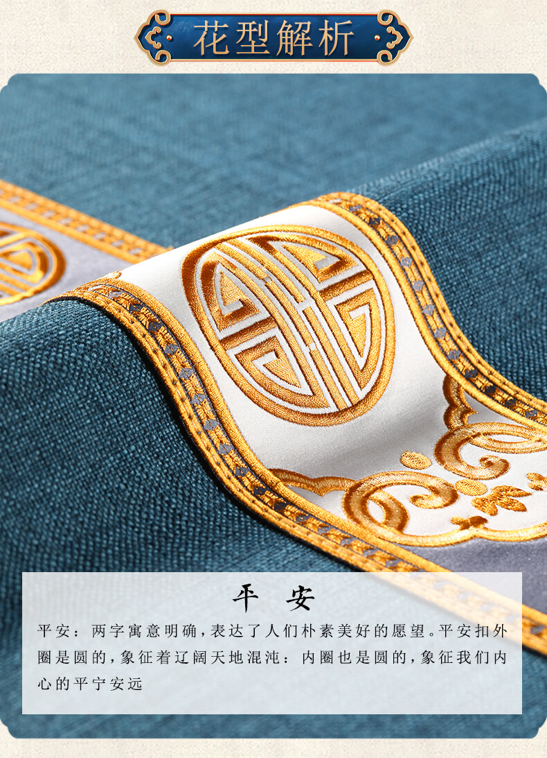 大唐梦新中式红木沙发坐垫高档盖布实木沙发垫套罩定制防滑靠背巾盖巾 平安 深蓝【多丽丝麻/刺绣/防水/防滑】 60cm*60cm【单人坐垫/靠背巾/扶手巾】不含内芯
