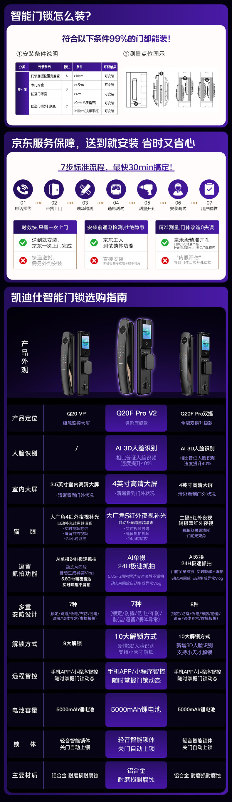 凯迪仕(KAADAS)智能门锁 3D人脸识别可视猫眼大屏指纹锁全自动 Q20F Pro V2