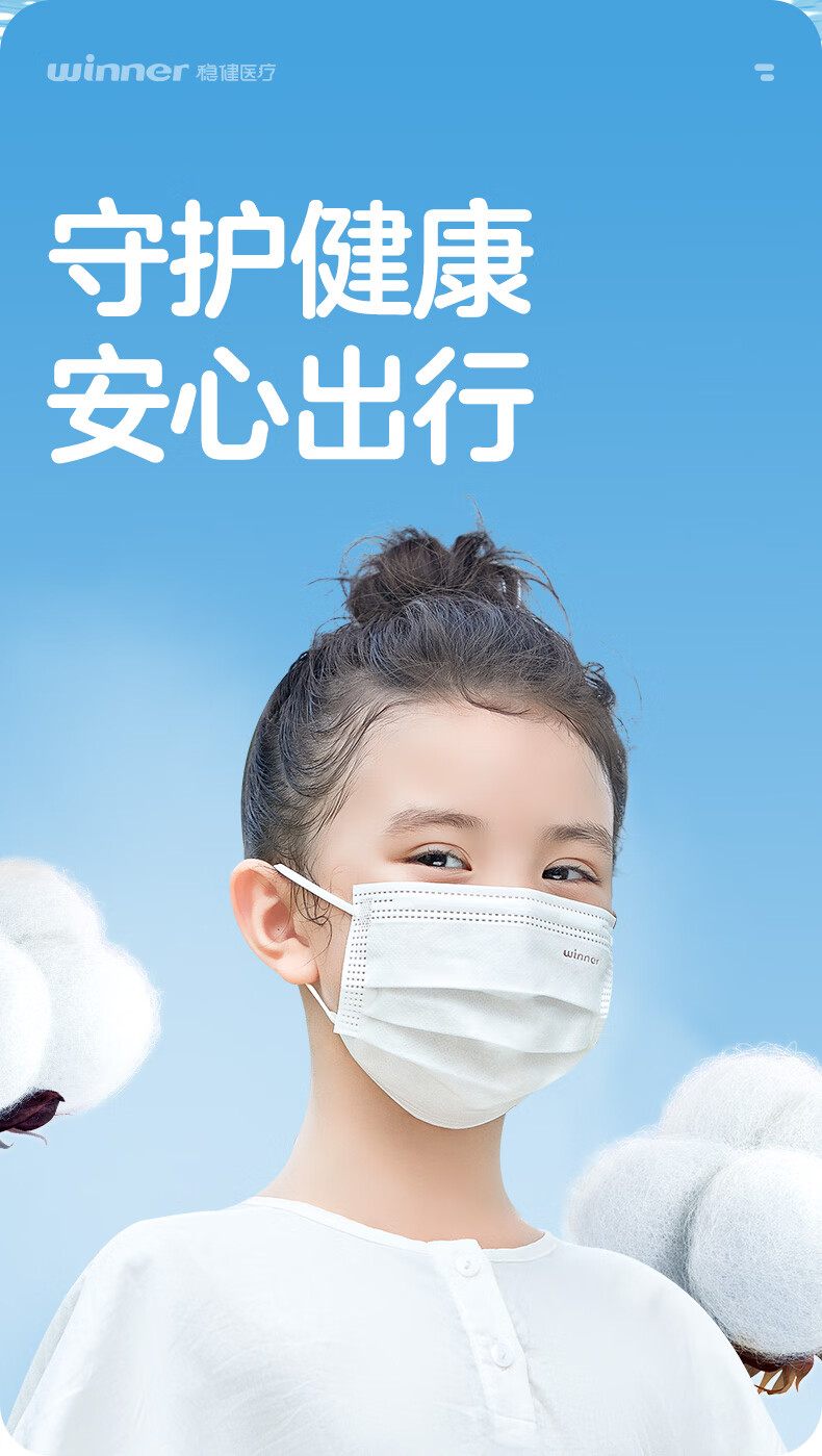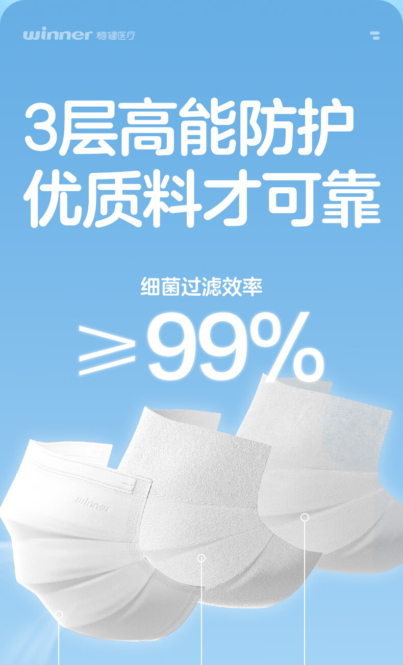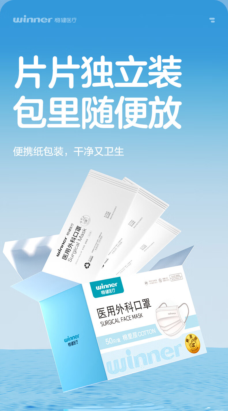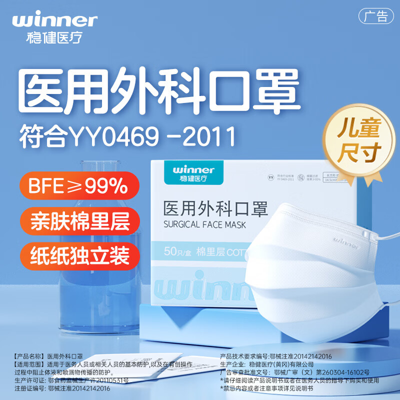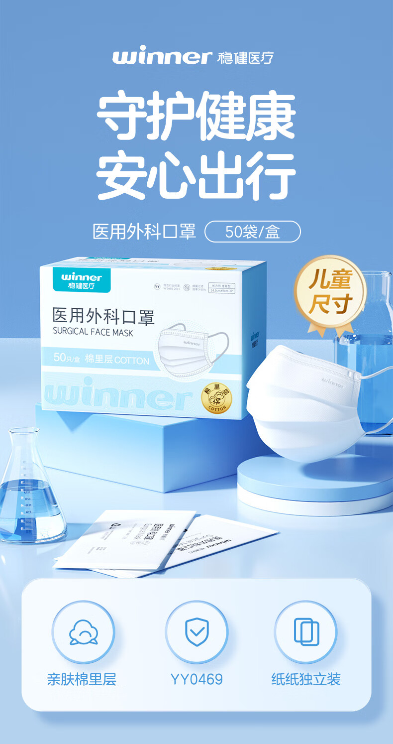 稳健医用外科口罩6-12岁儿童口罩独立装50只三层防护过滤率大于95%