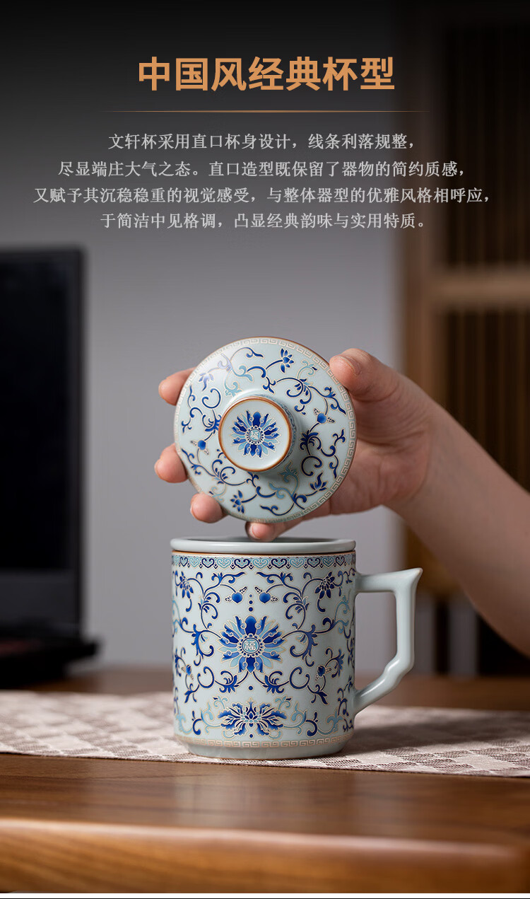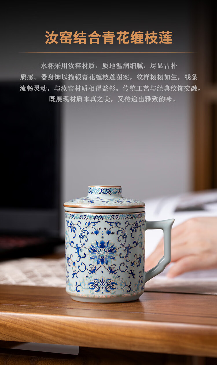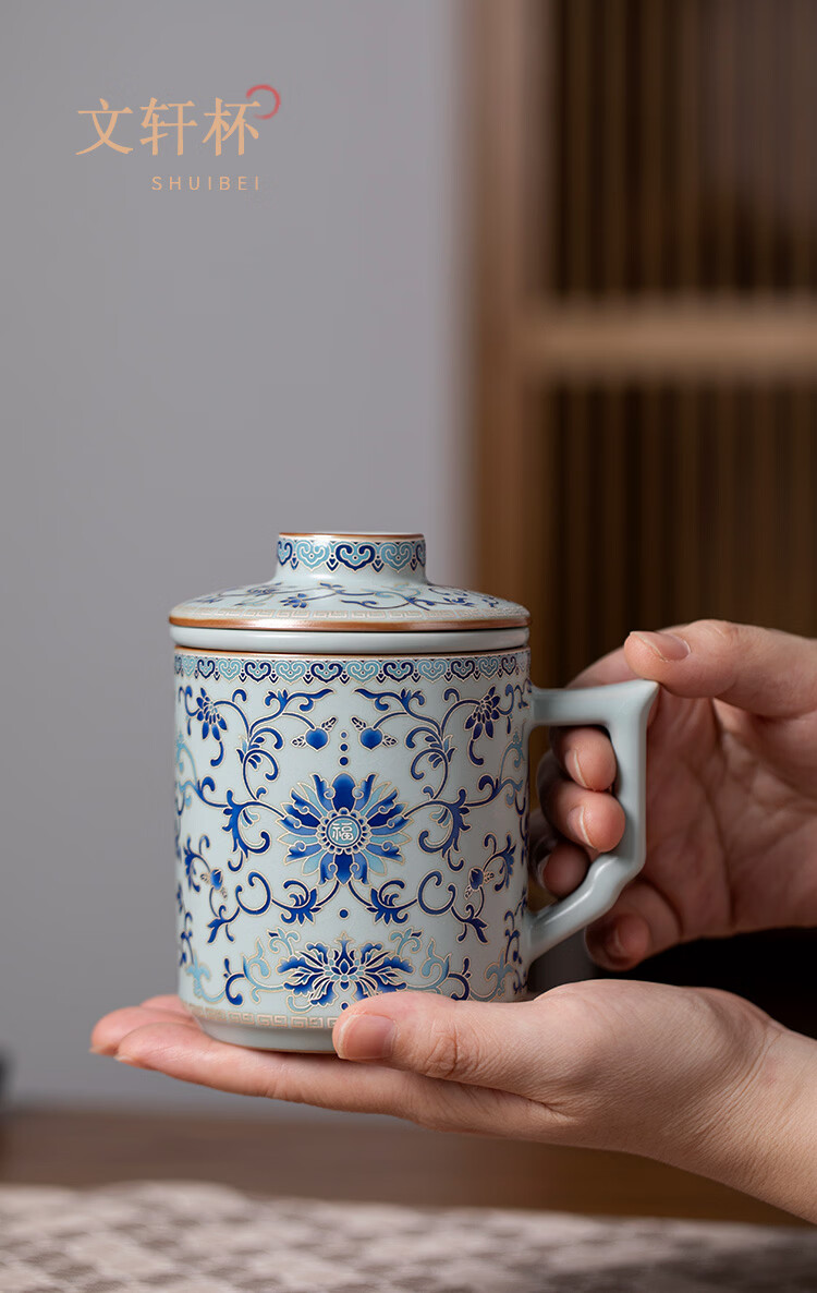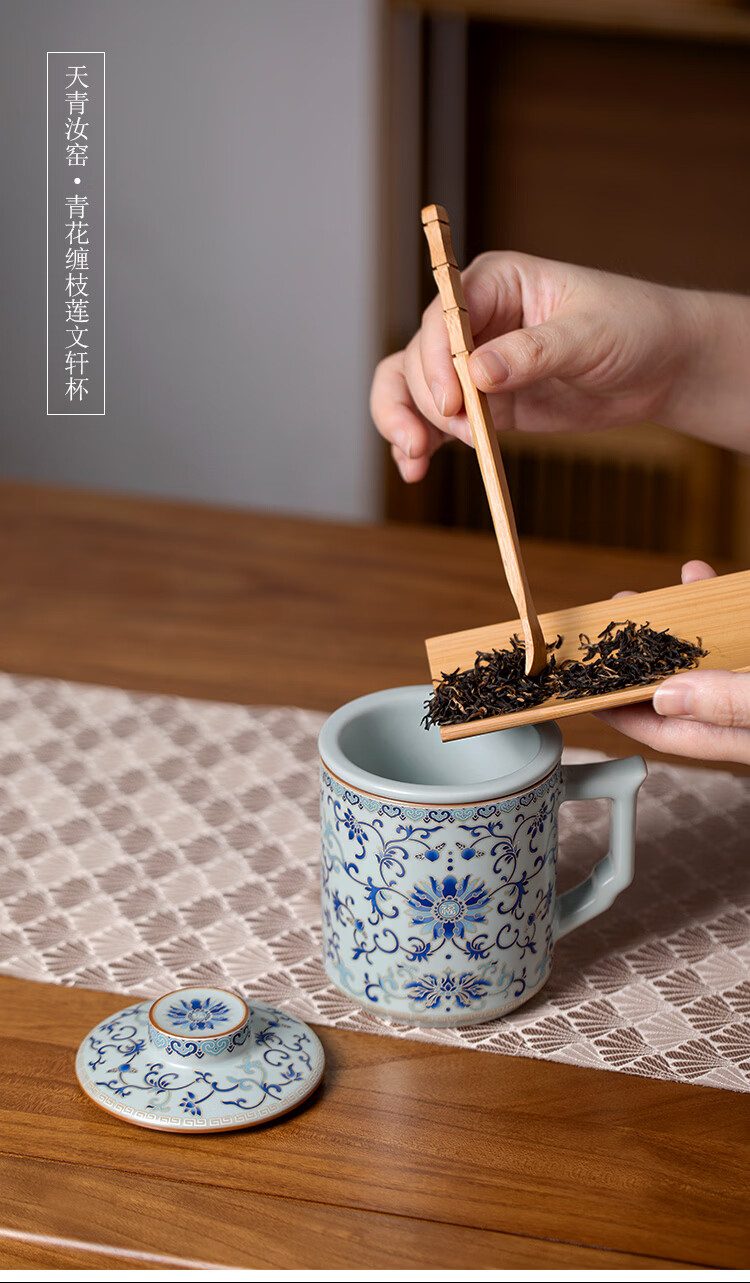 青禾窑天青汝窑马克杯缠枝莲过滤茶杯带盖过滤茶水分离杯高档办公室水杯 天青汝窑青花缠枝莲文轩杯