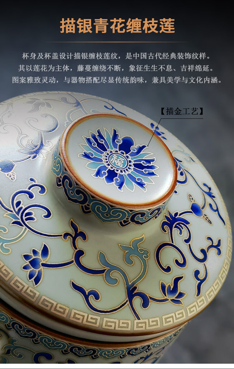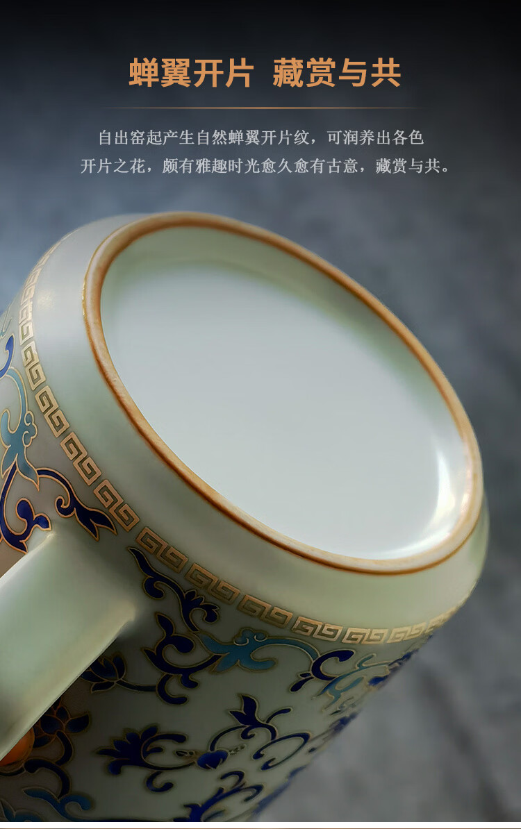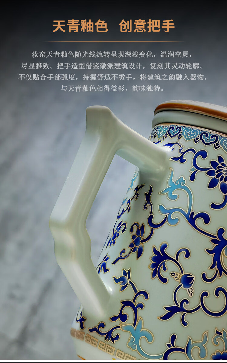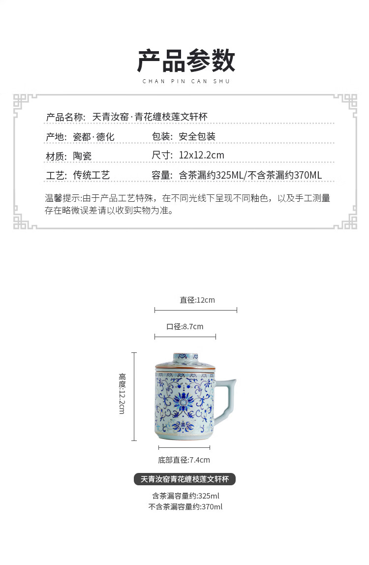 青禾窑天青汝窑马克杯缠枝莲过滤茶杯带盖过滤茶水分离杯高档办公室水杯 天青汝窑青花缠枝莲文轩杯
