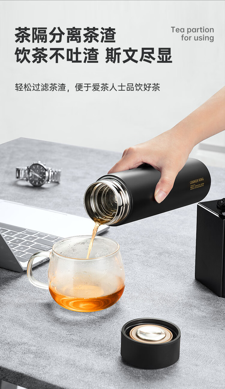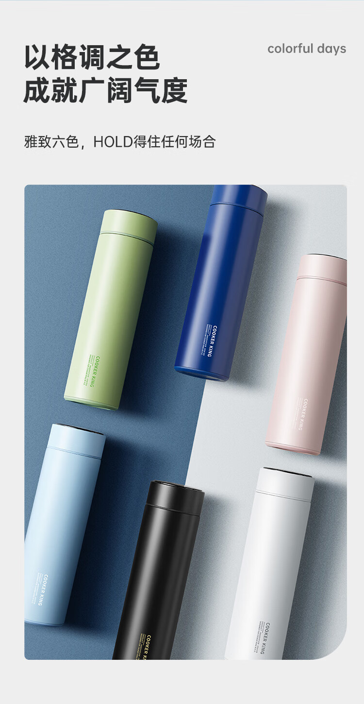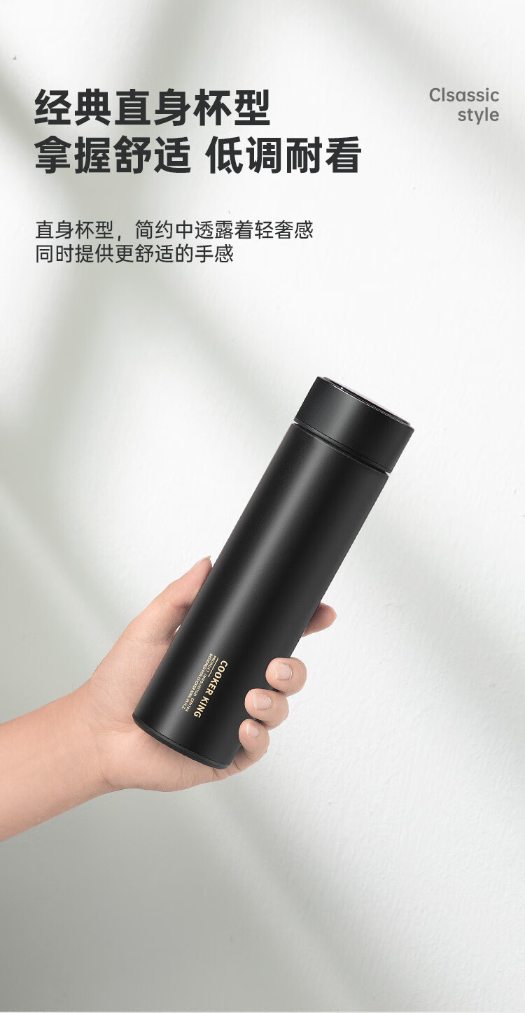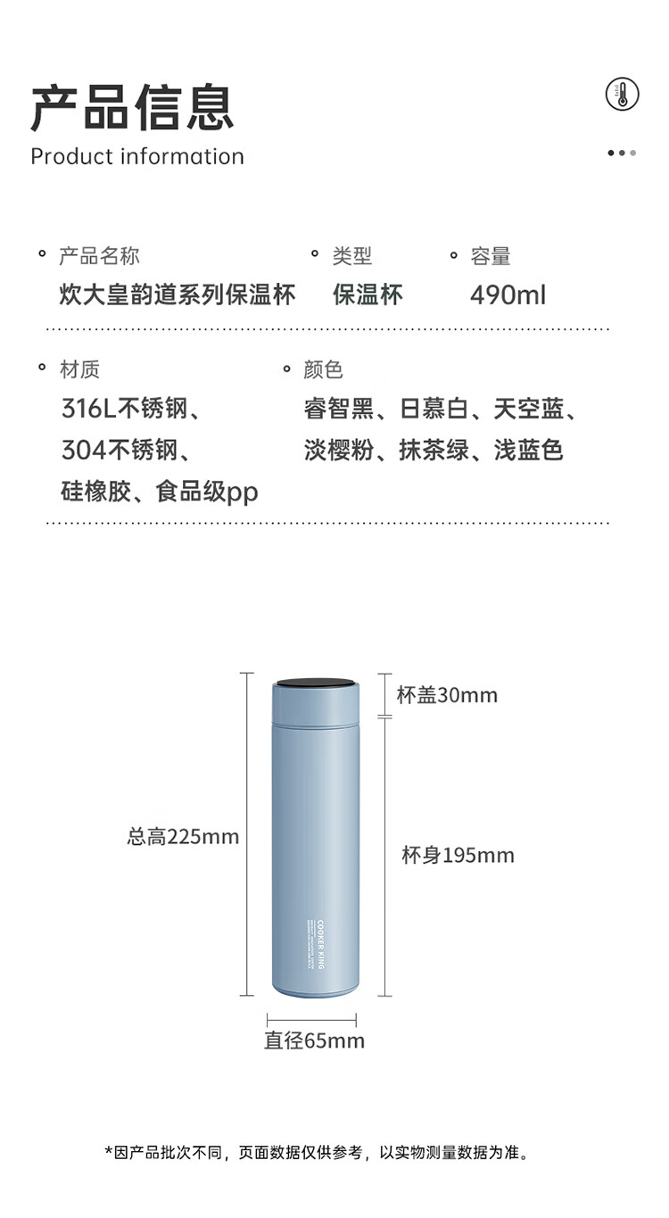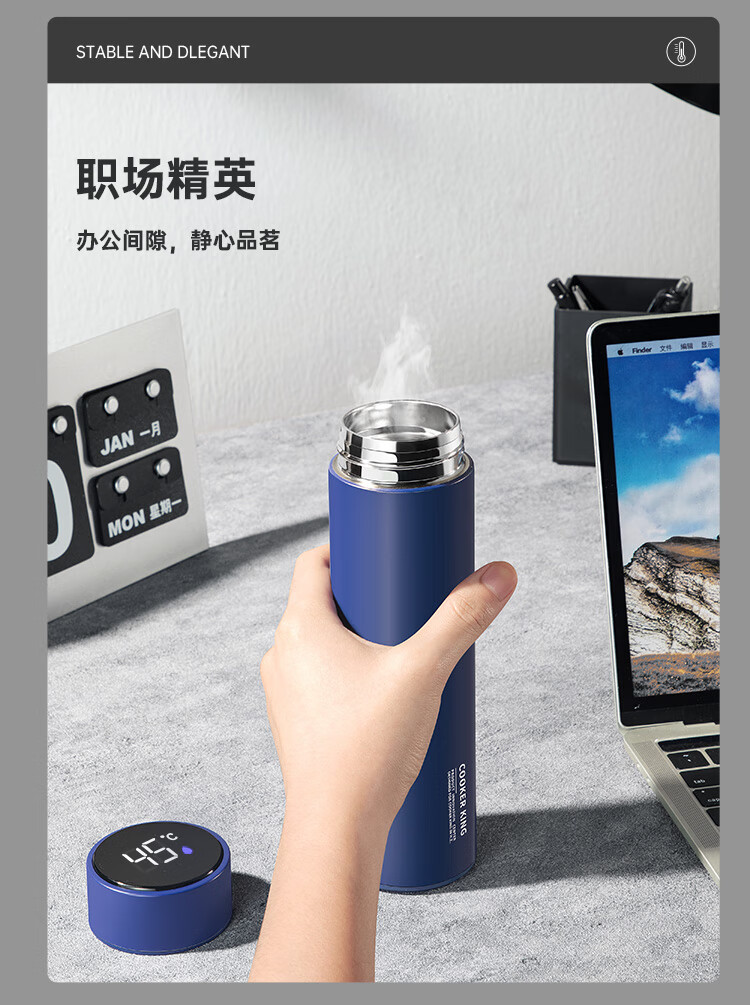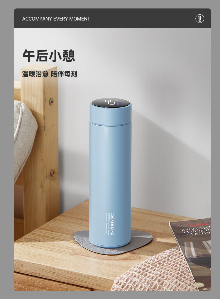 炊大皇保温杯316L医用级不锈钢茶水分离商务便携智能保温杯浅蓝色 490ml