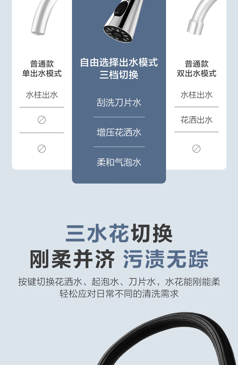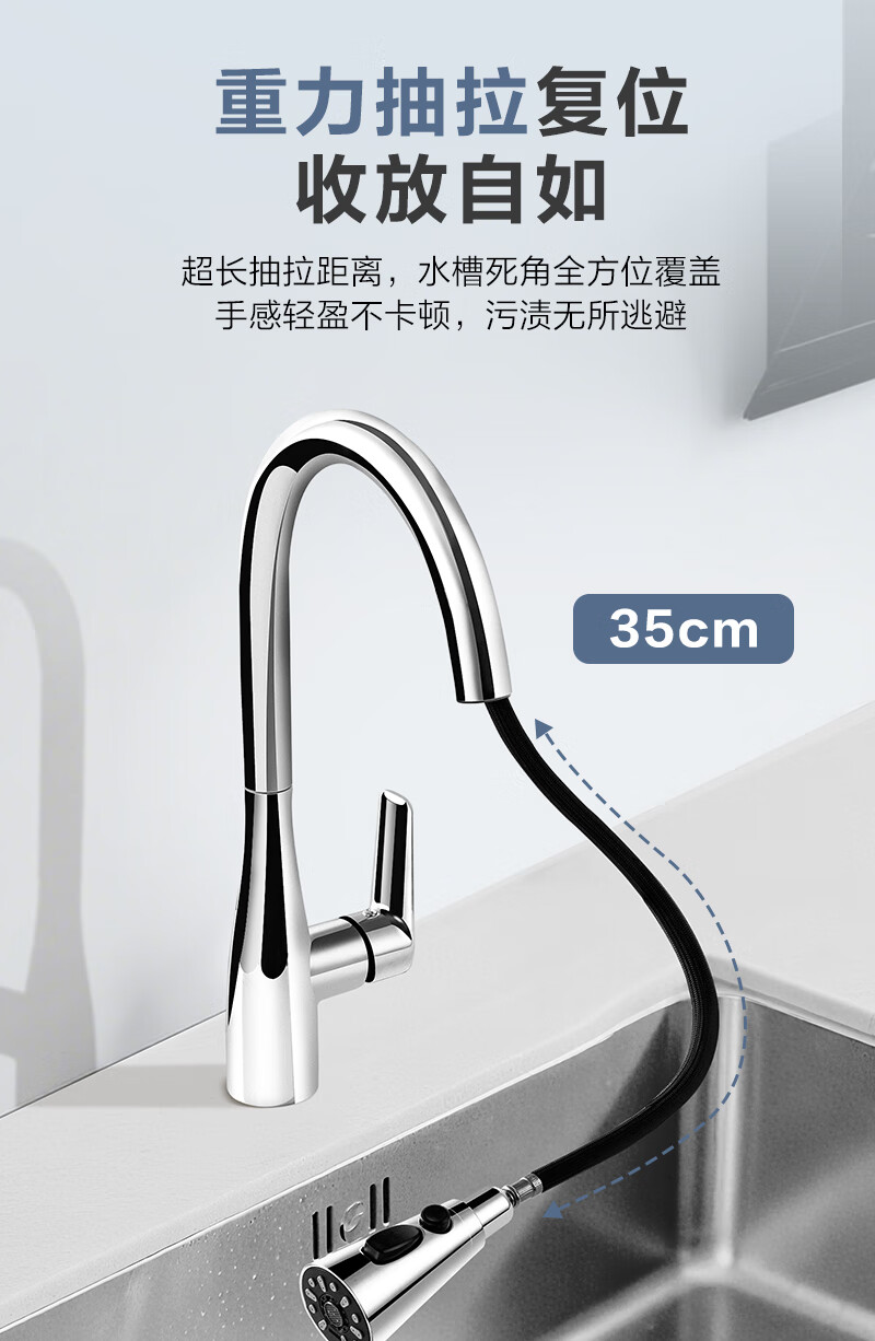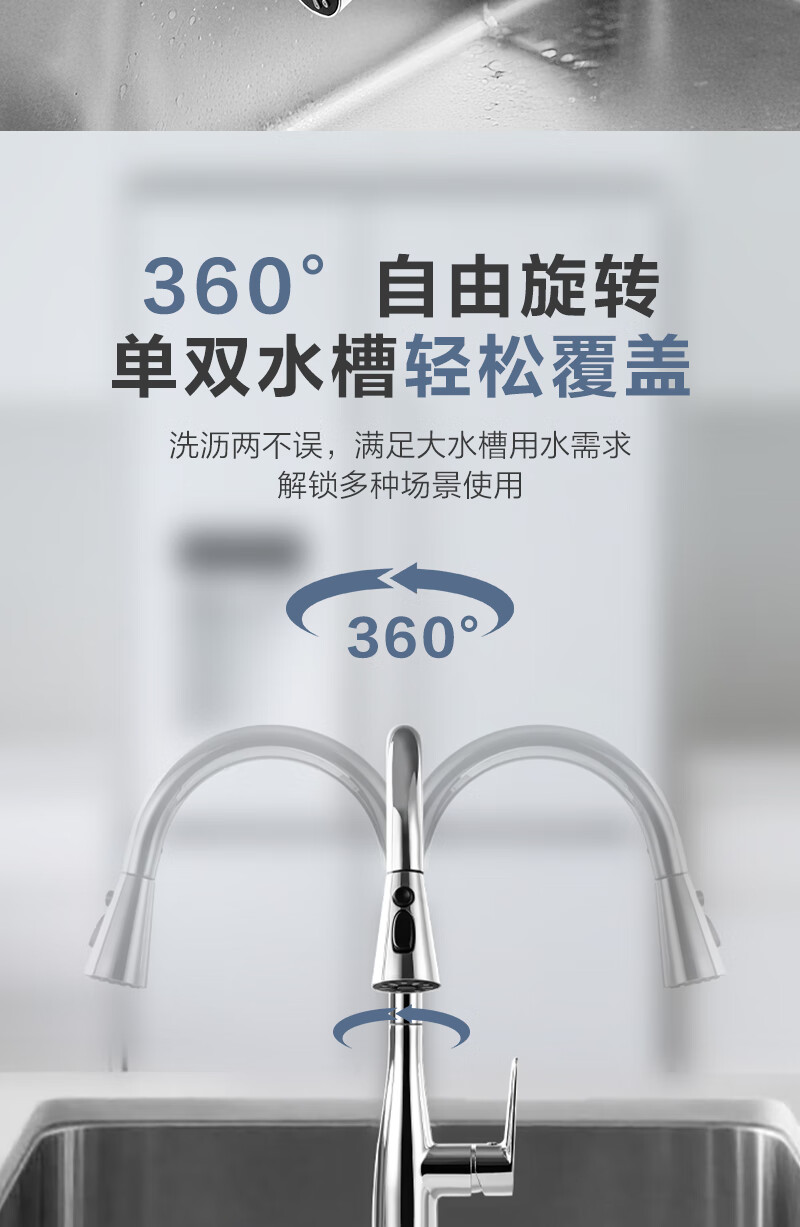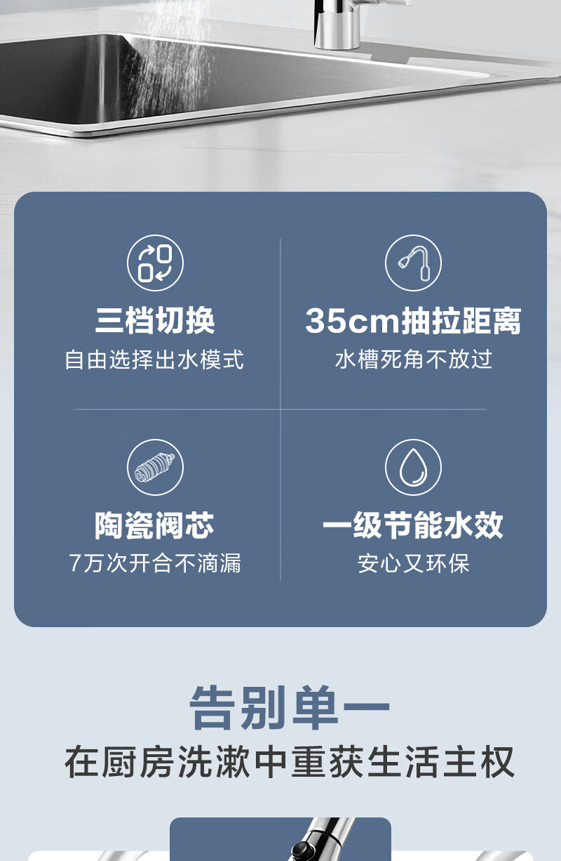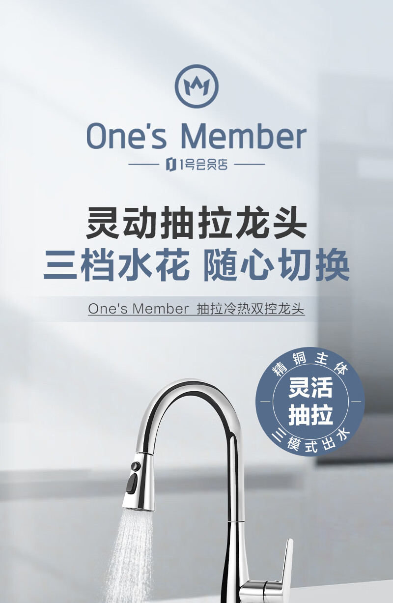 1号会员店厨房水龙头 三功能抽拉式360°旋转冷热双控精铜主体洗碗洗菜盆