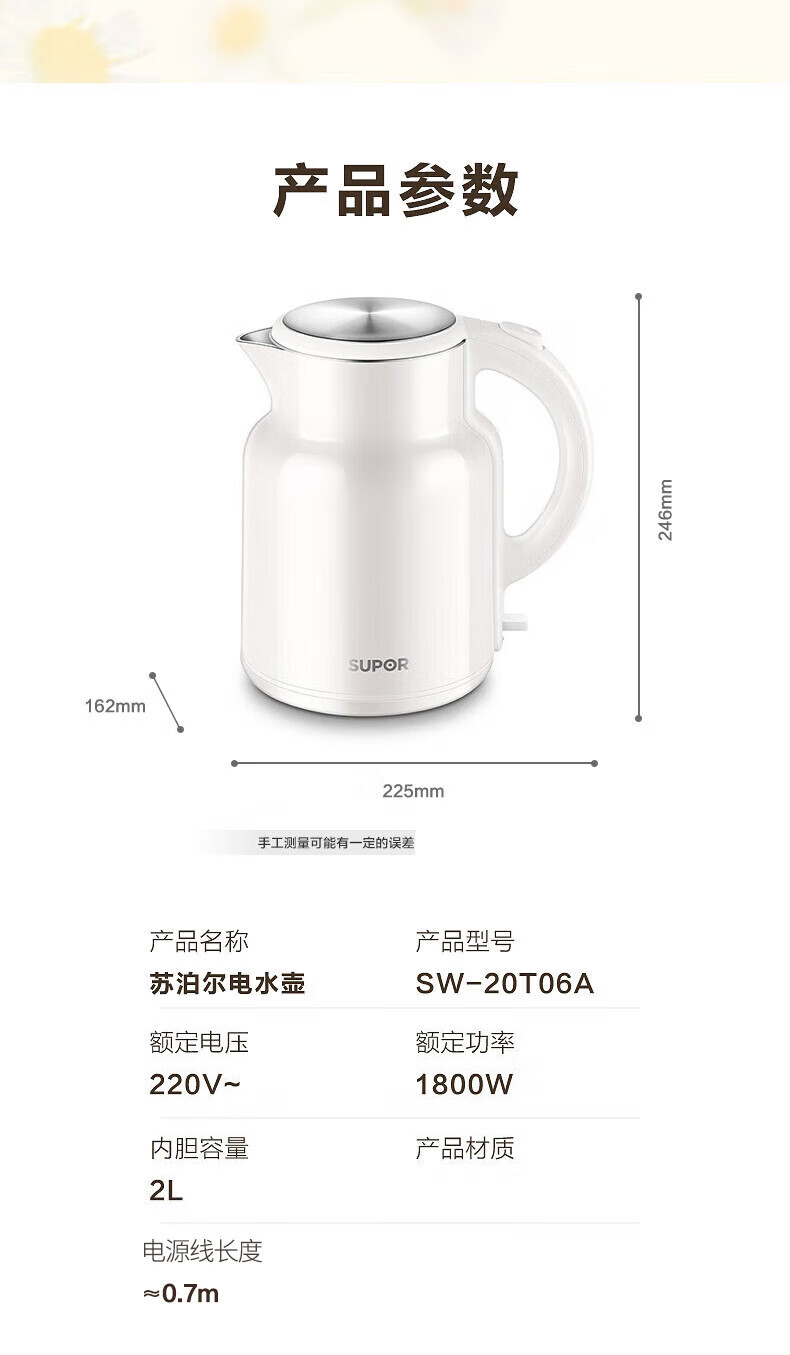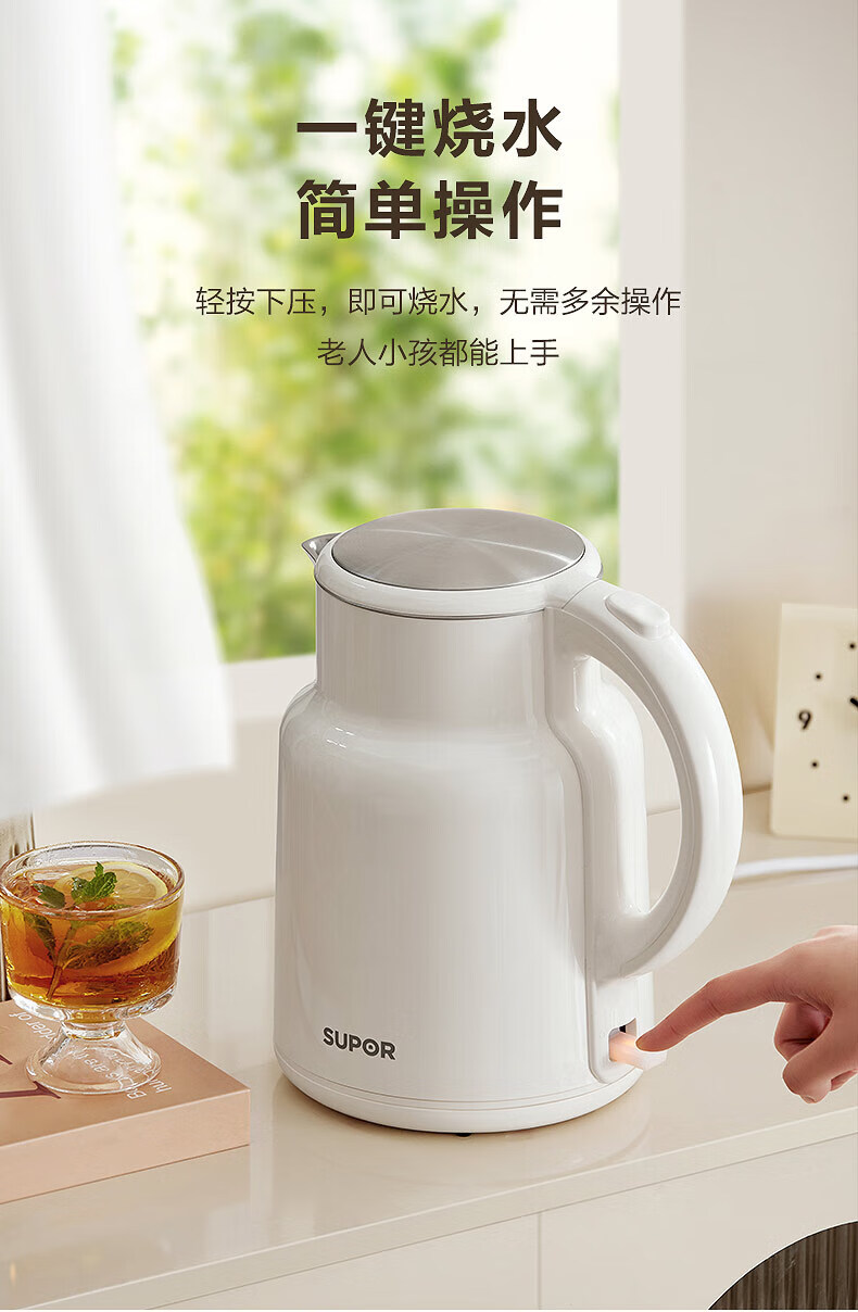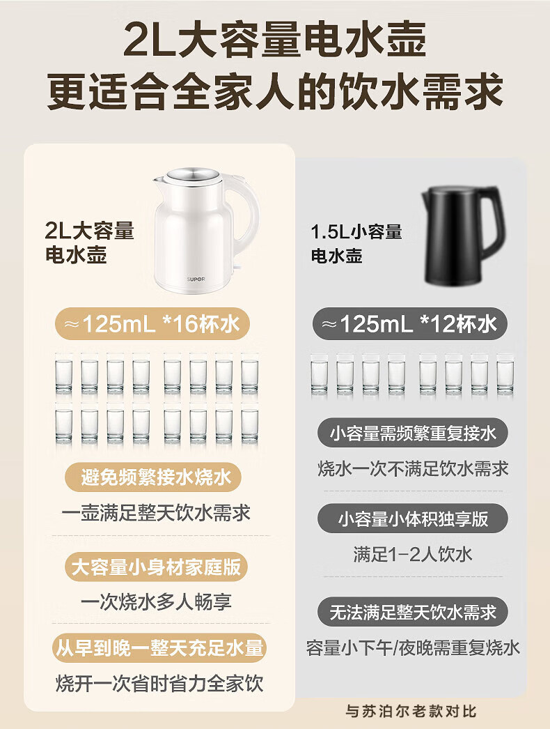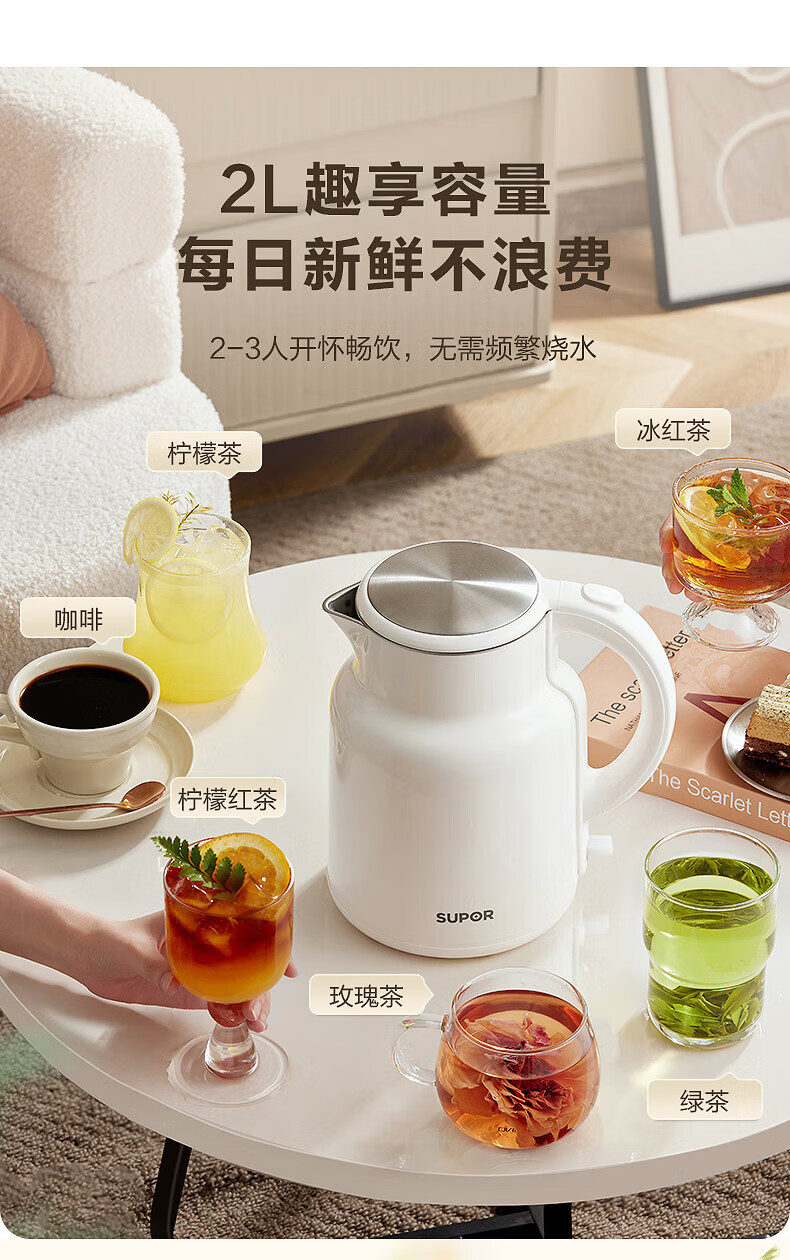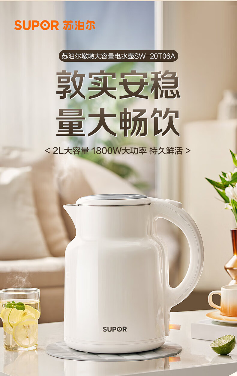 苏泊尔(SUPOR)吨吨大容量电水壶热水壶 2L大容量全钢无缝电热水壶 304不锈钢烧水壶 SW-20T06A
