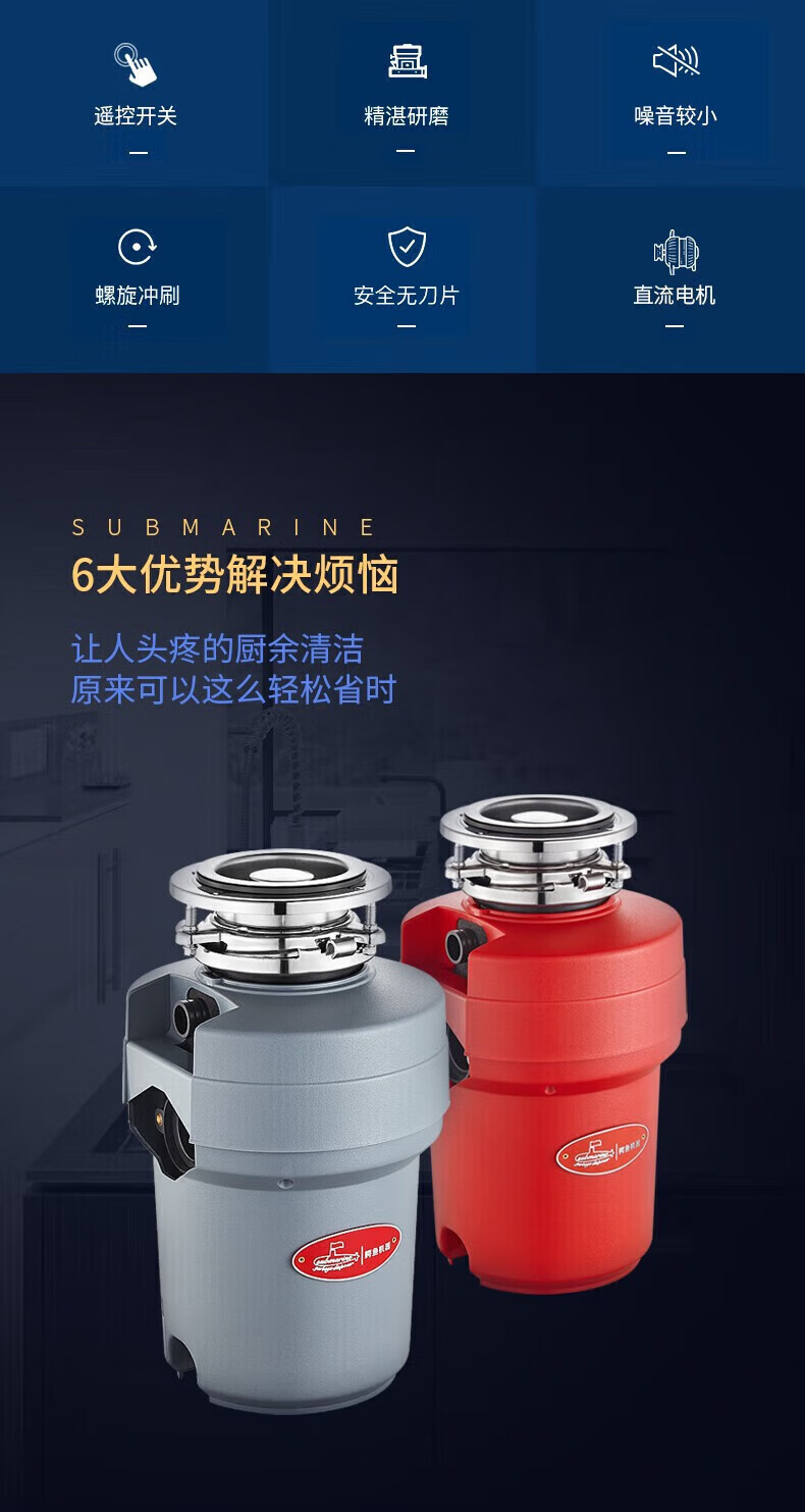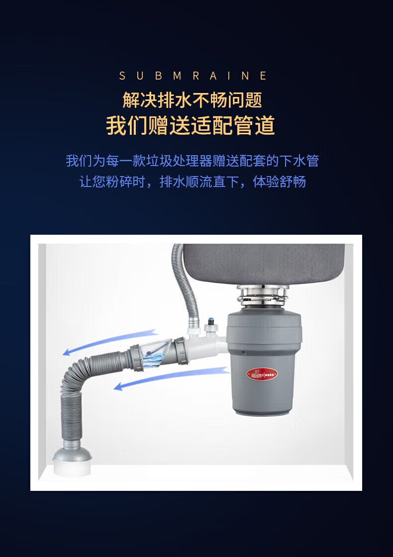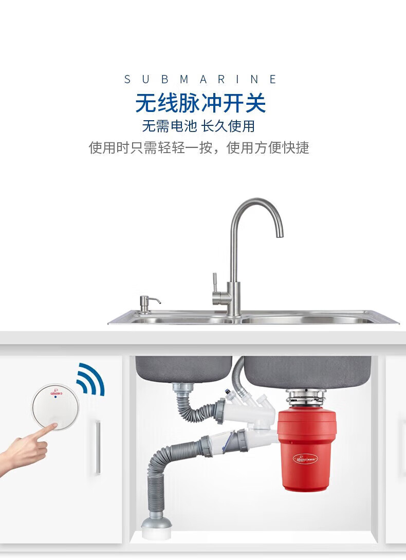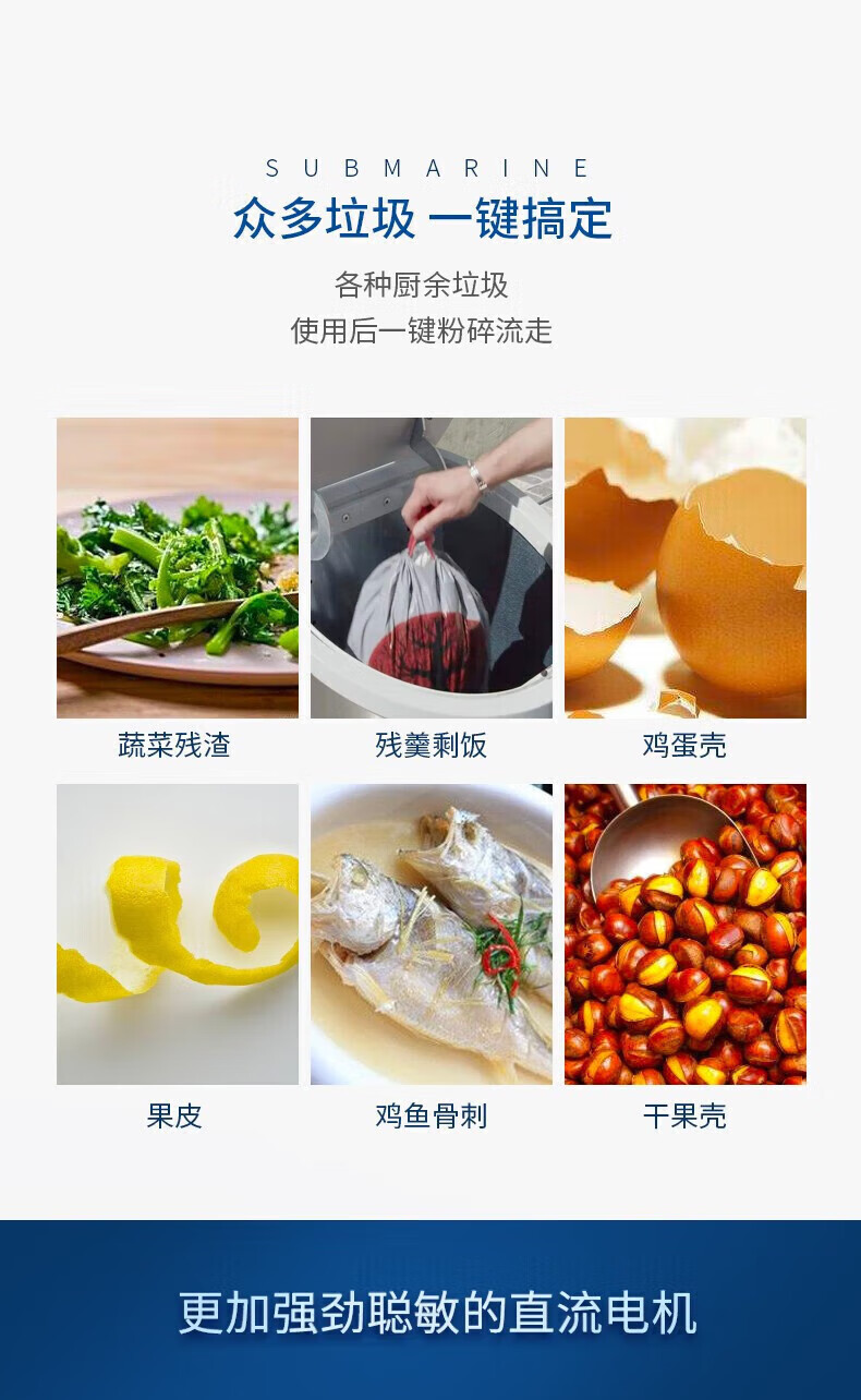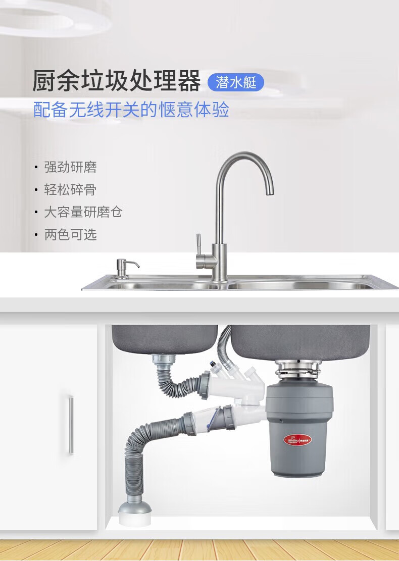 潜水艇(Submarine)厨余垃圾处理器厨房垃圾粉碎机可接洗碗机研磨直流电机静音 灰色 带双槽下水管