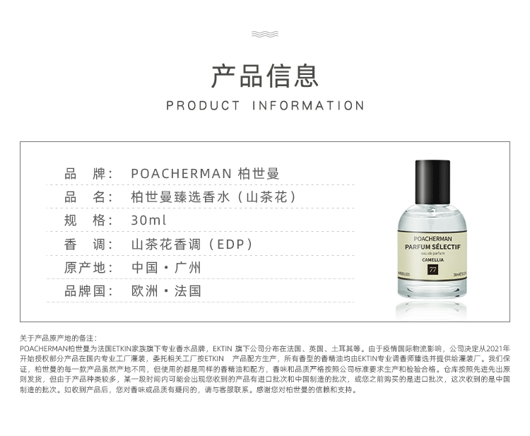 柏世曼山茶花香水CAMELLIA茶花淡香清新香调持久留香男女士小众香水小样 77山茶花10ml