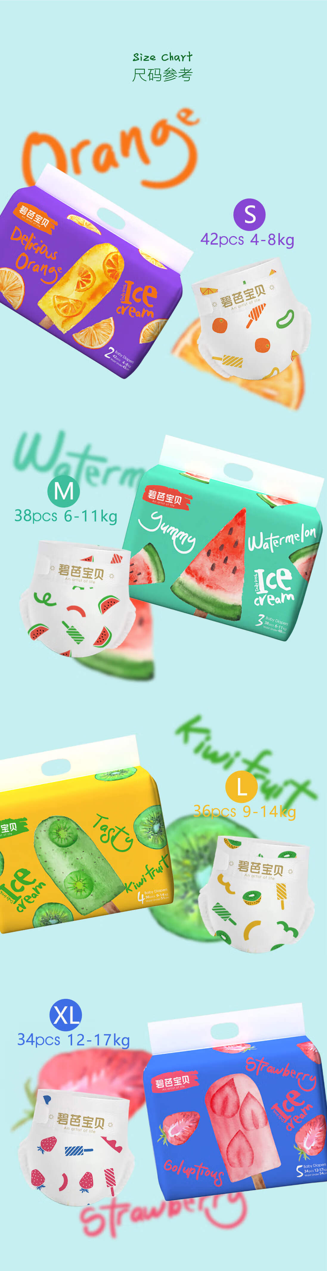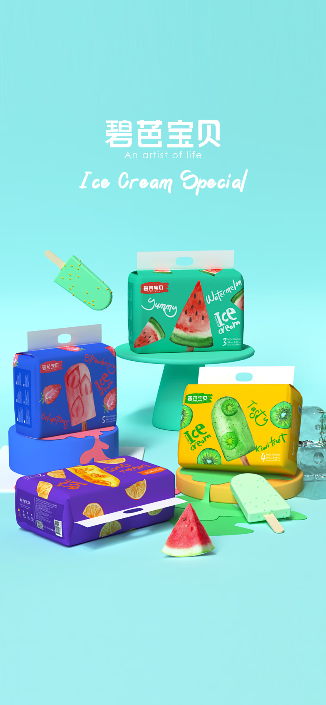 碧芭宝贝冰淇淋special纸尿裤M码38片(6-11kg)尿不湿超薄透气 薄荷清爽