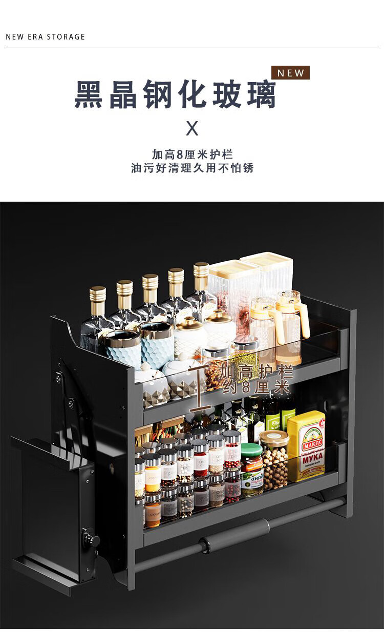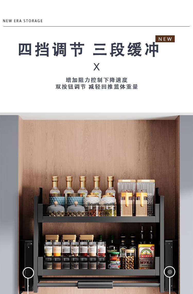 德米莫矮柜厨房吊柜拉篮铝合金下拉式手动调味篮多层置物架 【单层400柜】钢化玻璃挡板款纳米黑