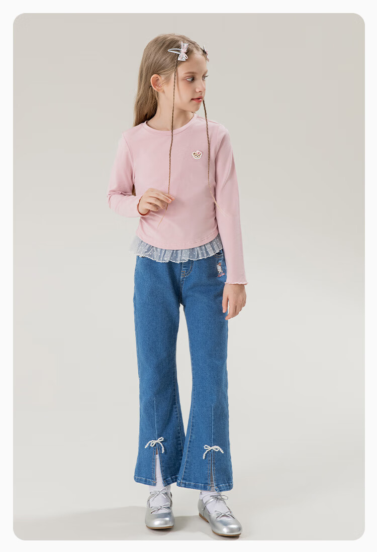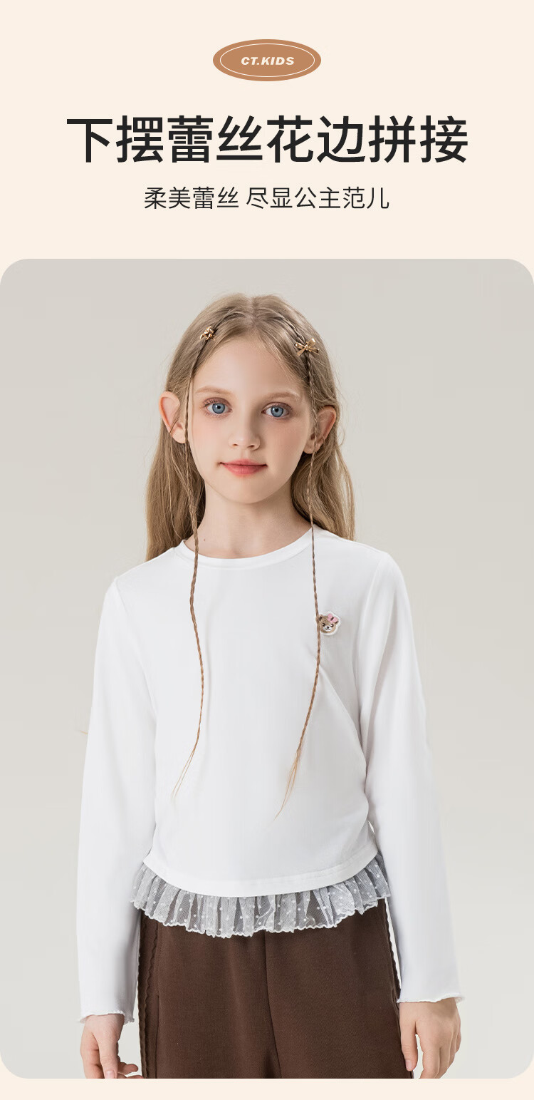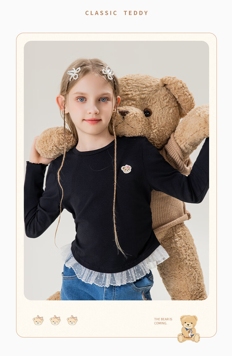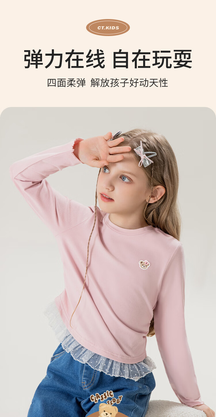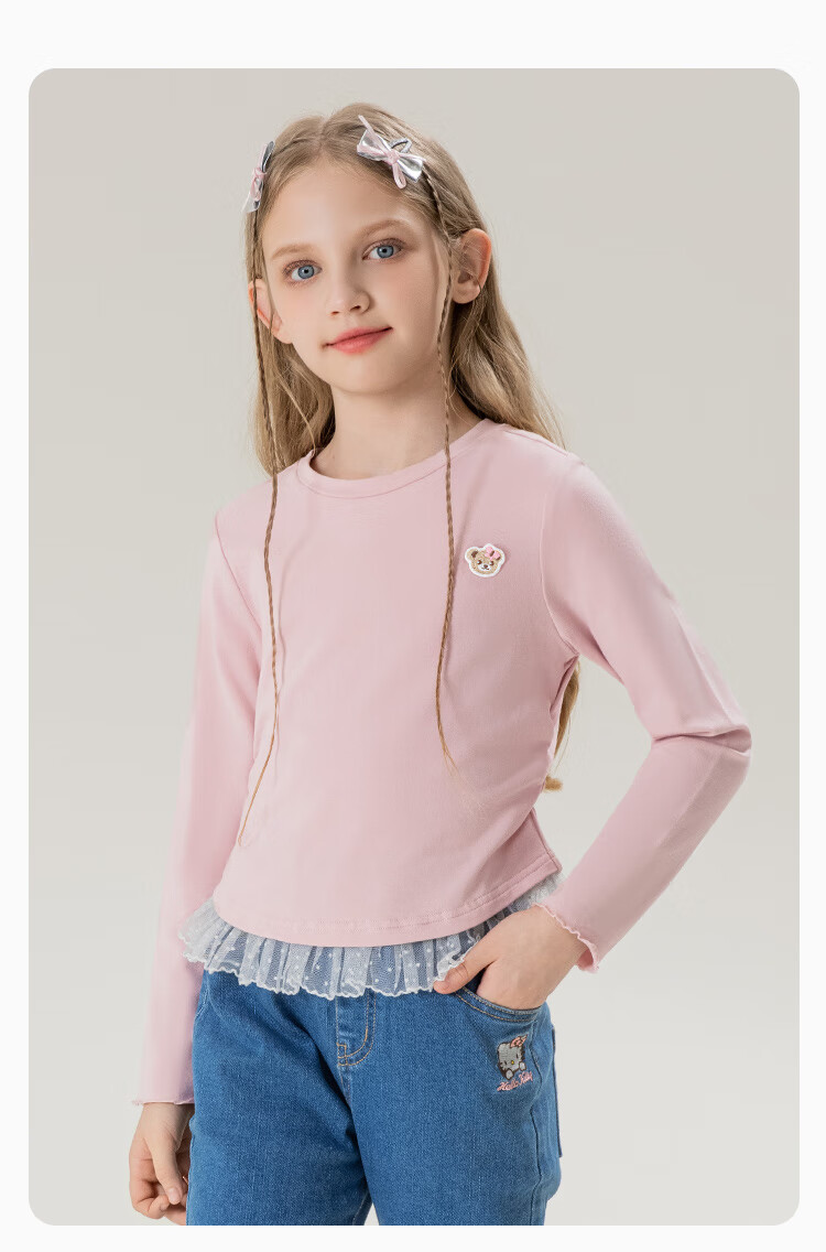 Classic Teddy女童柔软打底衫春季新品抑菌长袖T恤蕾丝边休闲上衣 皮粉 90