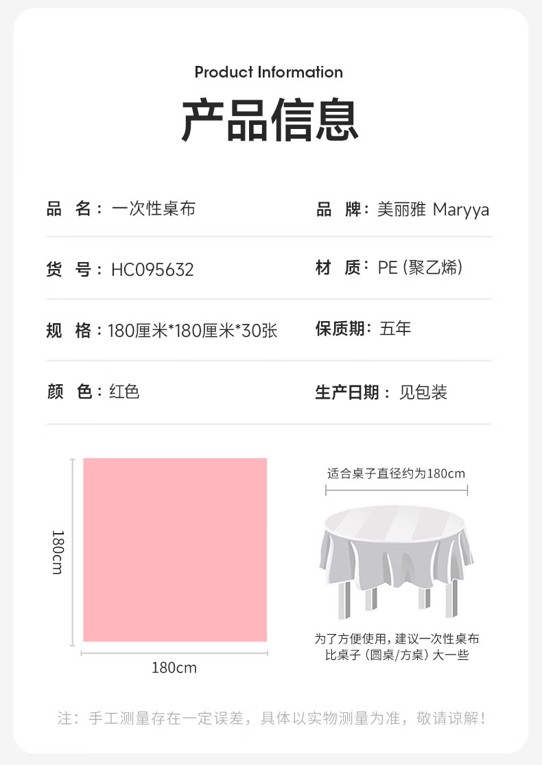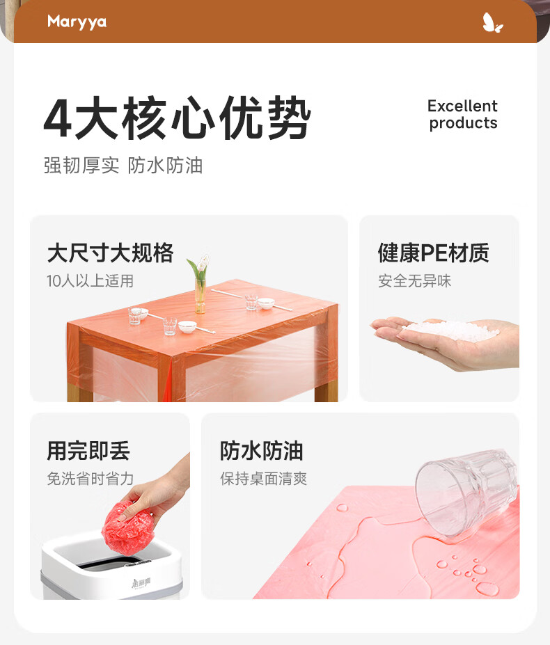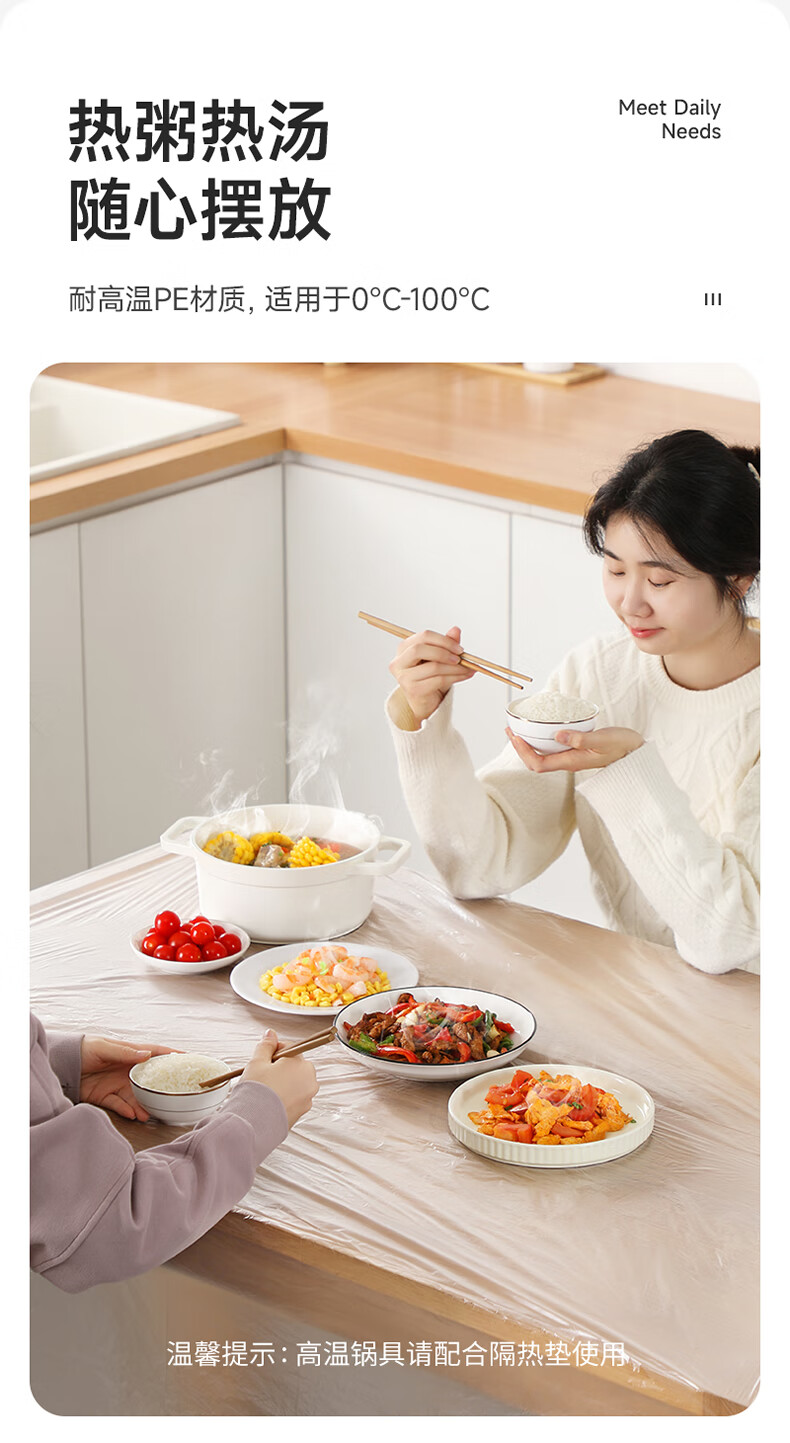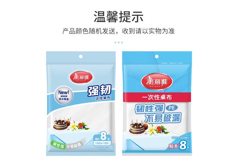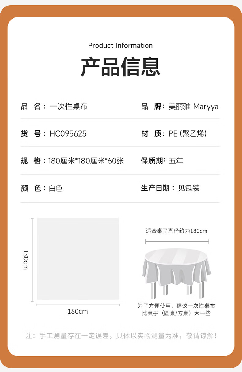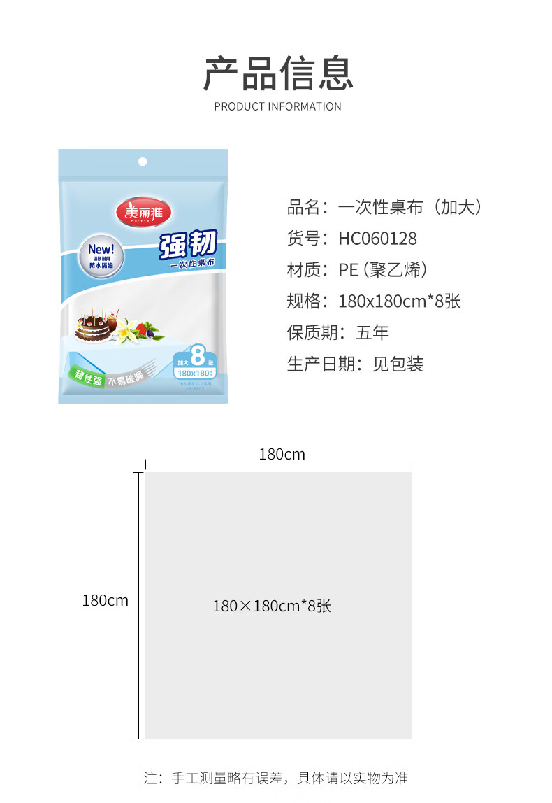 美丽雅一次性桌布 家用台布防水防油加厚餐桌台布外出露营塑料膜桌布 一次性桌布卷装180*180cm共30张