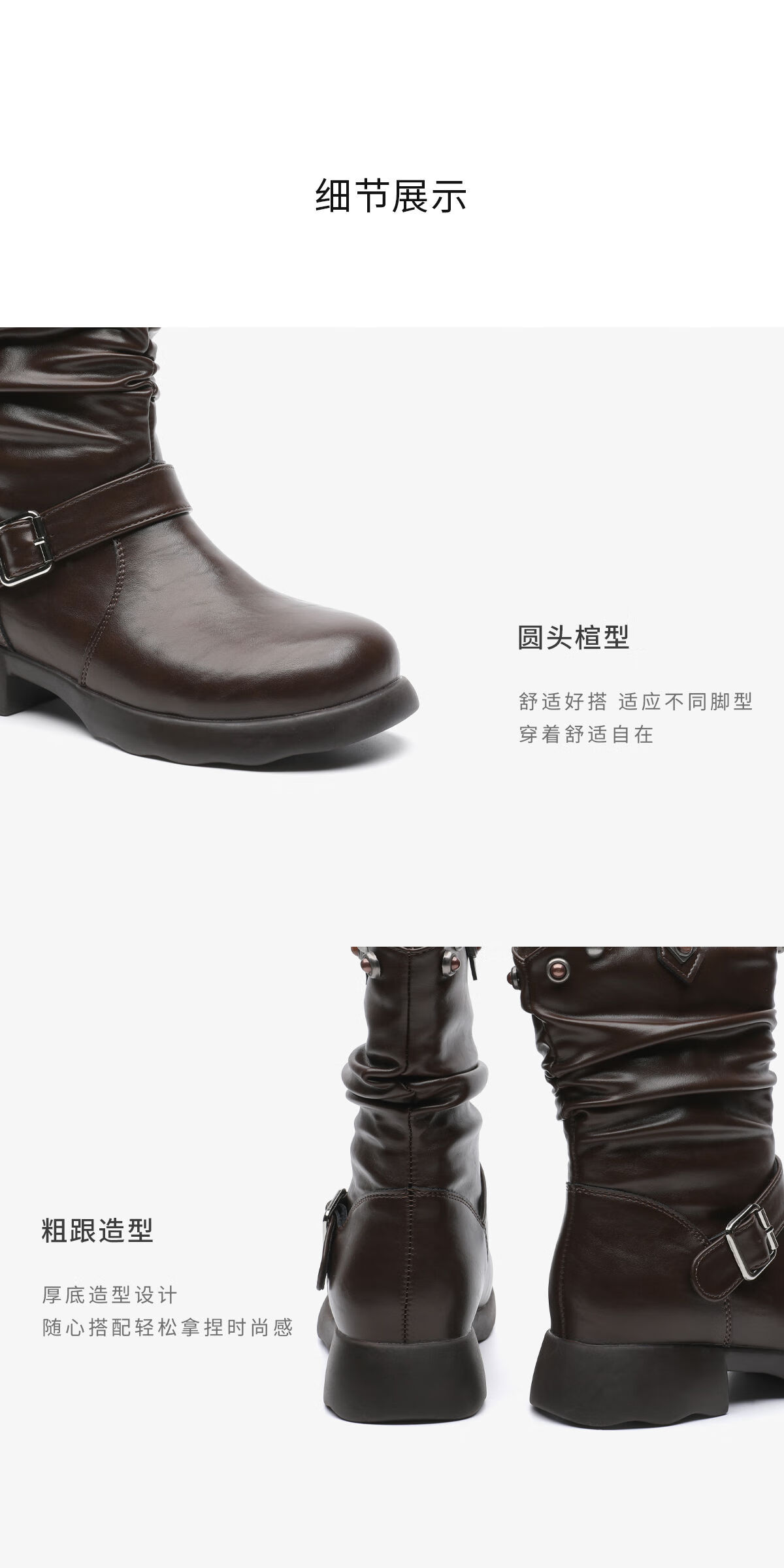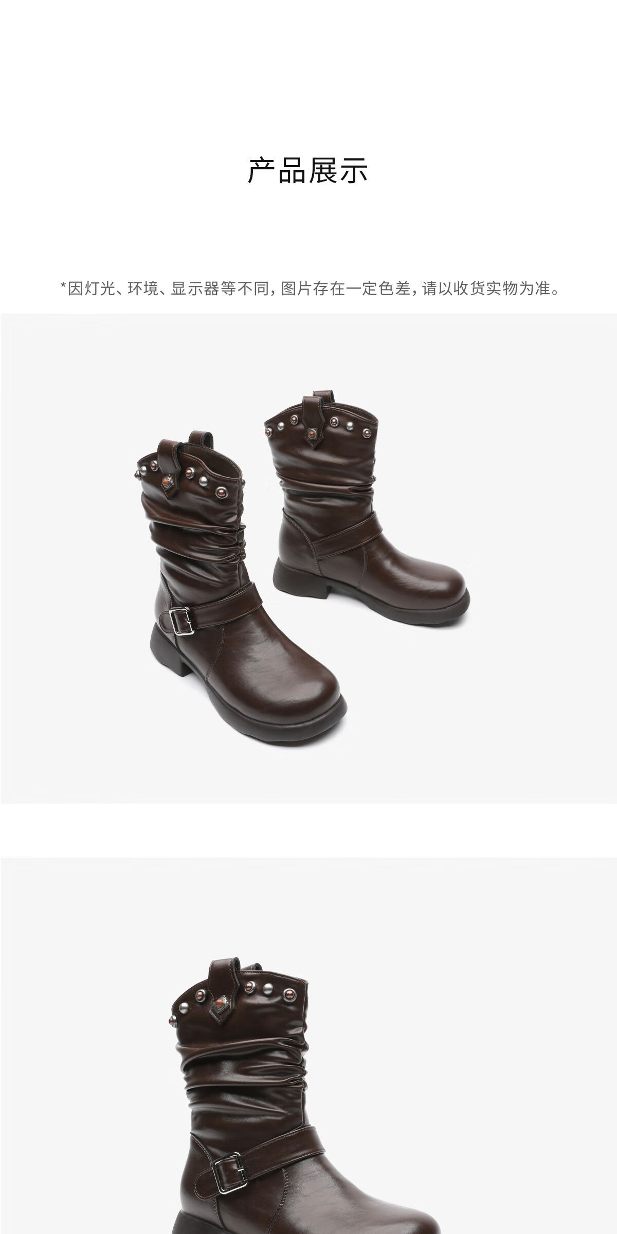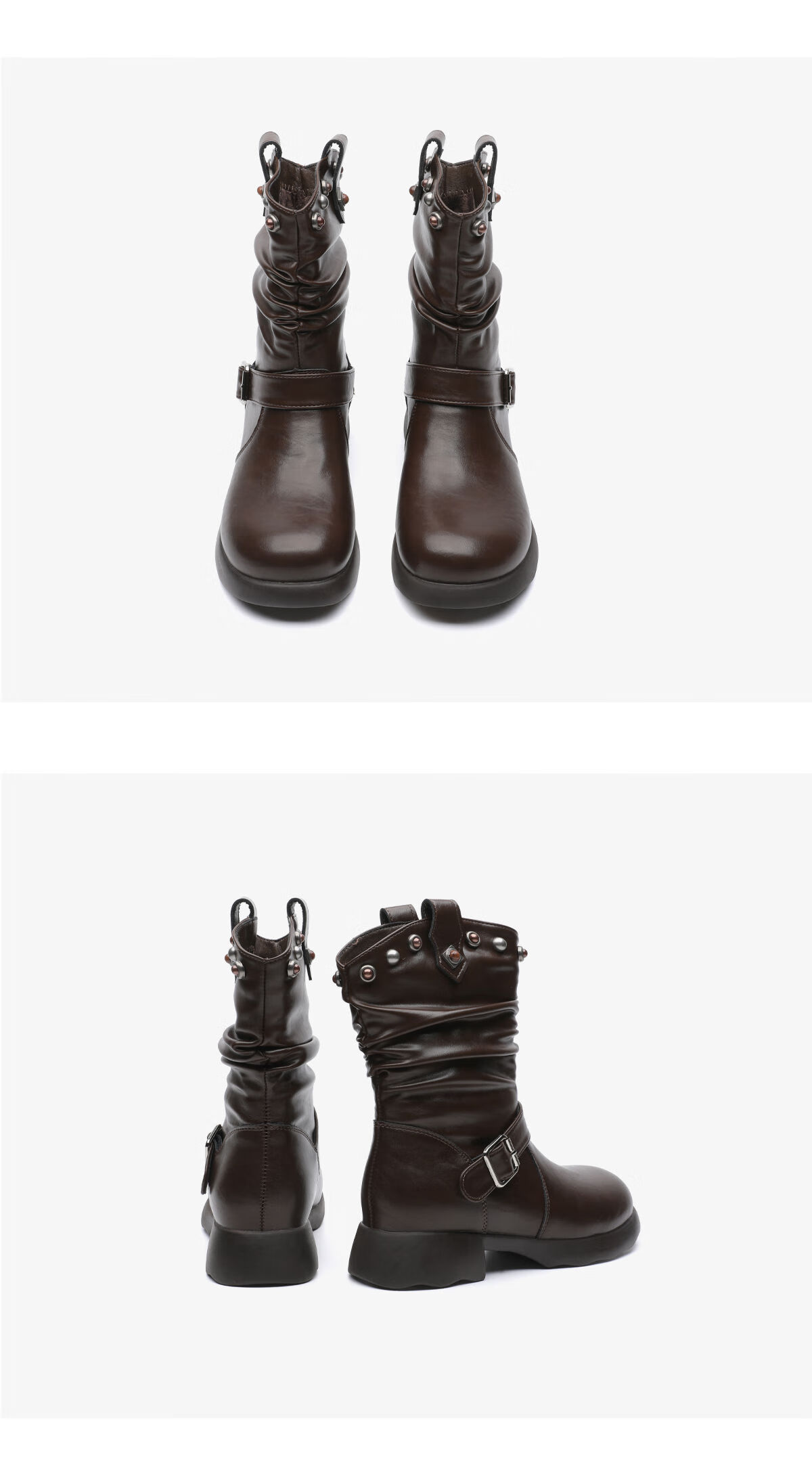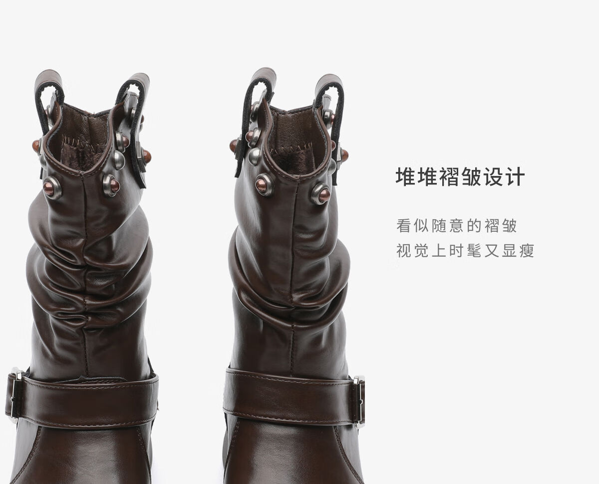 月芽儿美拉德风皮带扣堆堆靴女冬季褶皱中筒靴铆钉装饰时装靴 绒里咖啡色20T 34