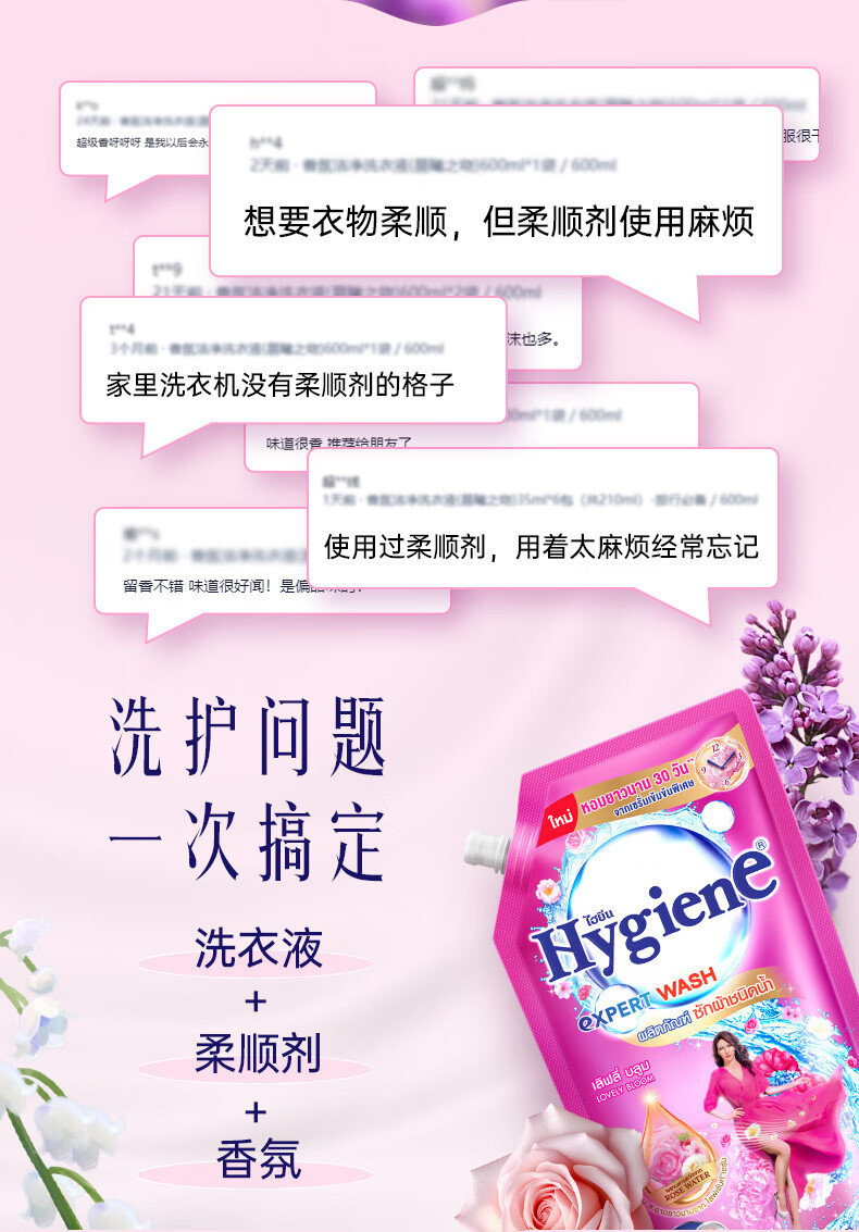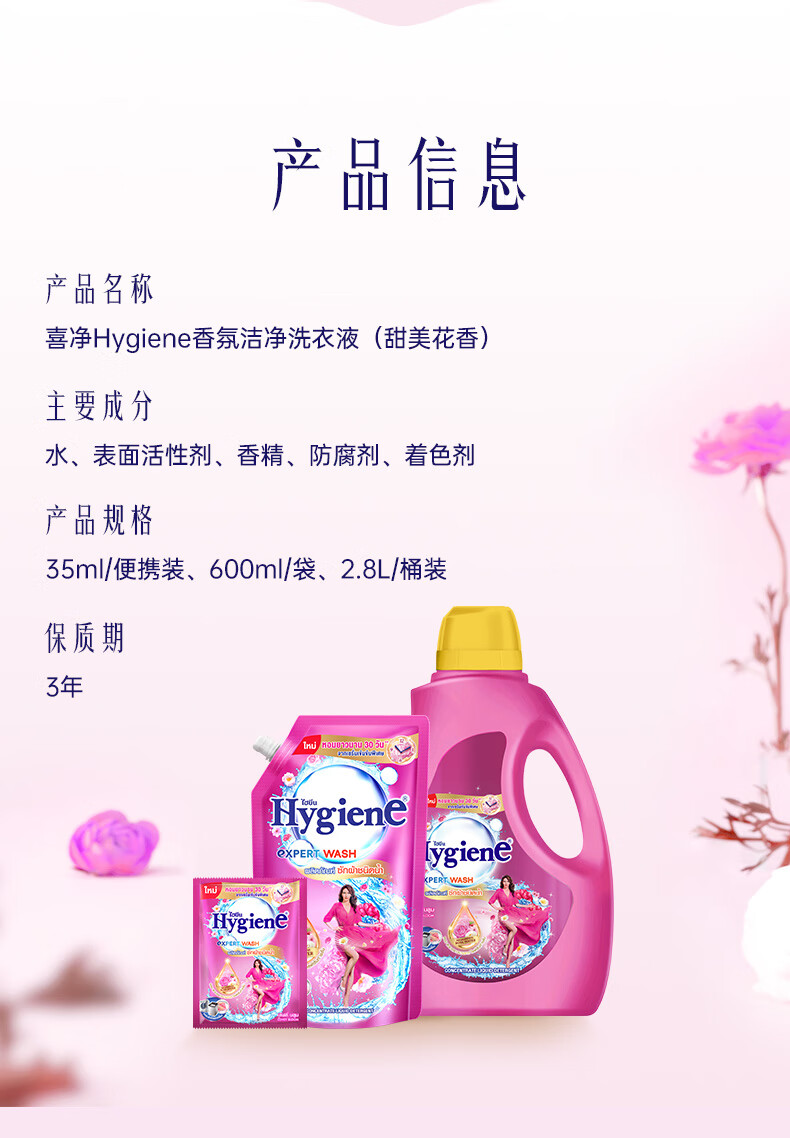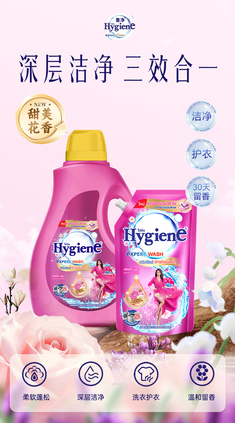 喜净Hygiene泰国原装进口洗衣液深层洁净去污柔顺温和亲肤留香 芍药盛放1.44L(1大袋+2小袋)