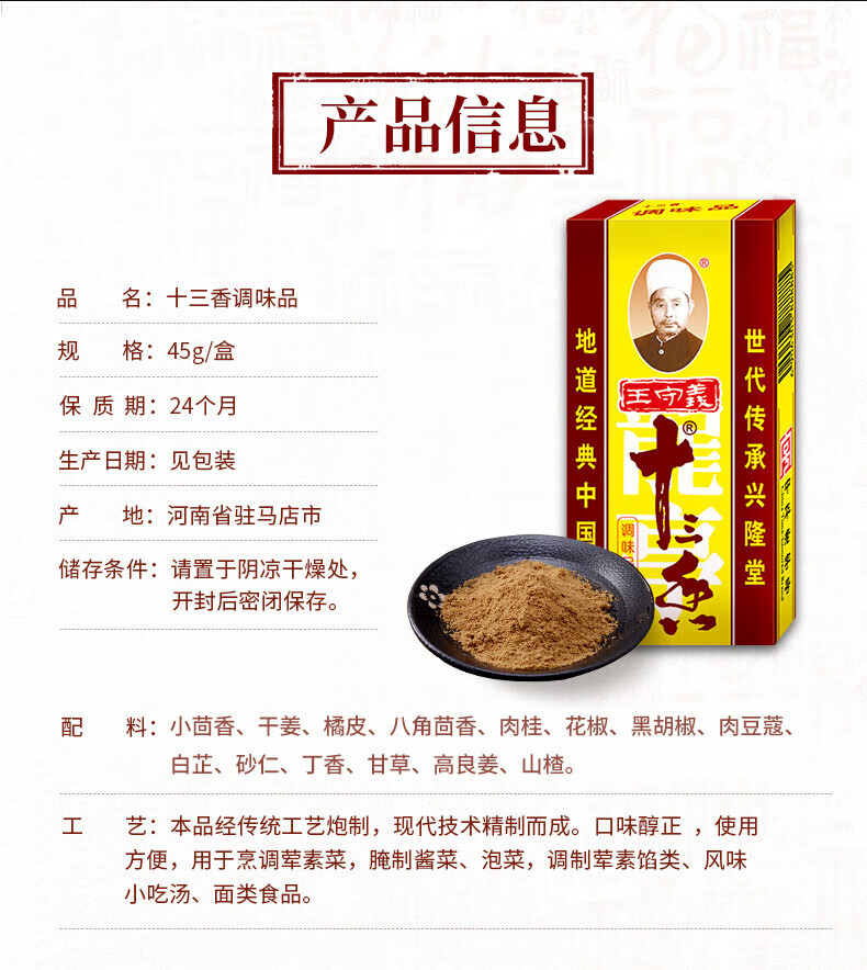 王守义 正宗王守义十三香45g家用商用烧菜烧烤炖肉调味品五香粉香辛调料 十三香45g【1盒】