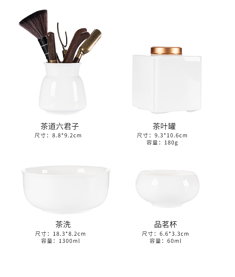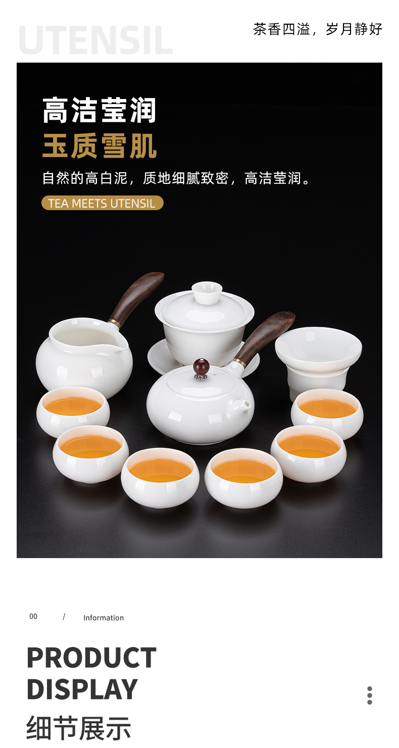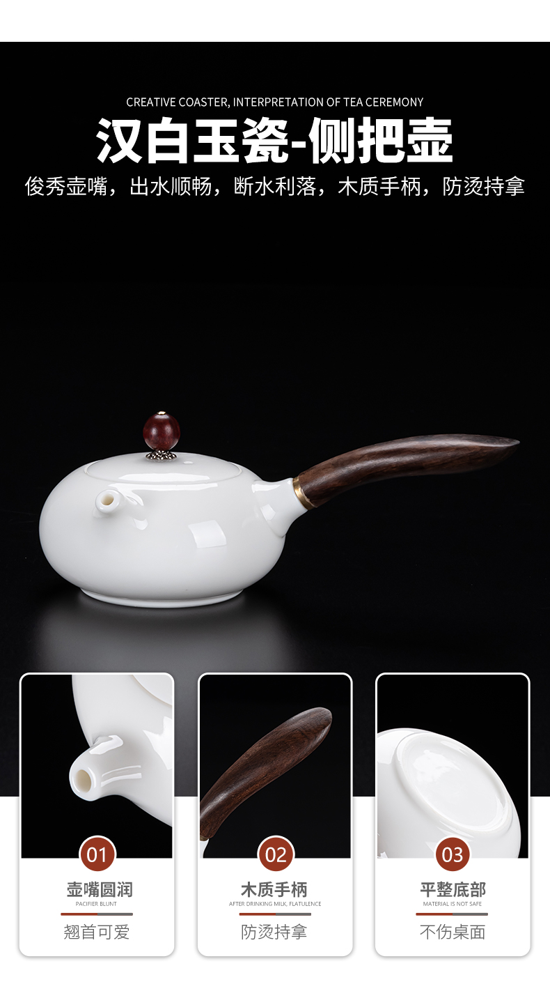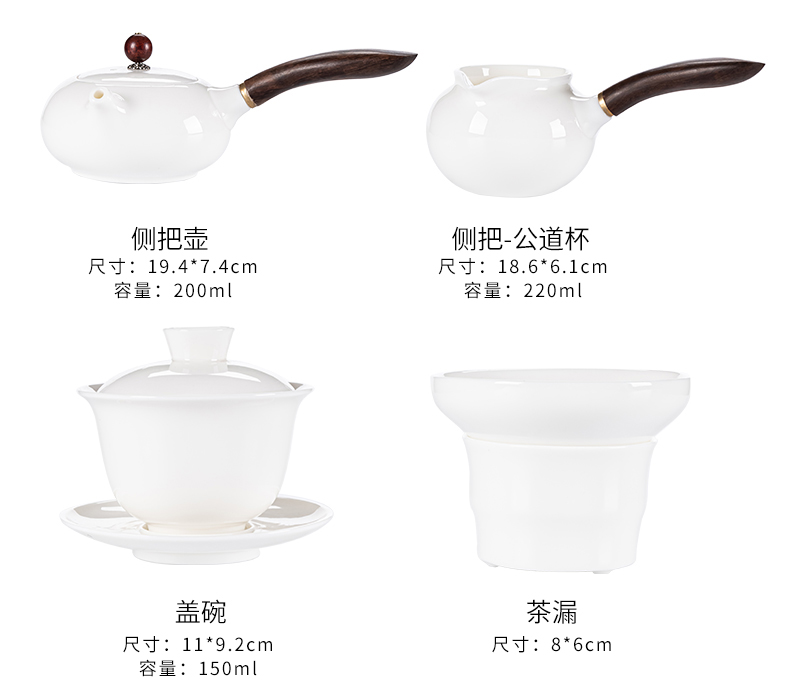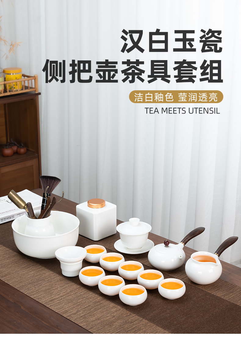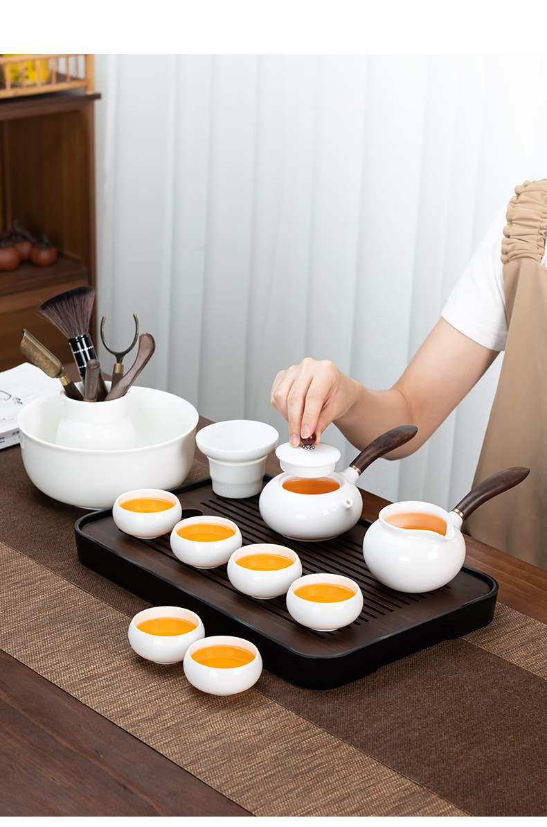 白瓷功夫茶具套装家用侧把德化高白玉瓷泡茶壶盖碗茶杯茶洗整套陶瓷描金 10头汉白玉(侧把-木)-罗汉杯-描金