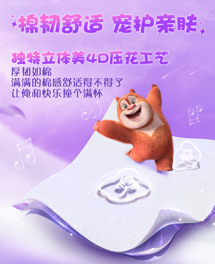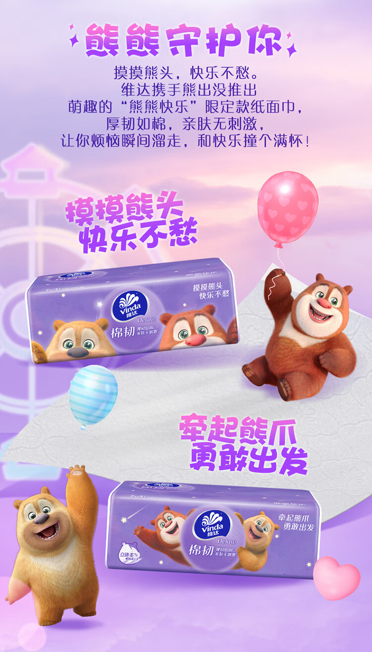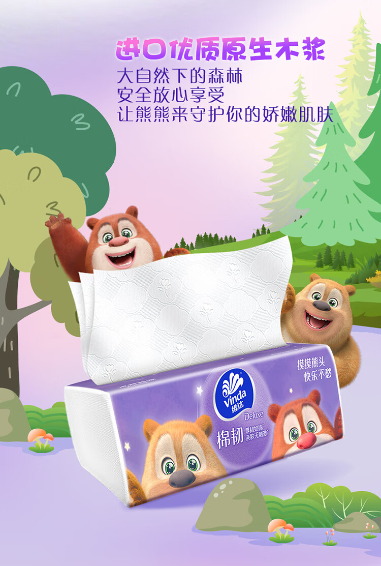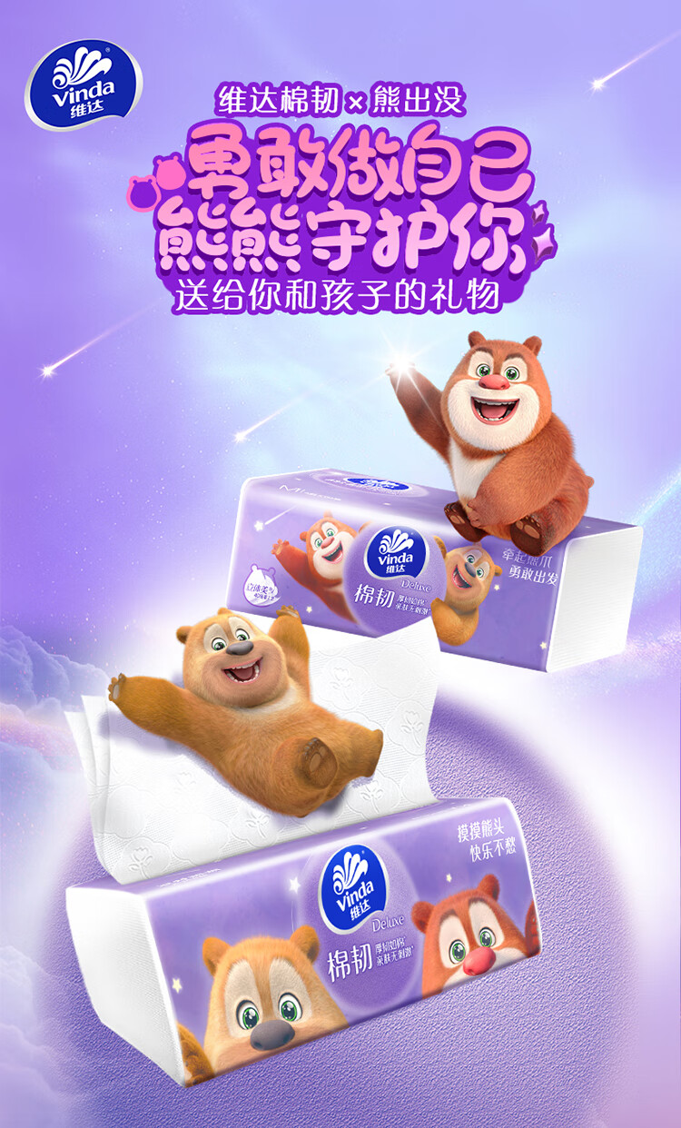 维达(Vinda)抽纸 棉韧压花M码大尺寸 熊出没联名餐巾纸擦手纸面巾 3层 90抽*54包 【到手3箱】