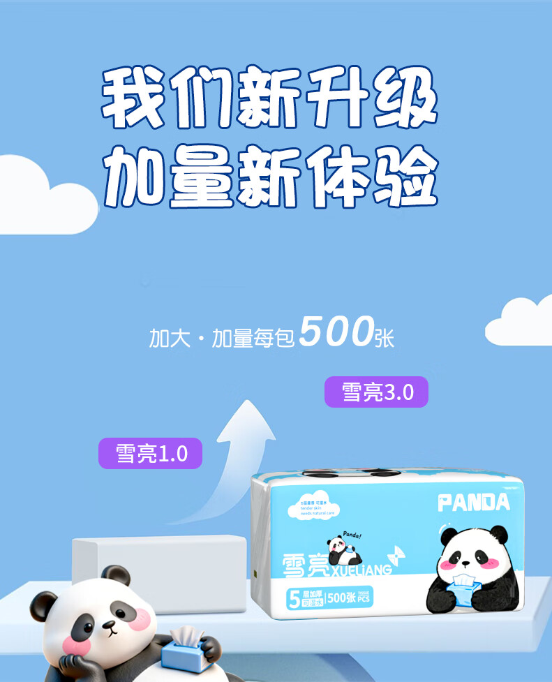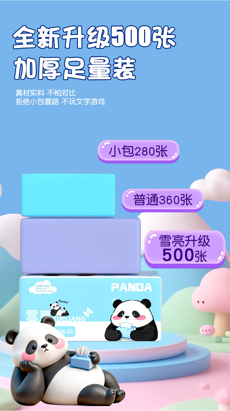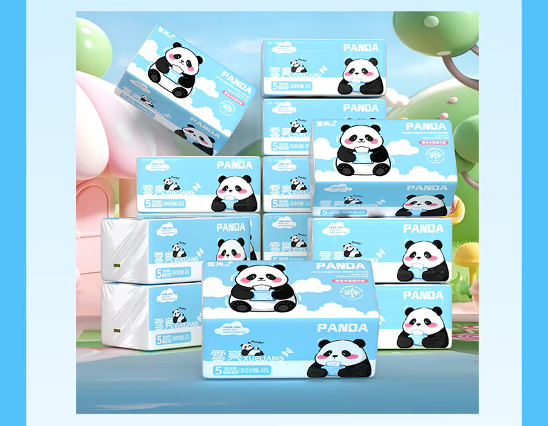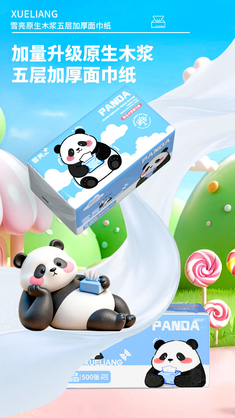 雪亮熊猫柔韧亲肤抽纸500张大包抽纸加厚家用纸面巾纸家用卫生纸 5层 500张*1包