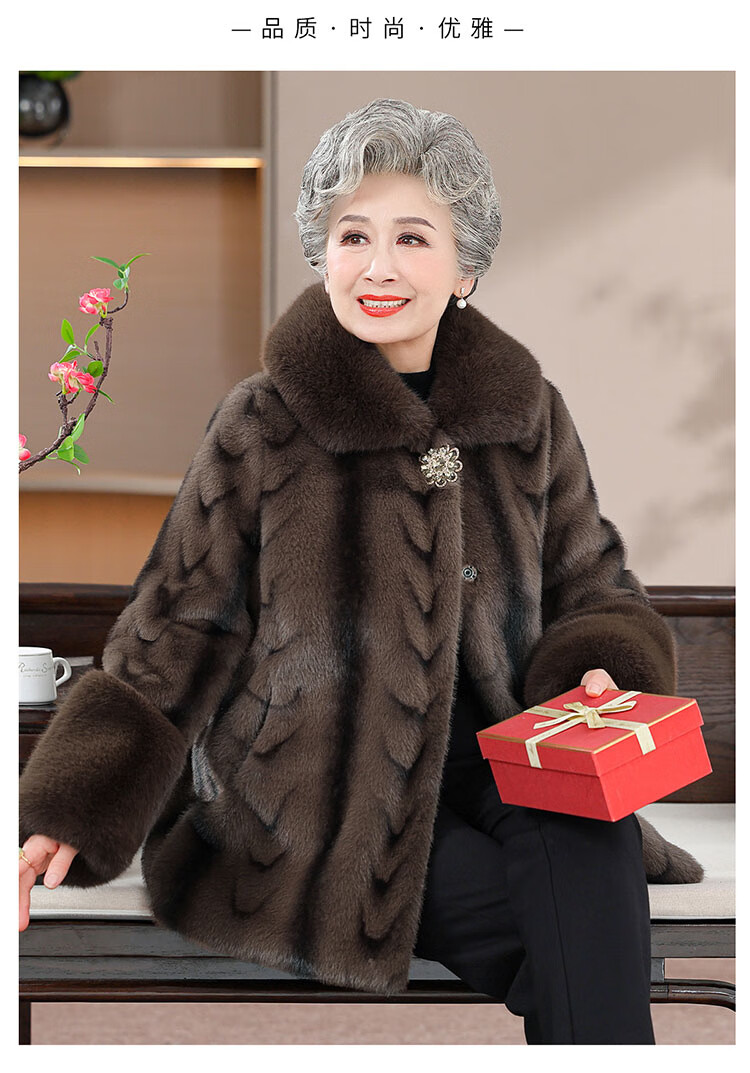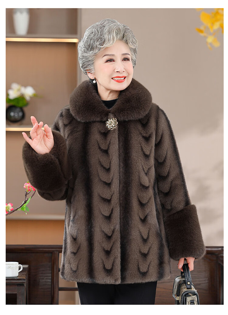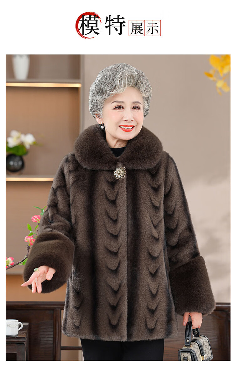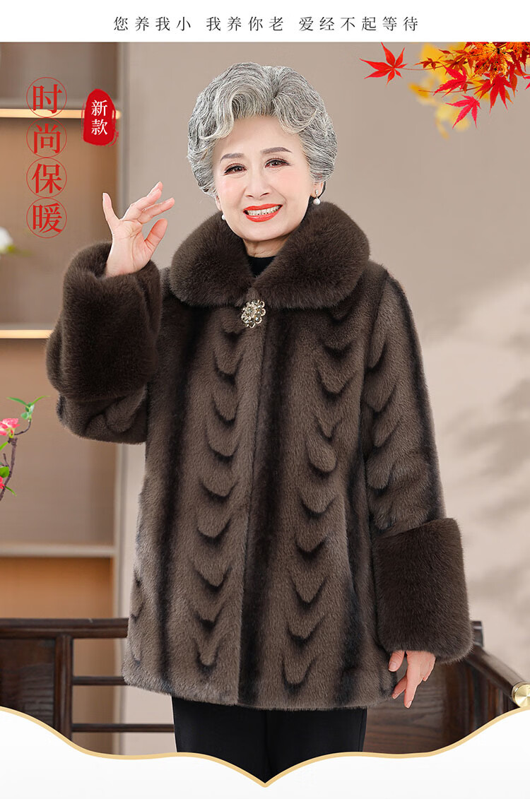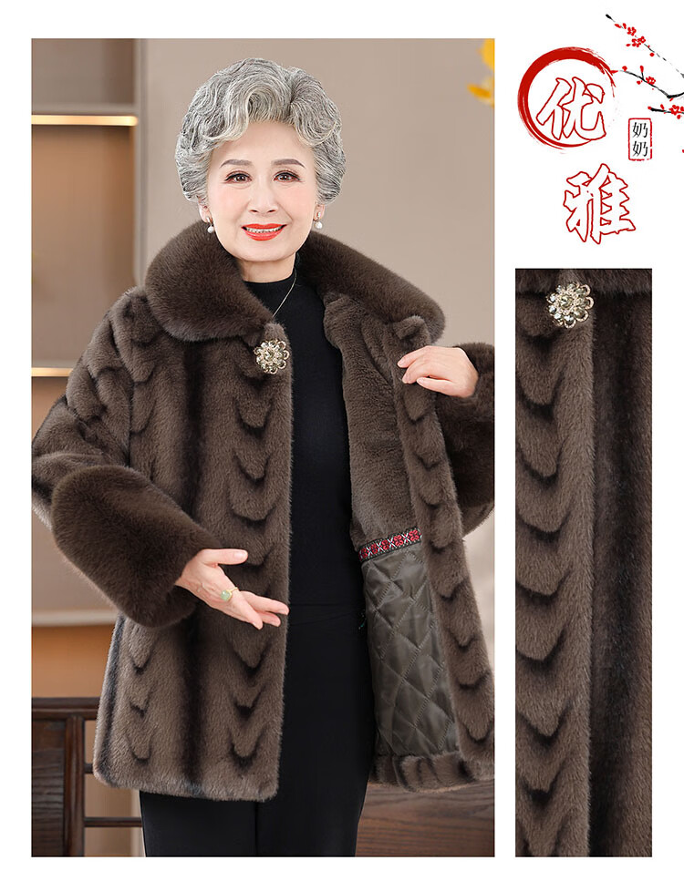 漫花格老年冬装女加绒加厚外套妈妈加绒仿皮草奶奶装冬季仿貂绒套装 咖啡色上衣+加绒裤 XL 建议85-105斤