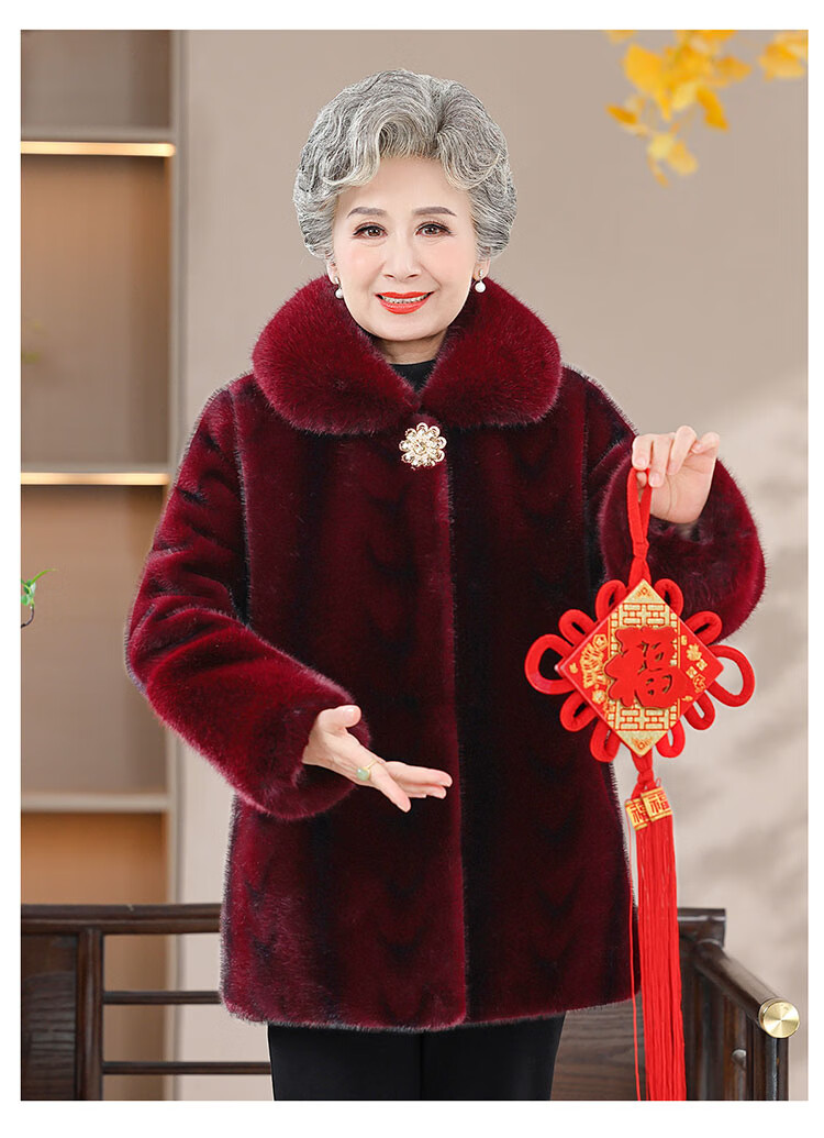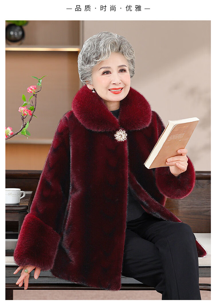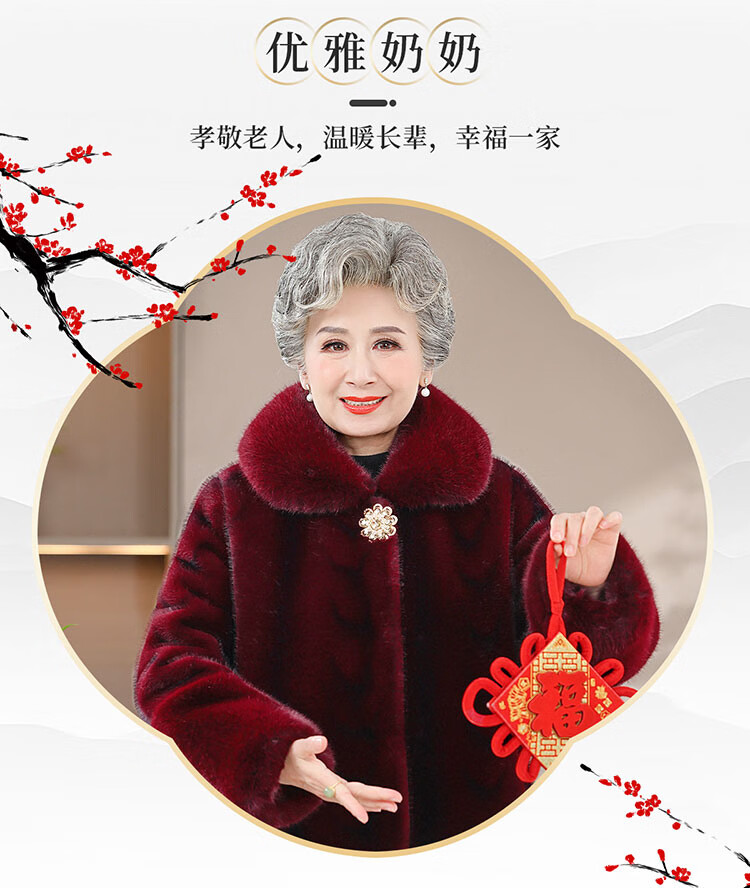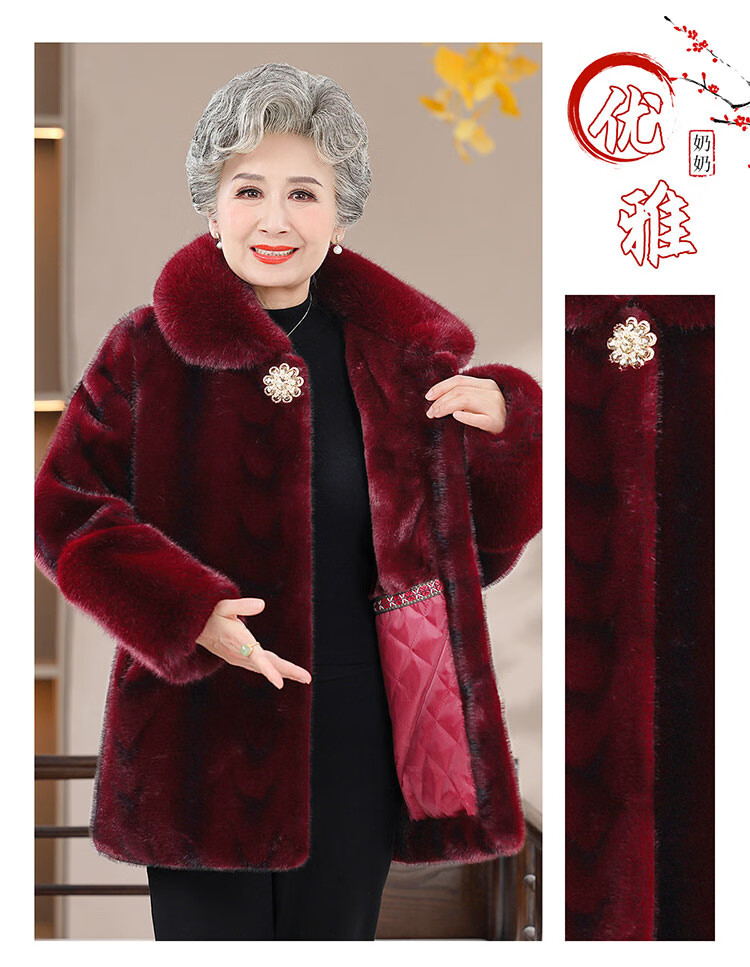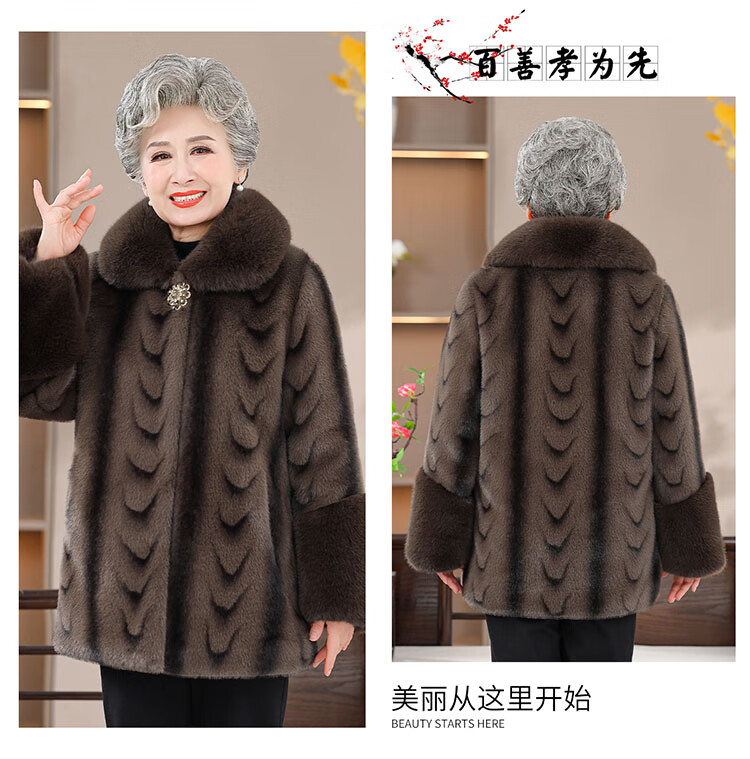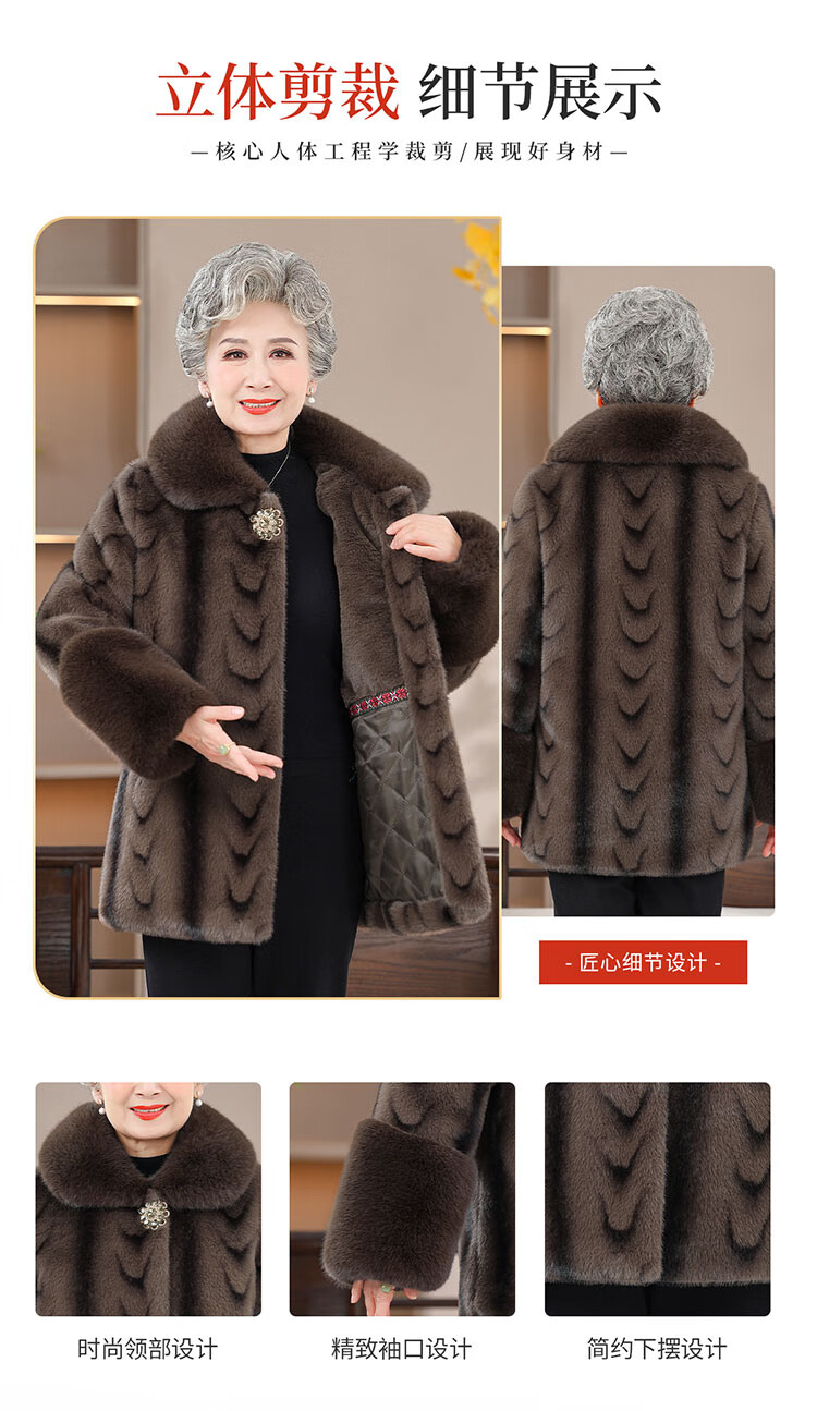 漫花格老年冬装女加绒加厚外套妈妈加绒仿皮草奶奶装冬季仿貂绒套装 咖啡色上衣+加绒裤 XL 建议85-105斤