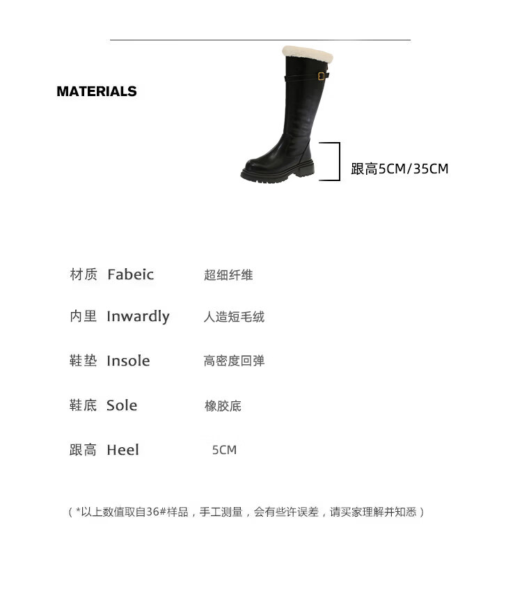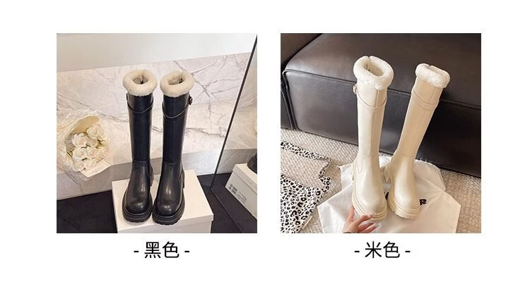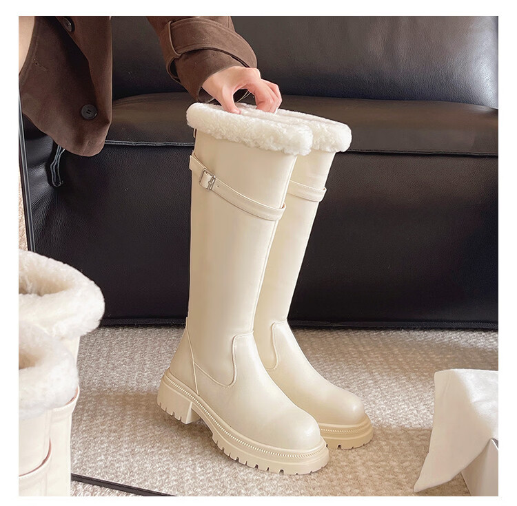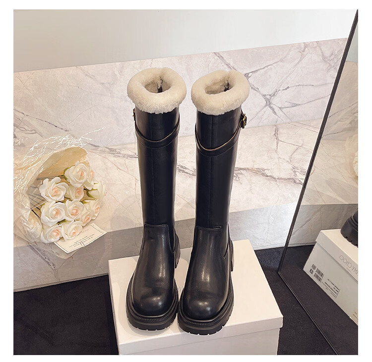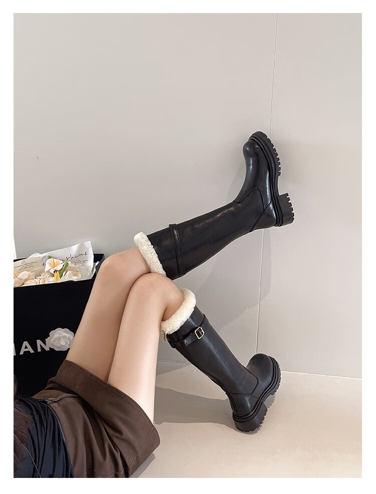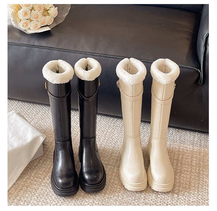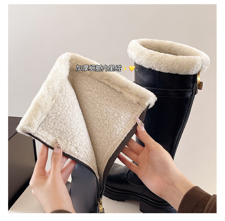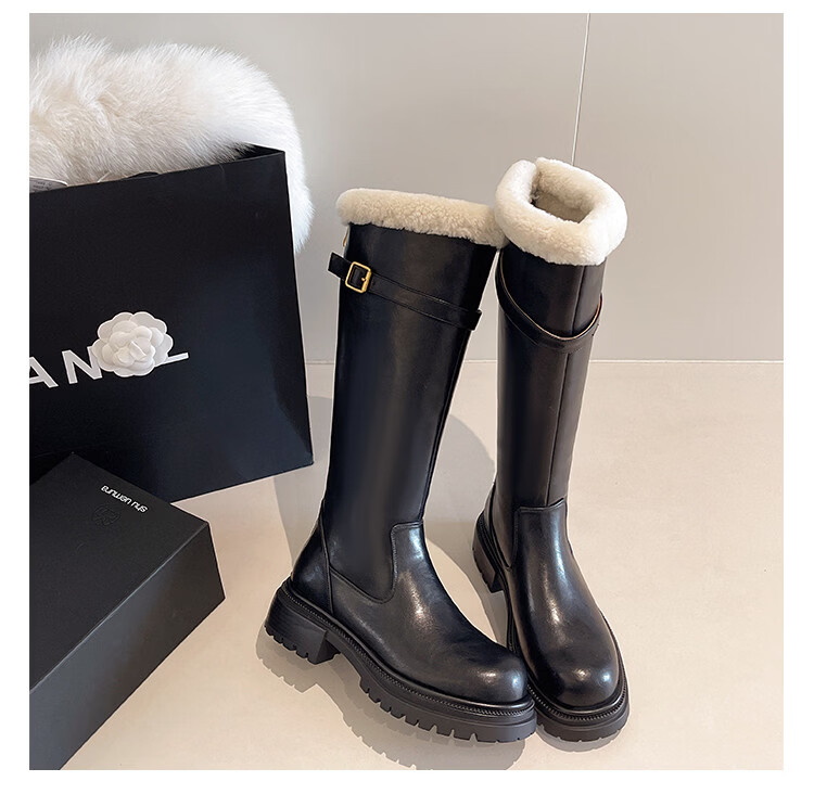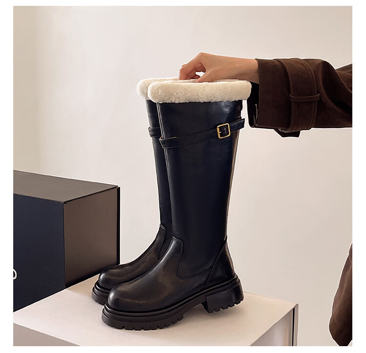 稻草人(MEXICAN)ins黑色加绒高筒靴女秋冬保暖羊羔毛不过膝长靴厚底白色骑士靴潮 黑色加绒款 35