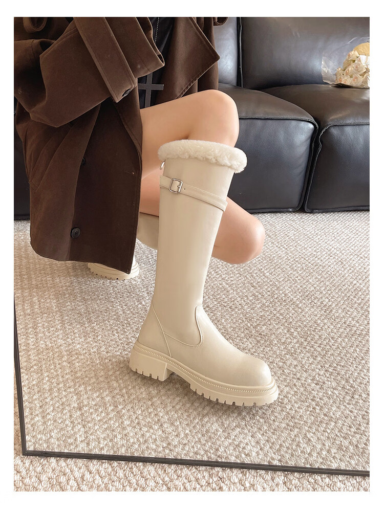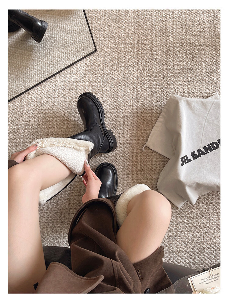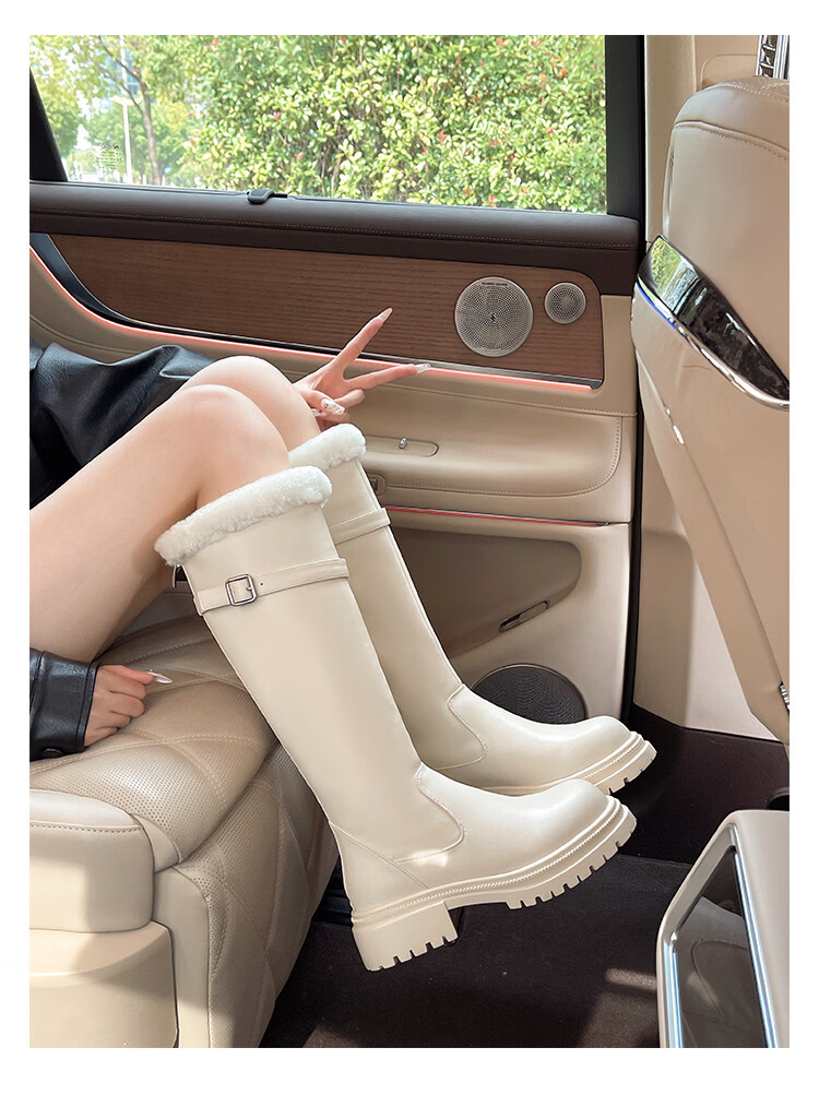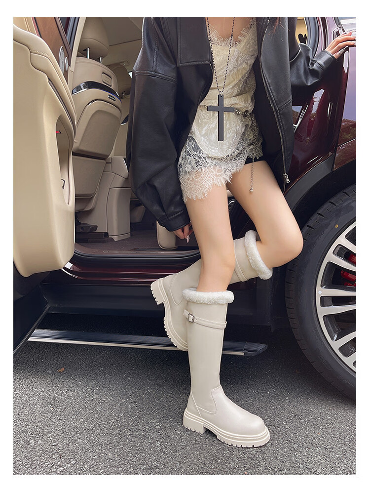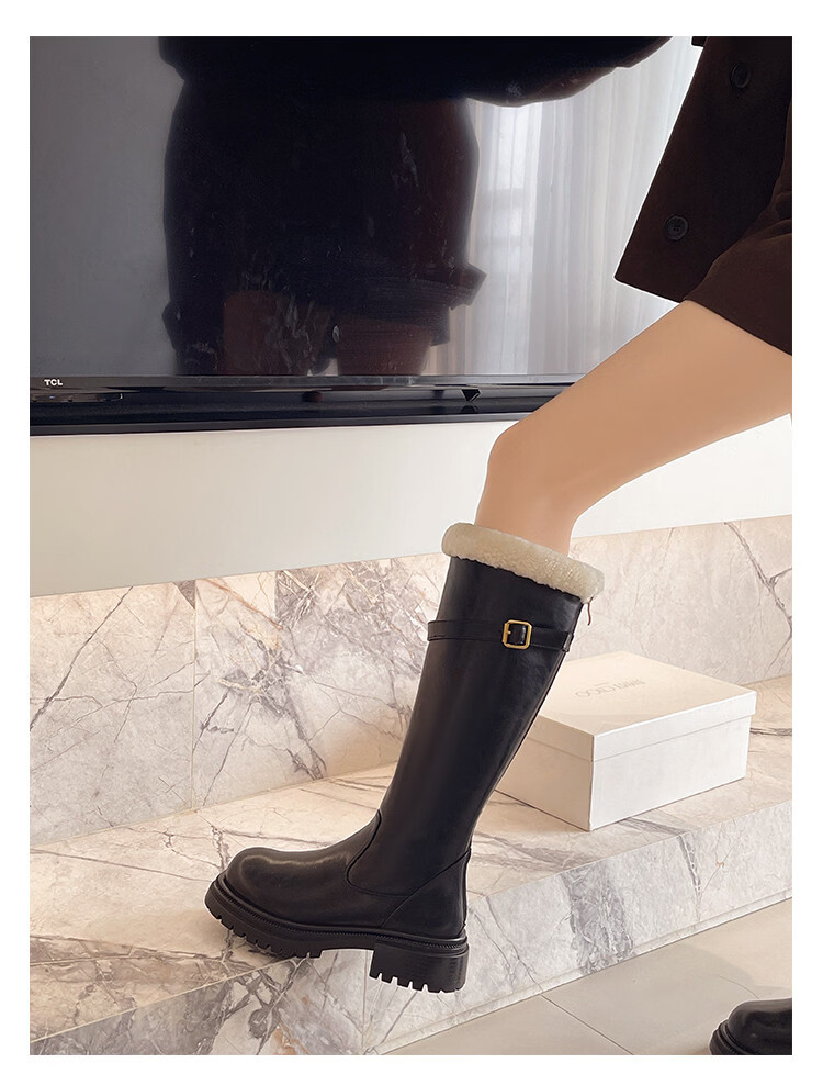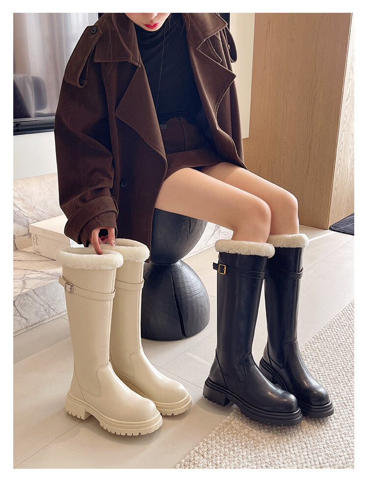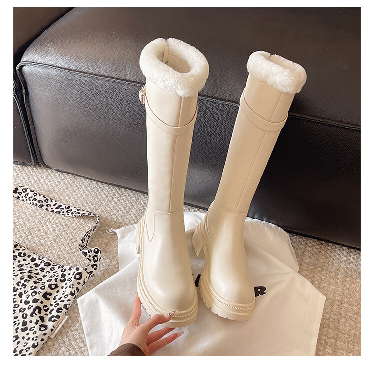 稻草人(MEXICAN)ins黑色加绒高筒靴女秋冬保暖羊羔毛不过膝长靴厚底白色骑士靴潮 黑色加绒款 35