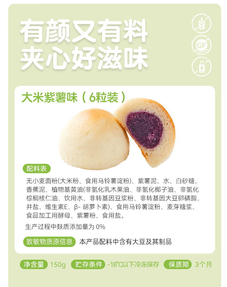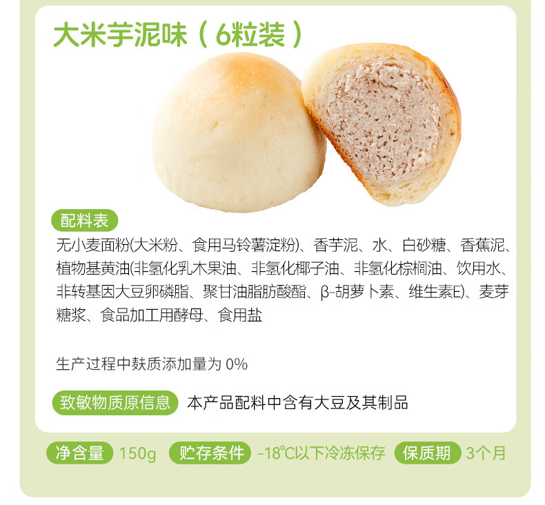 佑儿圆无麸质大米夹心Q包150g无蛋奶孩子早餐 独立无麸质生产线 芋泥味(6粒装)