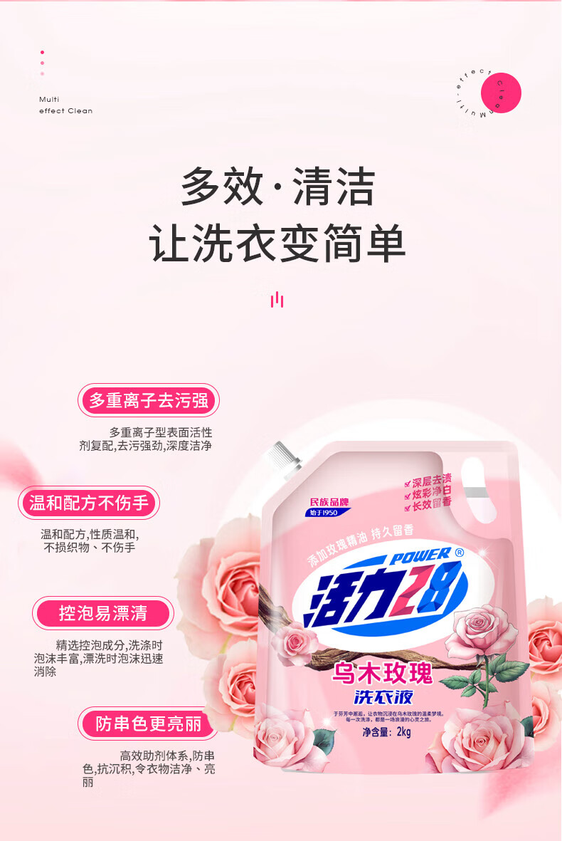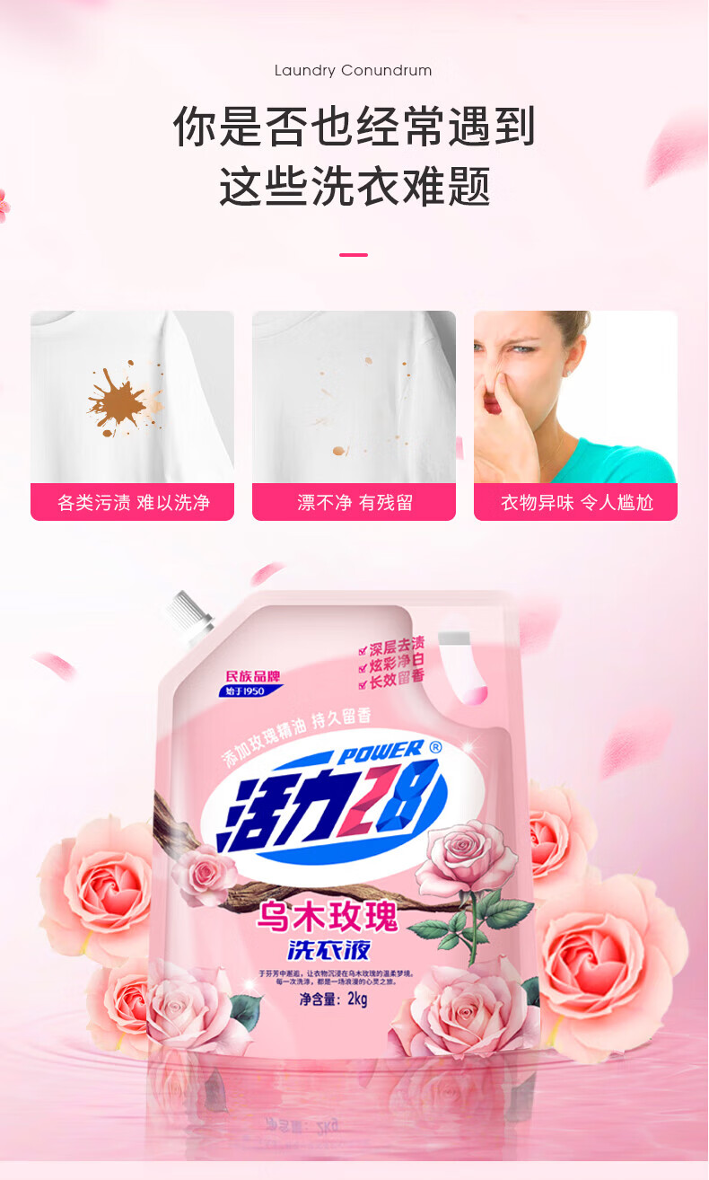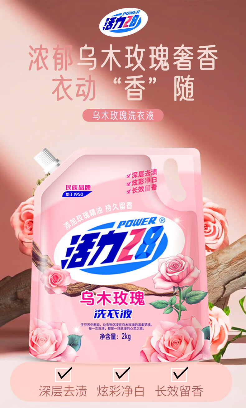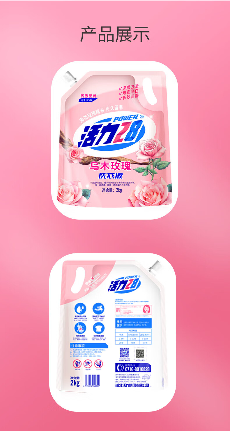 活力28洗衣液2kg 衣物去渍去污持久留香型 袋装补充装家庭装 整箱批发 乌木玫瑰洗衣液2kg