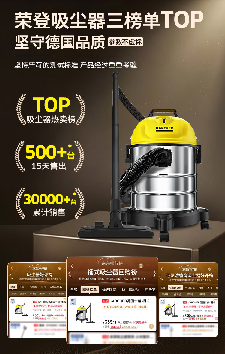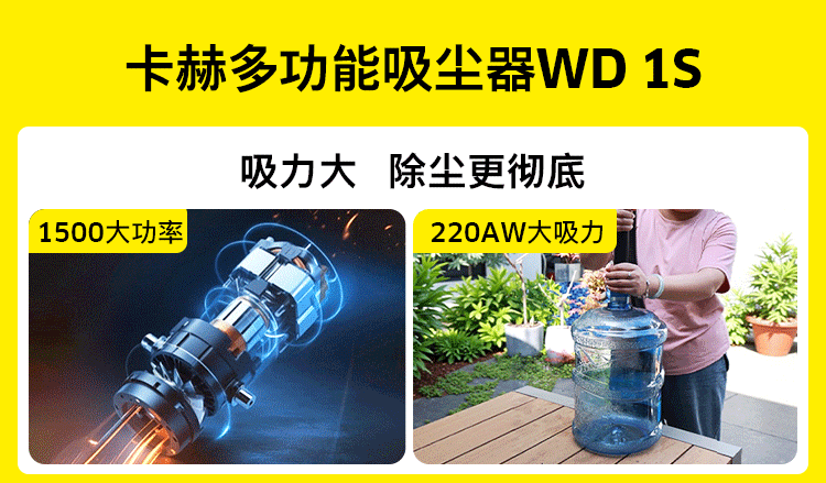 KARCHER德国卡赫 桶式吸尘器18L干湿吹三用家用工业开荒装修保洁地毯宠物大容量大功率超强大吸力WD1s