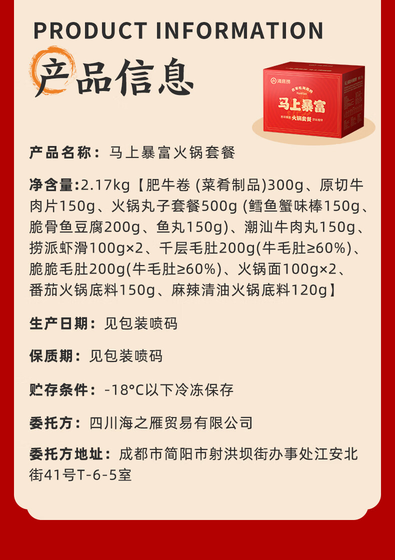 海底捞马上暴富火锅套餐礼盒2170g 10荤2主食2底料4-6人食新年马年礼盒