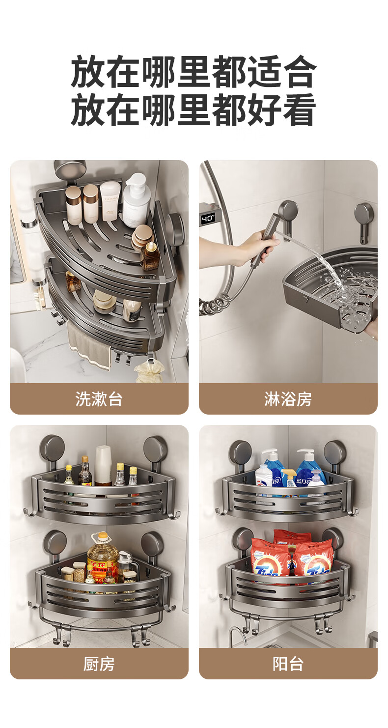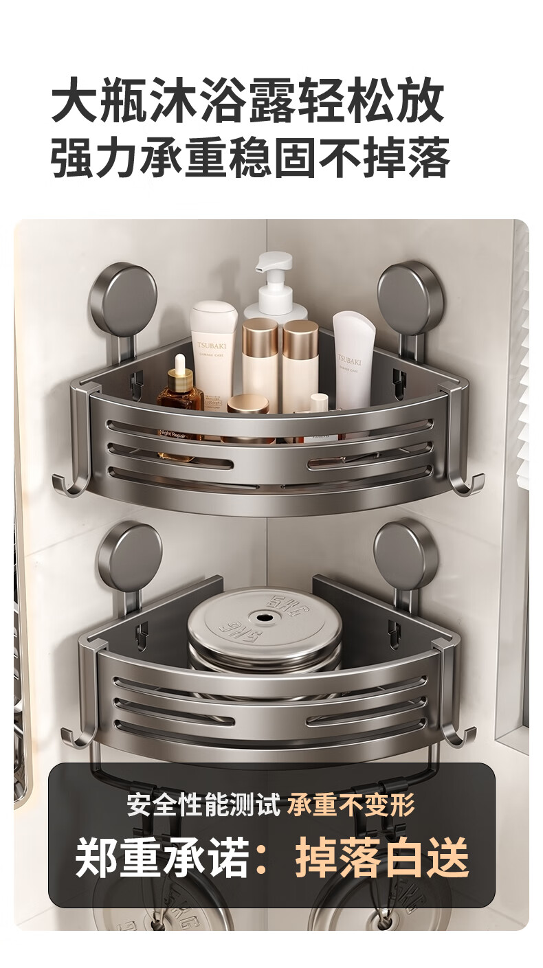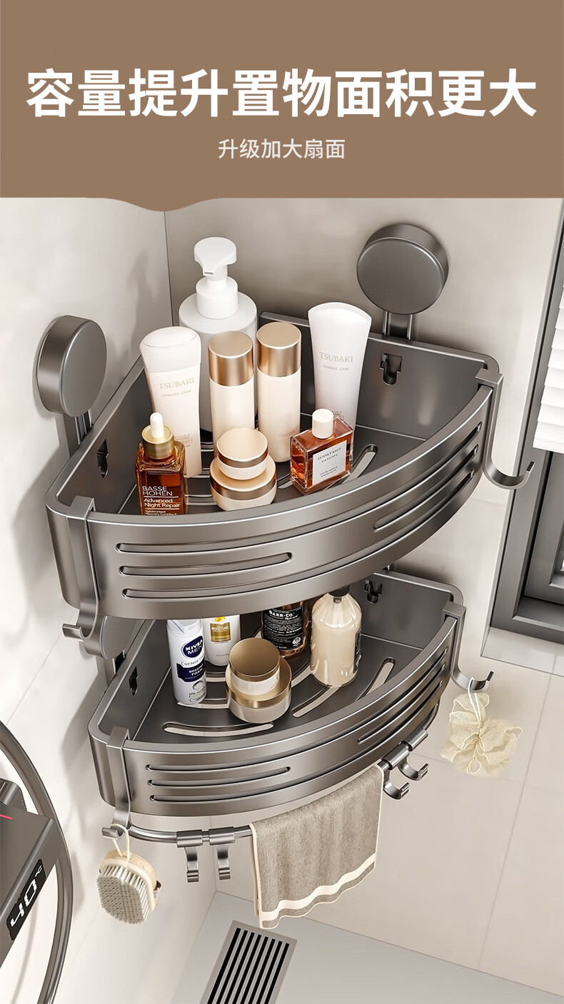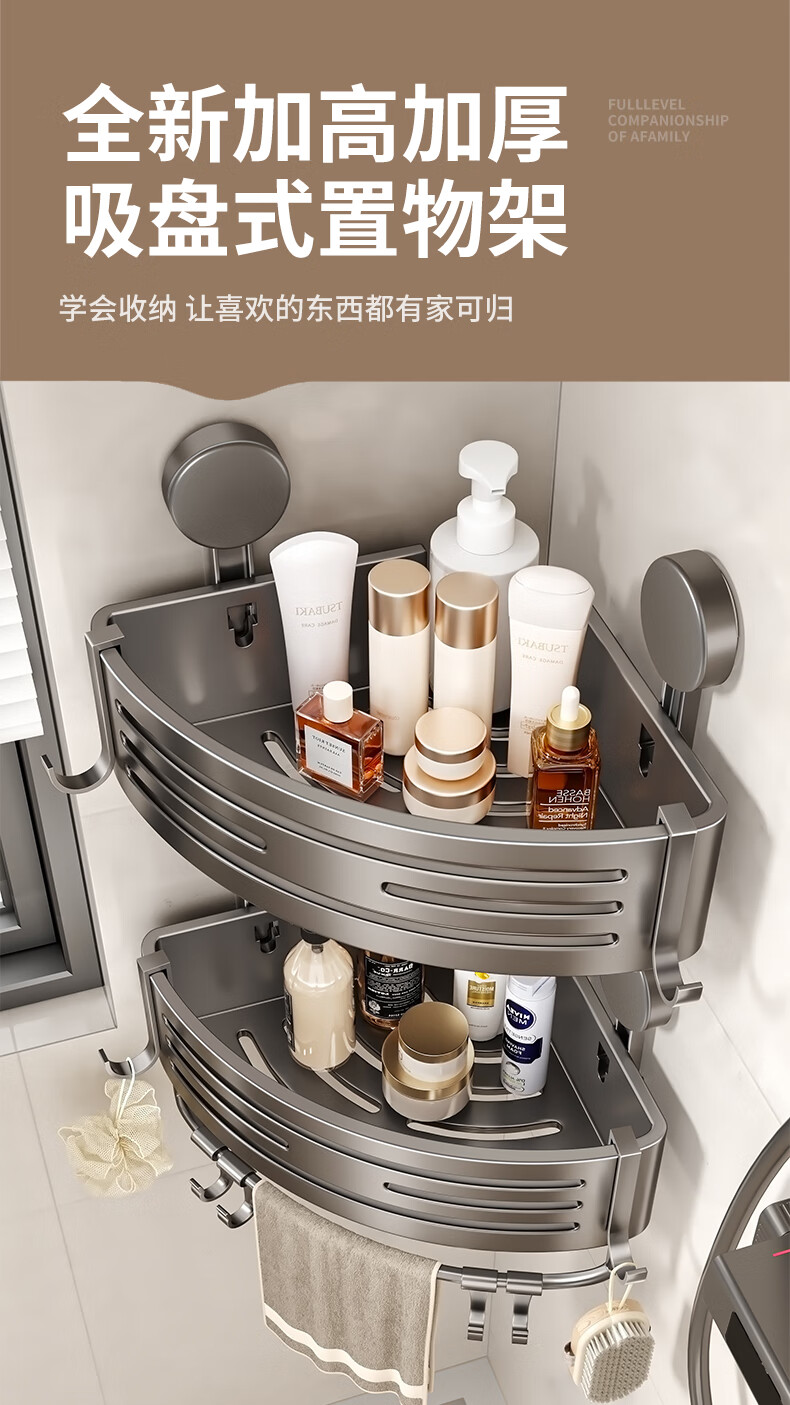 妃驰卫生间置物架吸盘免打孔浴室三角厕所洗漱台转角洗手间收纳架子灰 【加高加厚】吸盘双层四方架