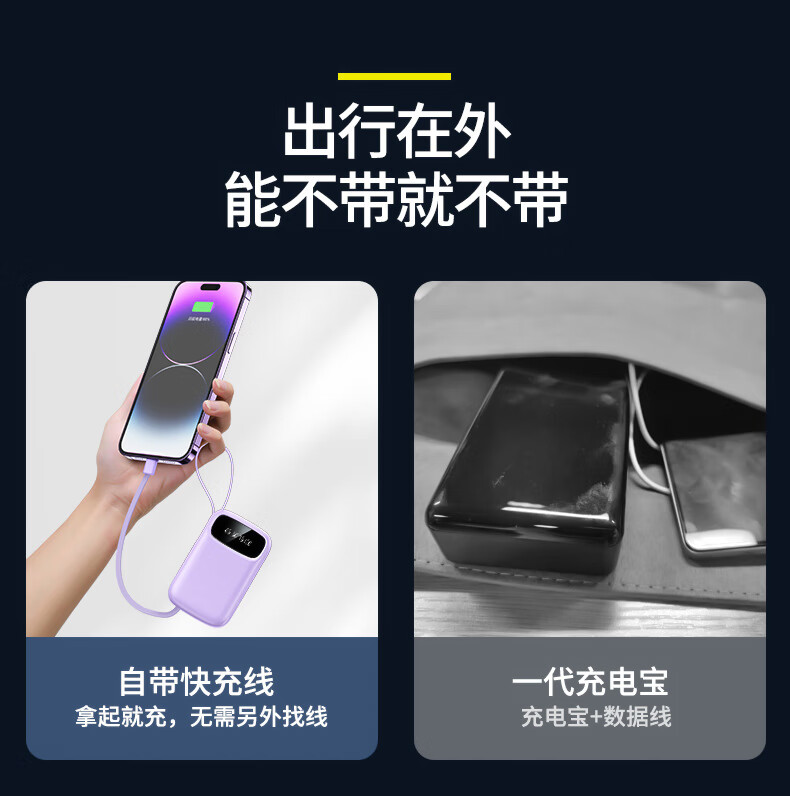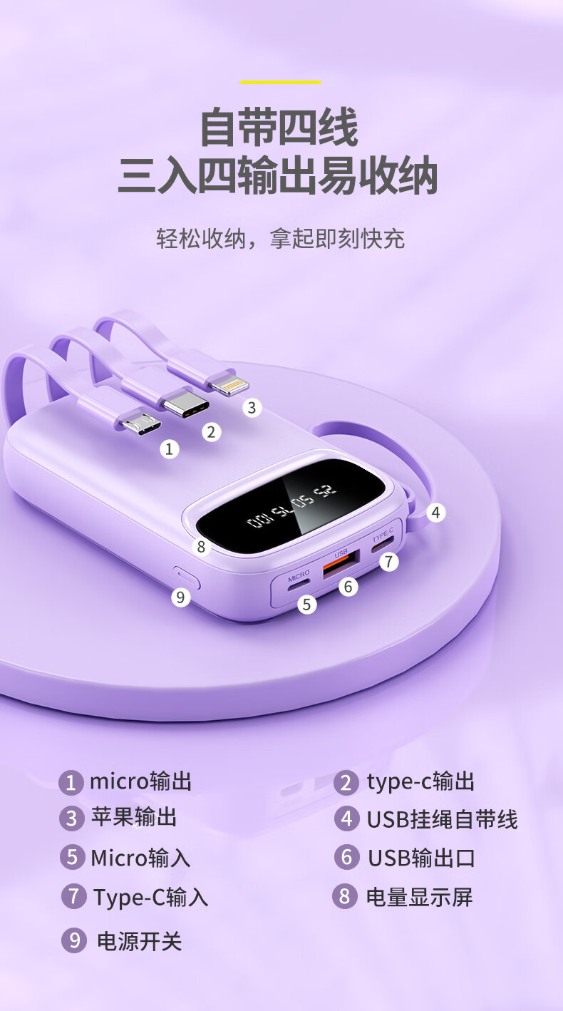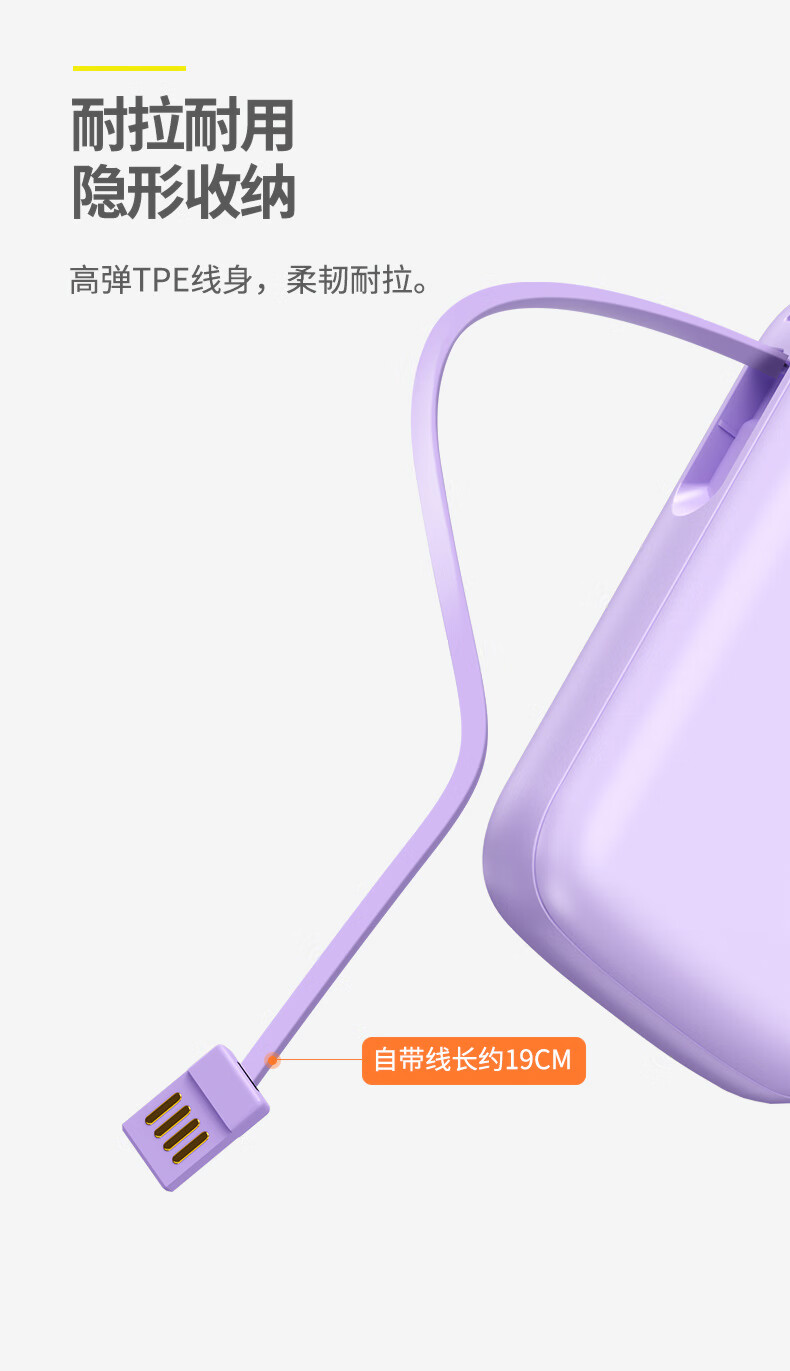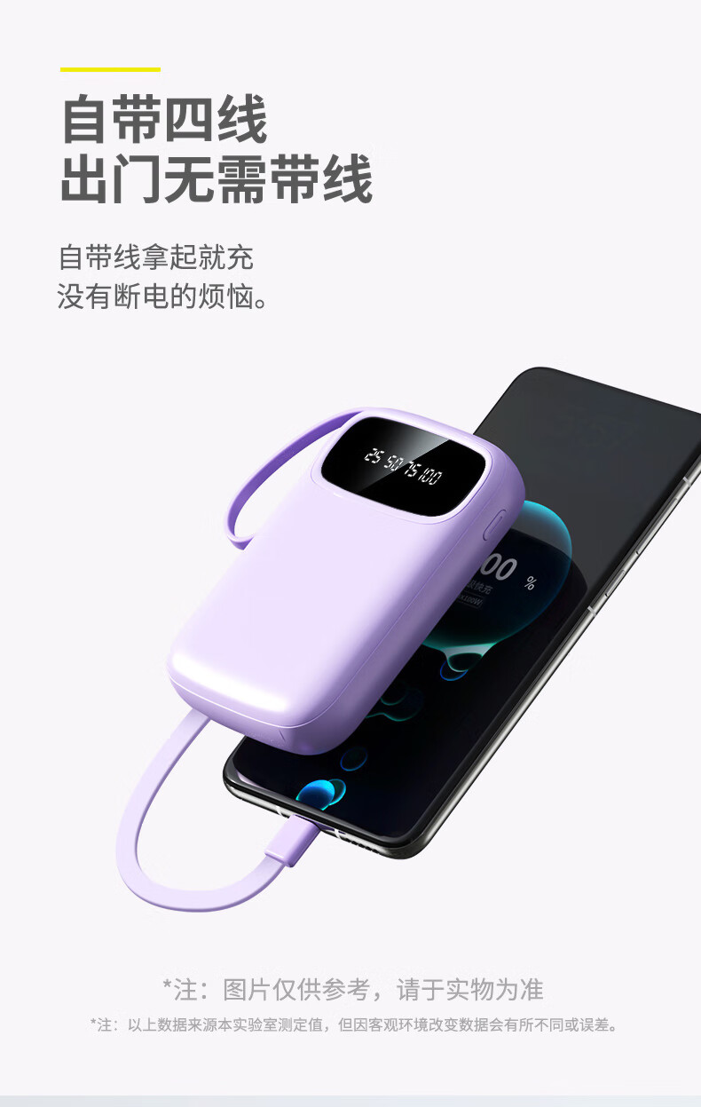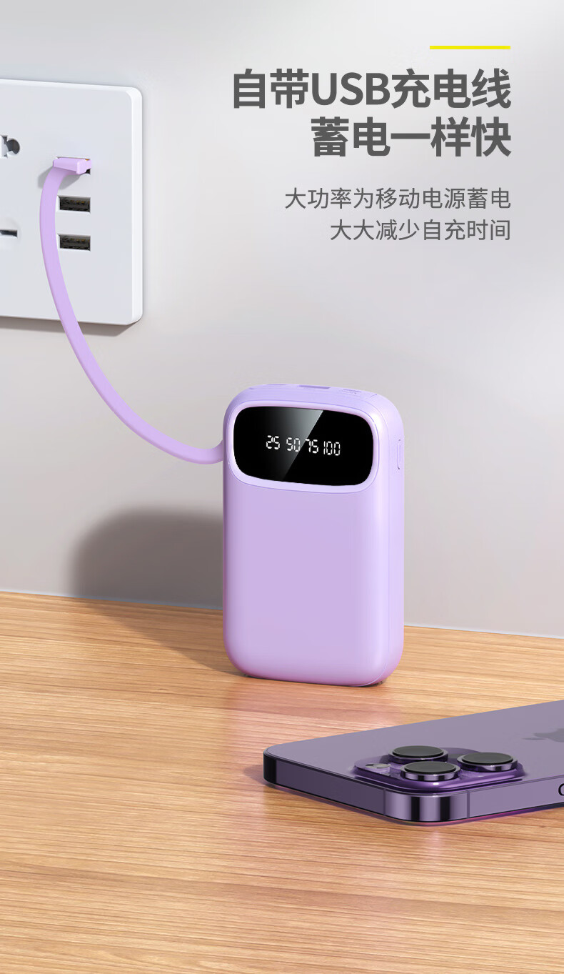 铁达信国标3c认证充电宝 自带线快充10000毫安 迷你超薄便携移动电源可上飞机苹果16/17安卓华为小米vivo 新品【紫色/旗舰版/进口电芯】自带4线