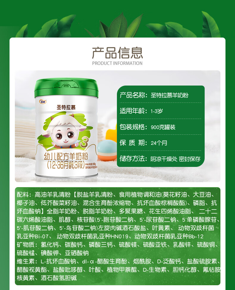 圣特拉慕3段婴幼儿配方羊奶粉900g/罐 圣元优博纯羊乳小分子 易吸收低致敏 3段 (12-36月龄) 900g 1罐 (新国标)
