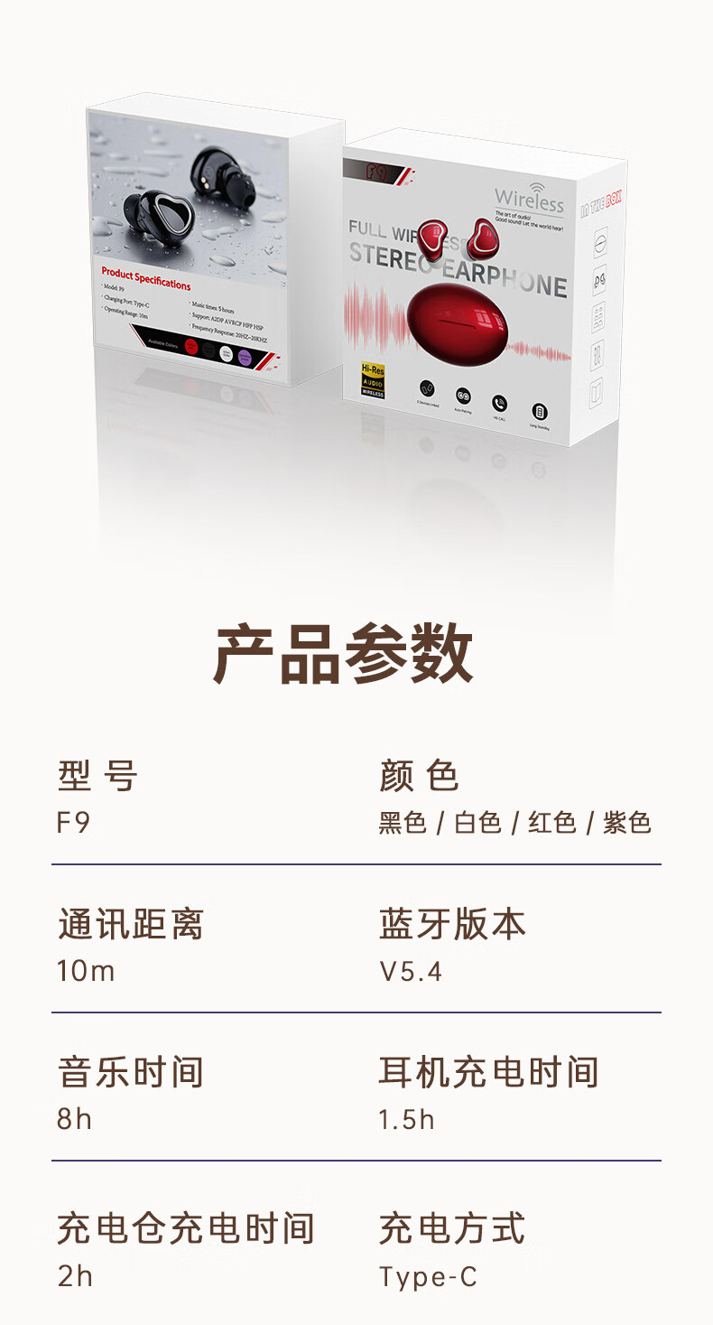跨境新款私模TWS无线迷你小巧5.4入耳式一拖二超长续航蓝牙耳机 红色F9