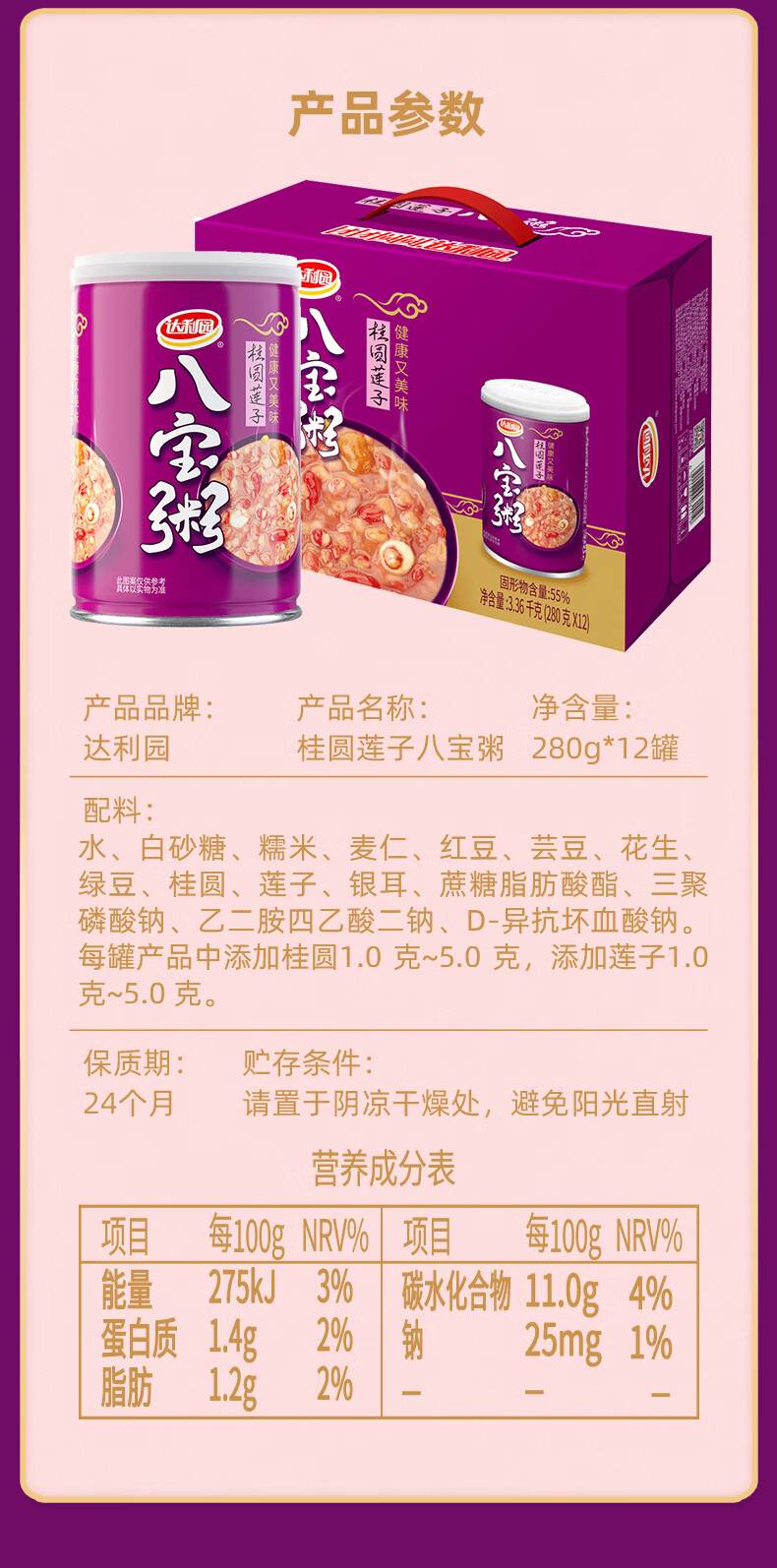 达利园桂圆莲子八宝粥年货送礼速食早餐粥即食罐头280g*12罐整箱礼盒装