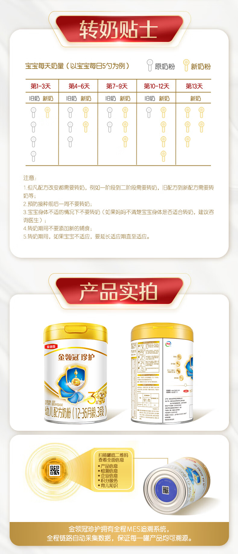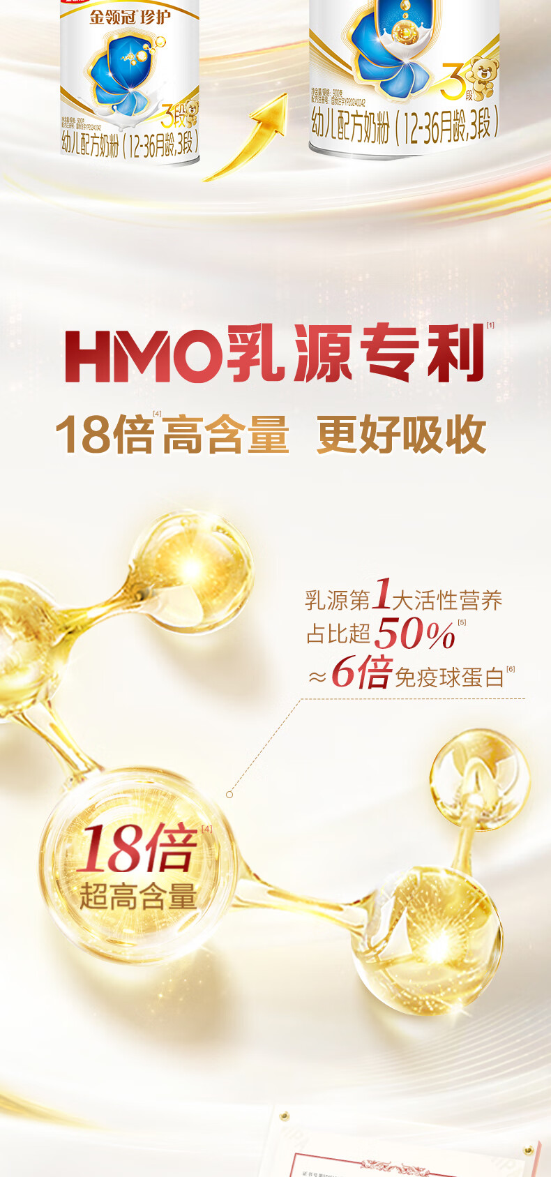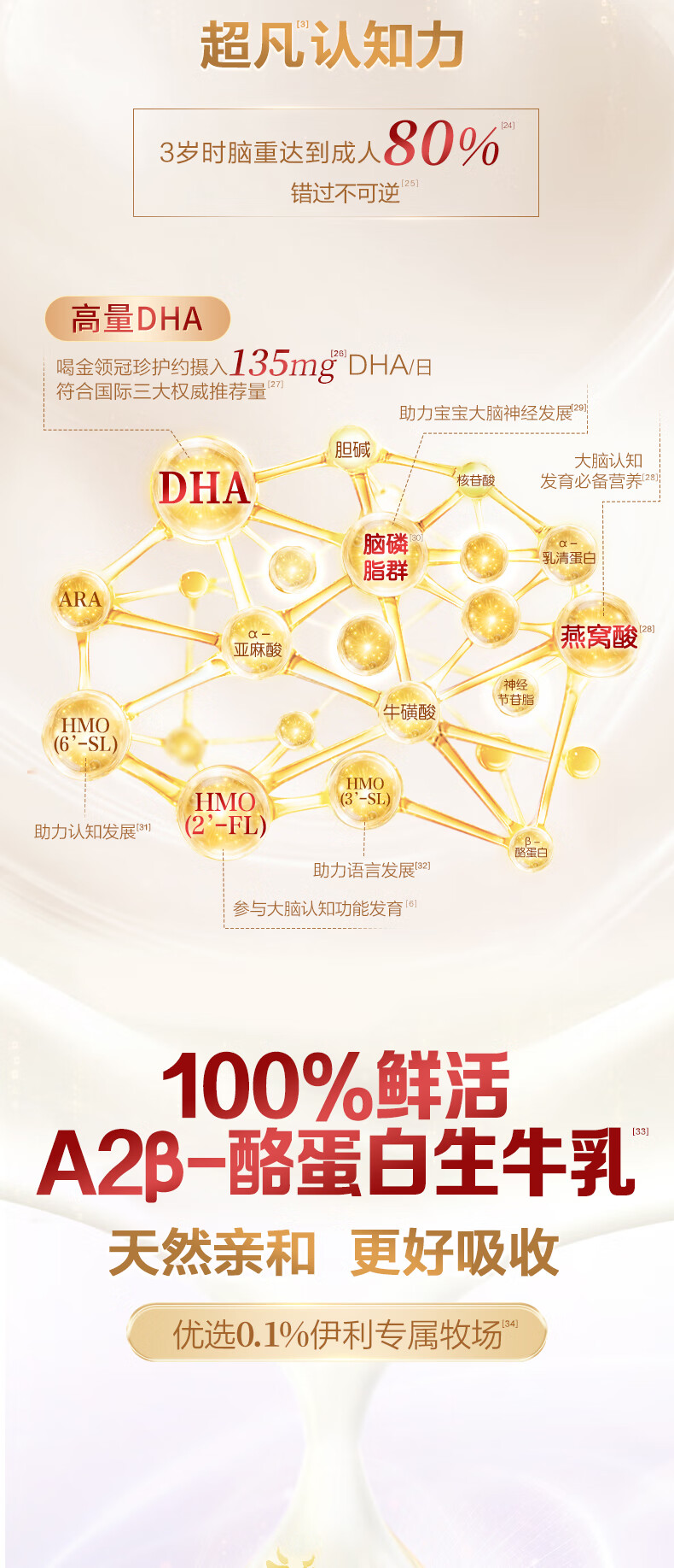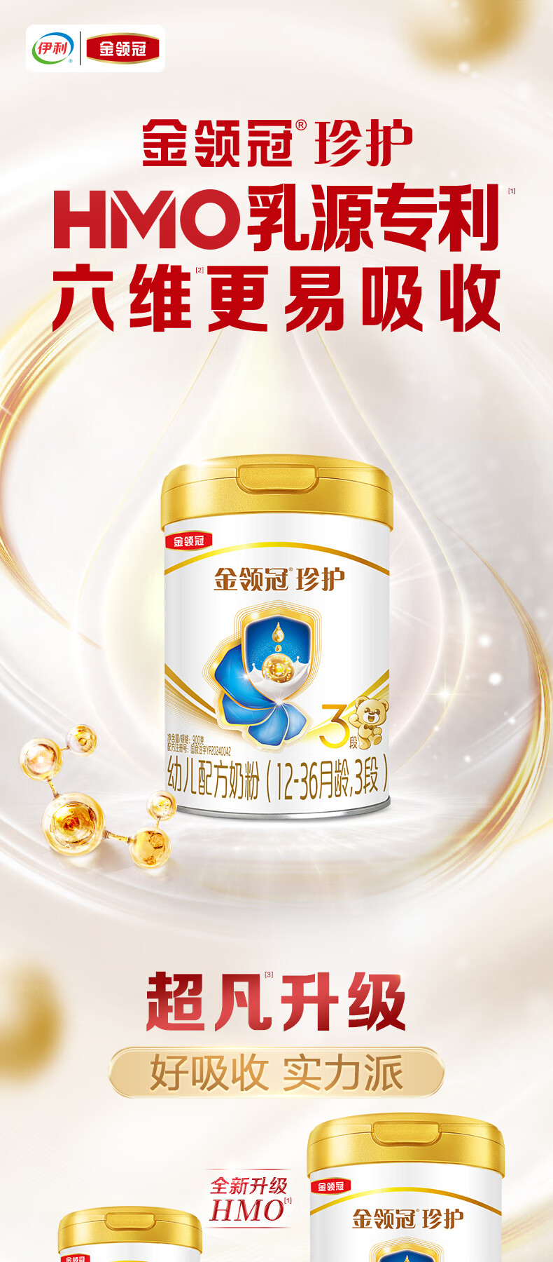 伊利金领冠珍护【三代OPO好吸收】幼儿A2β-酪蛋白奶粉3段(1-3岁)900g