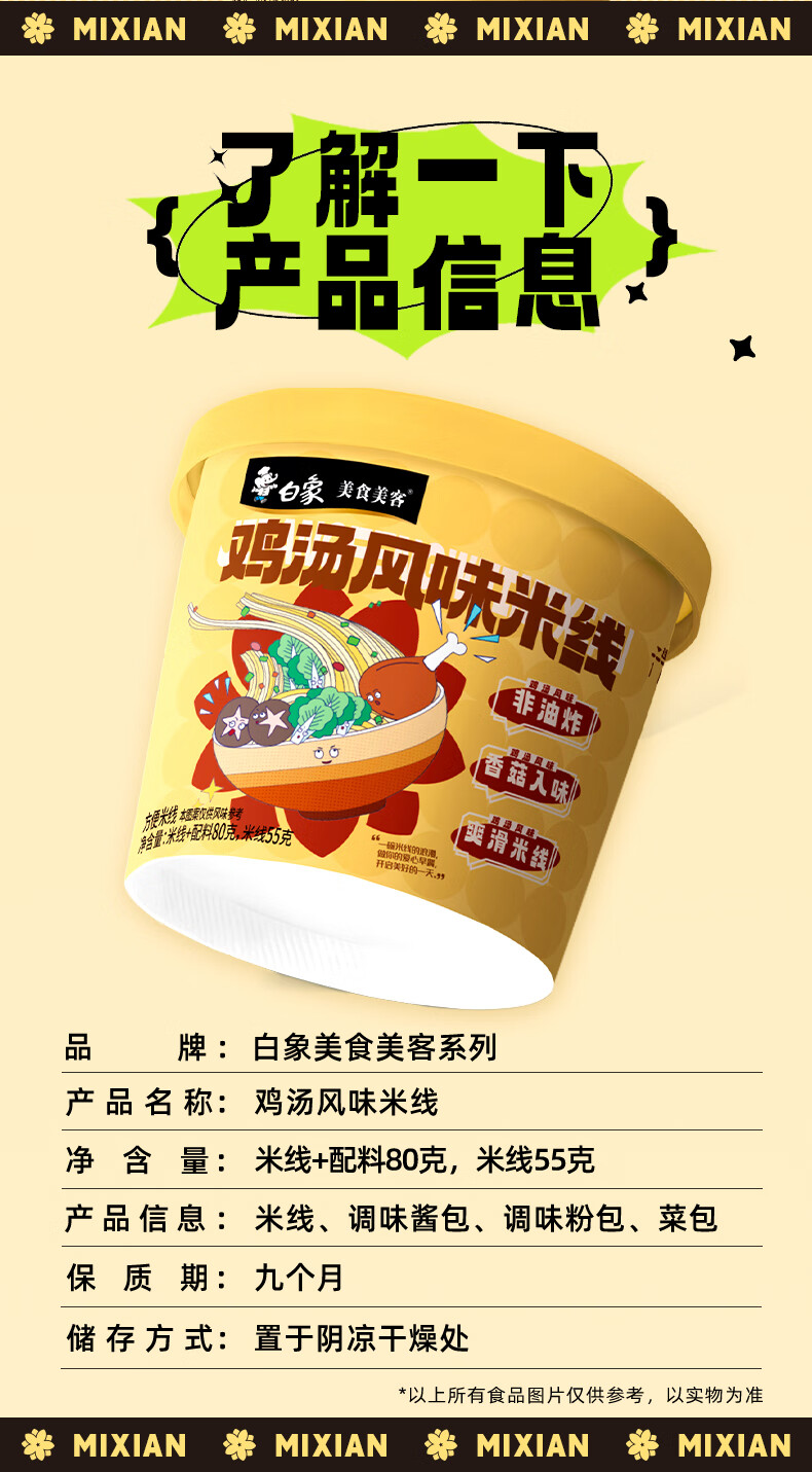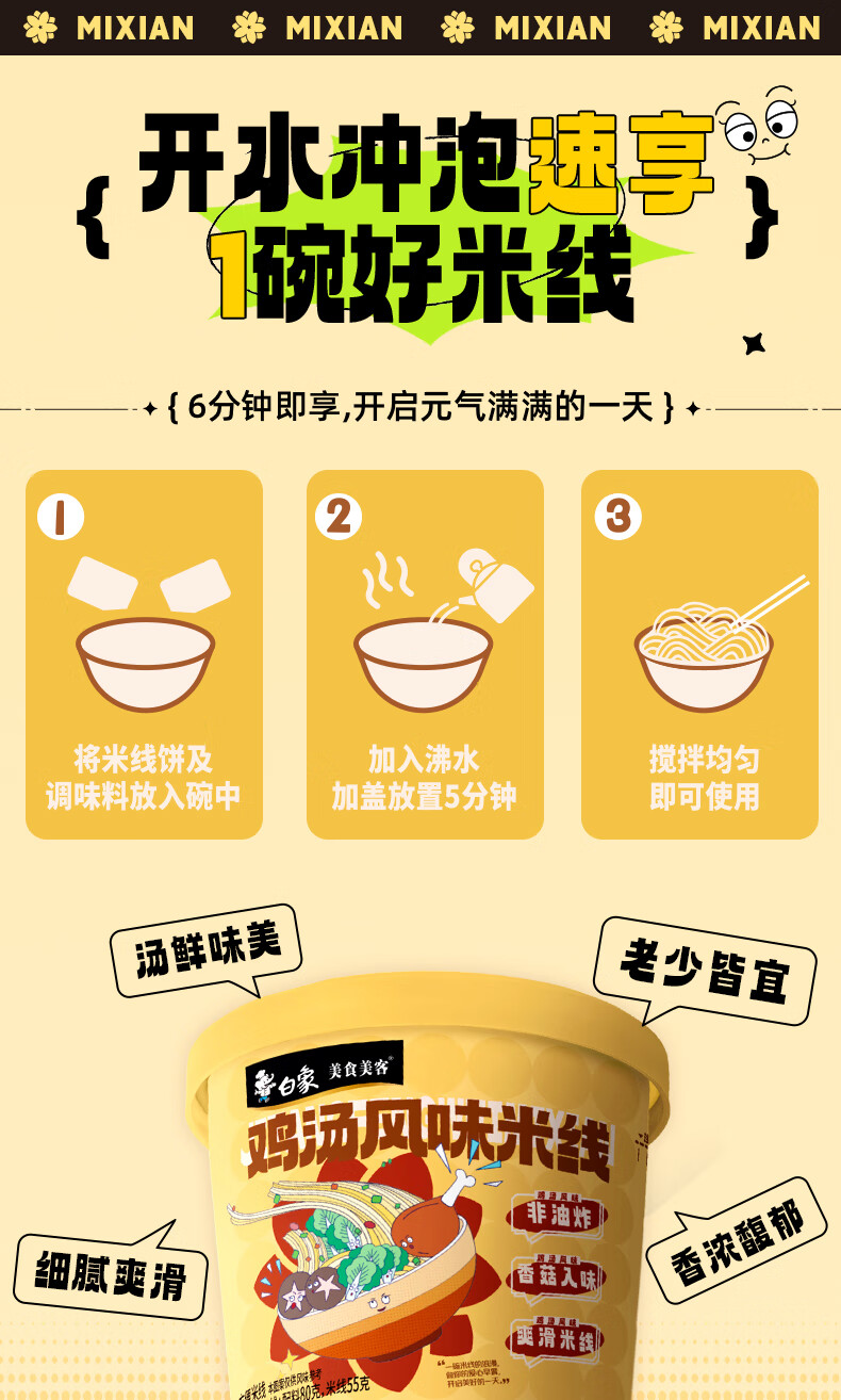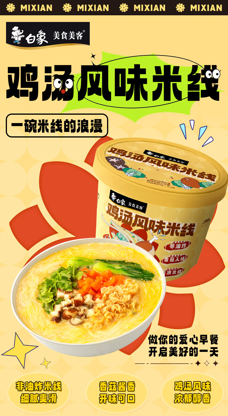 白象美食美客鸡汤风味米线整箱桶装方便速食冲泡米线夜宵休闲食品 鸡汤风味米线80g*6桶