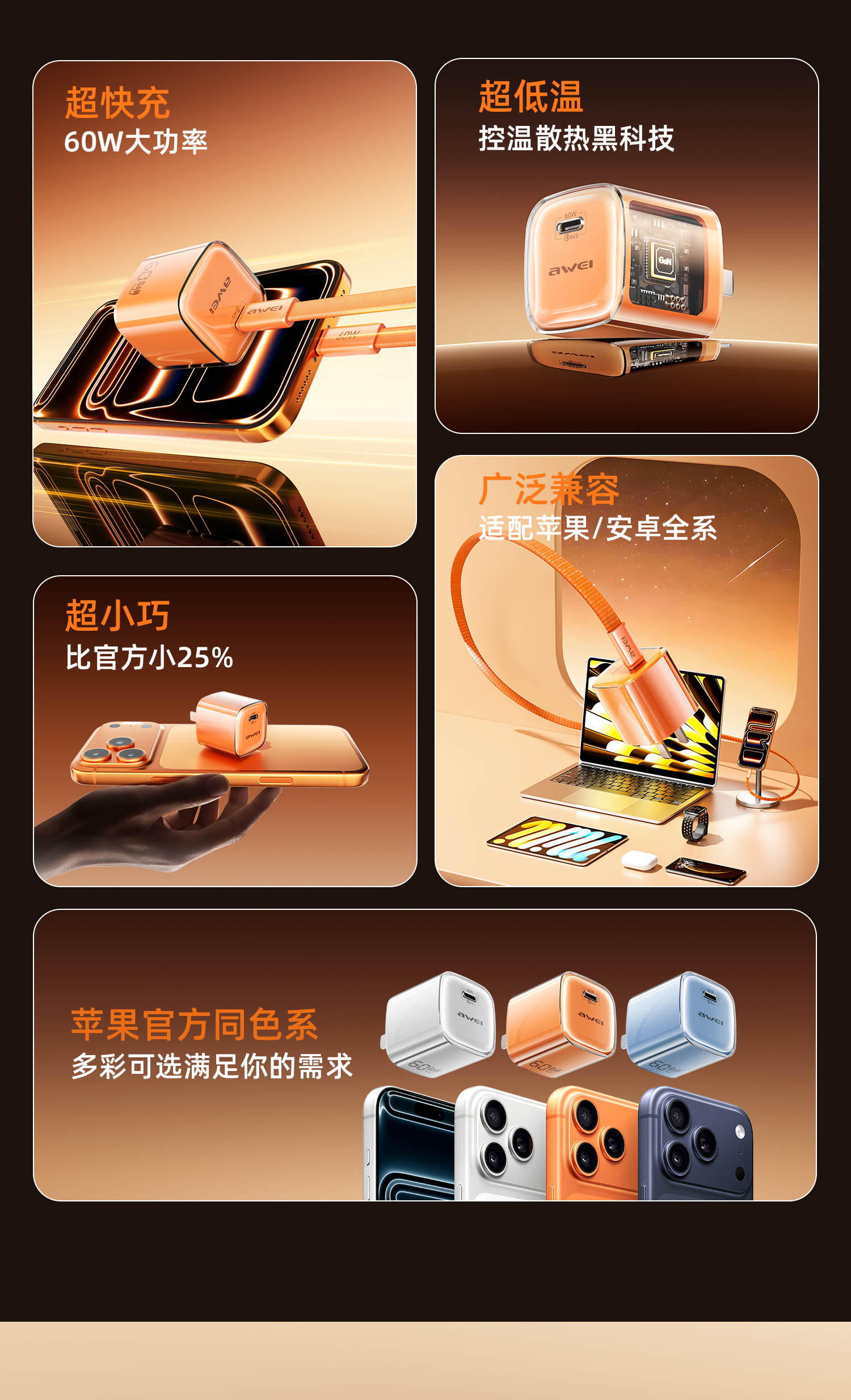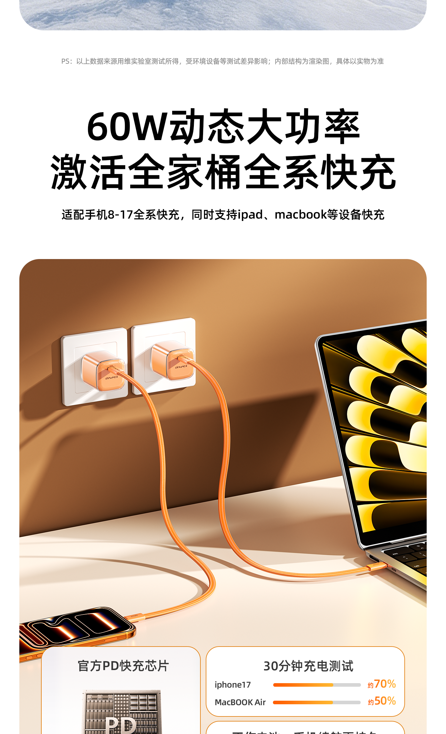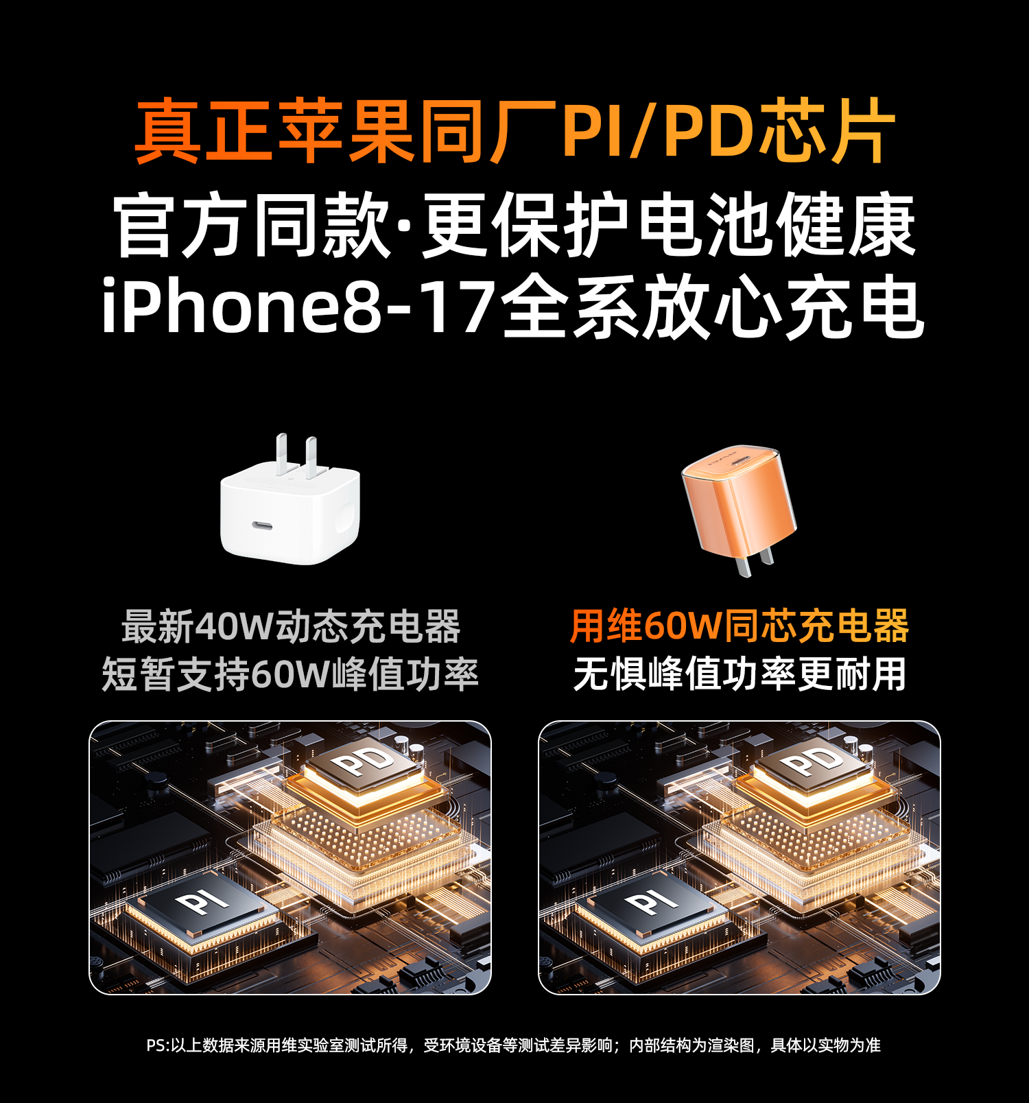 用维【iPhone17首选】新款60W充电器适用苹果新机iPhone17ProMax充电头16手机30W/45W快充PD氮化镓 【星宇橙】1m|C-C加宽编织线|60W低温闪充